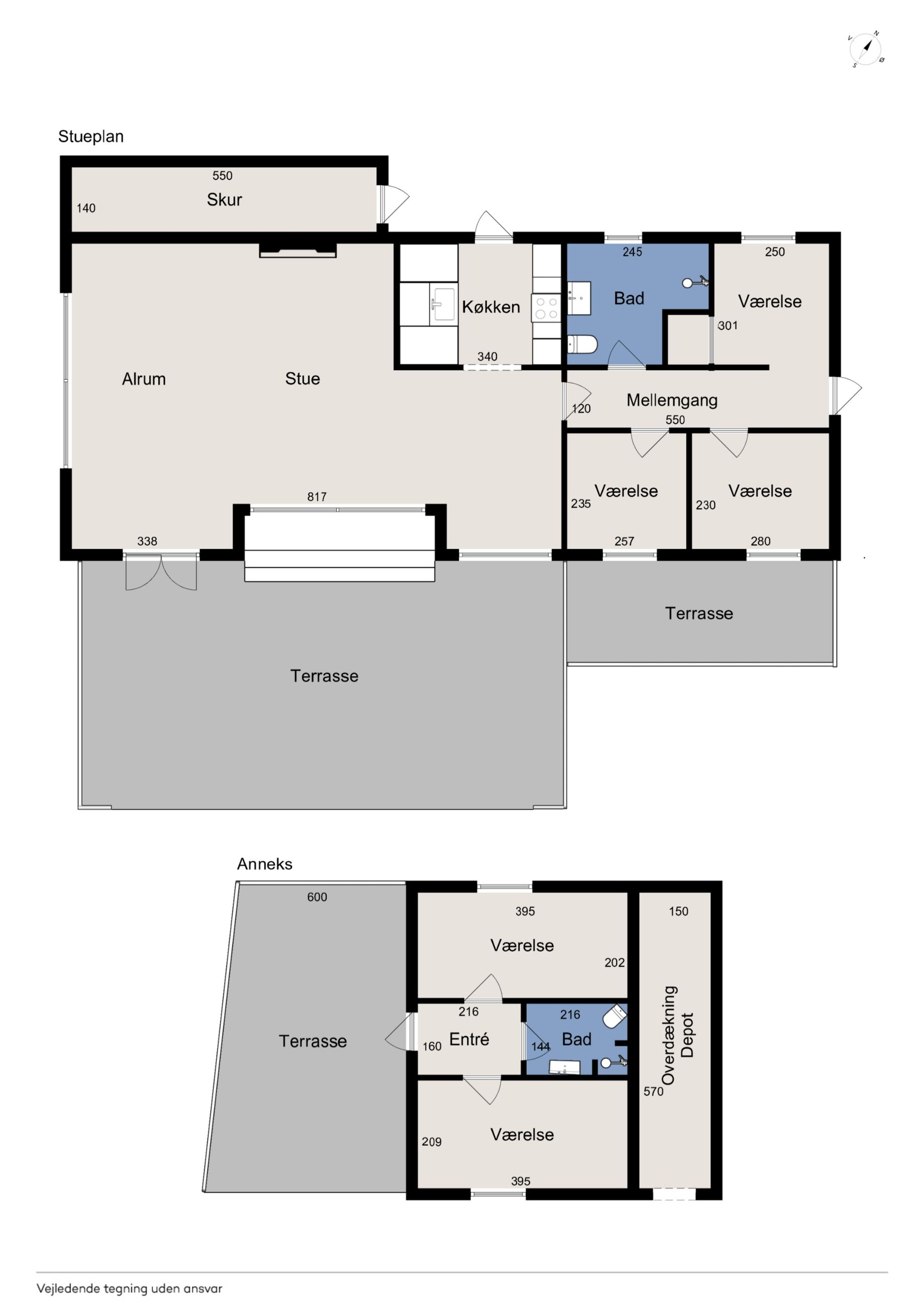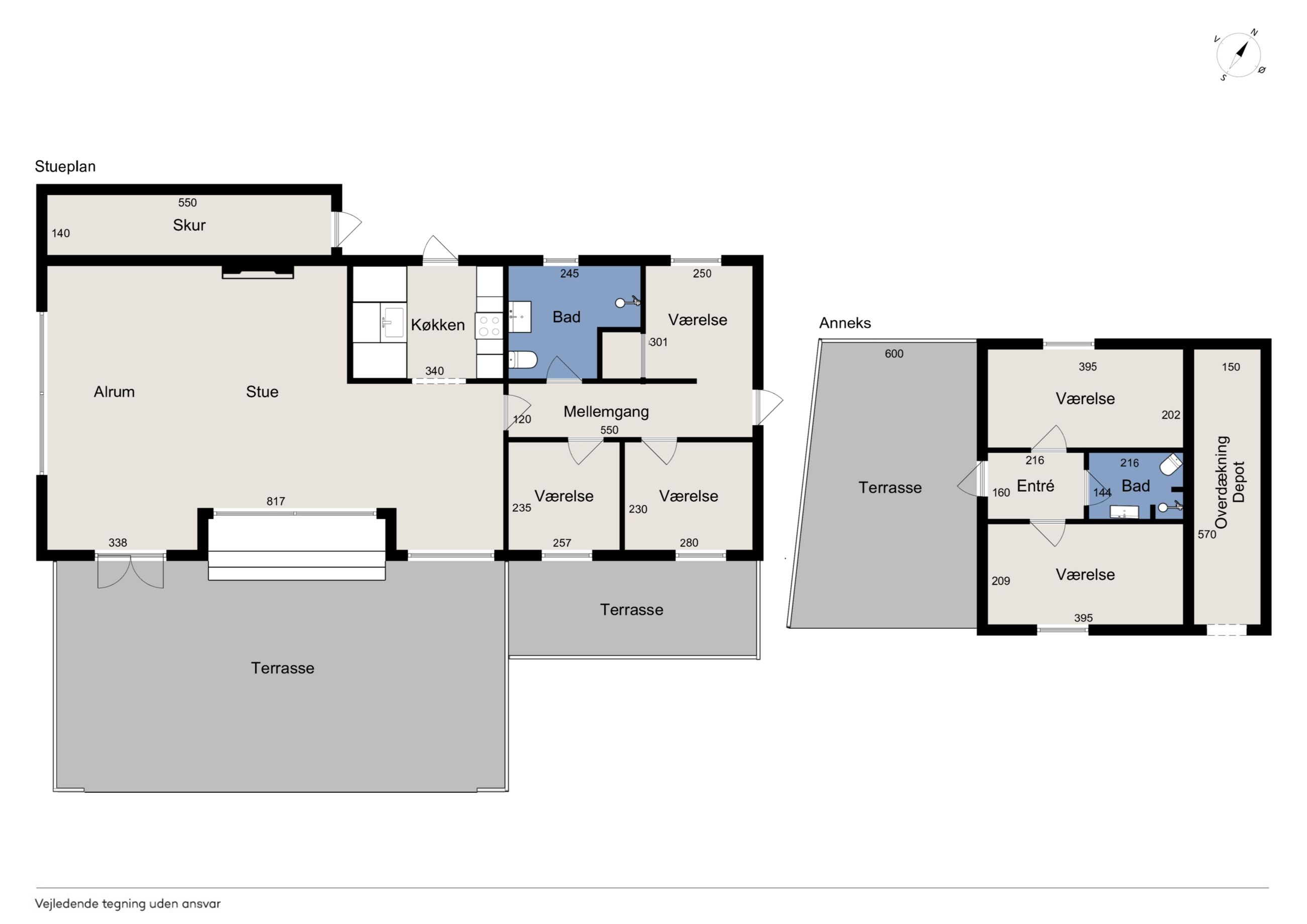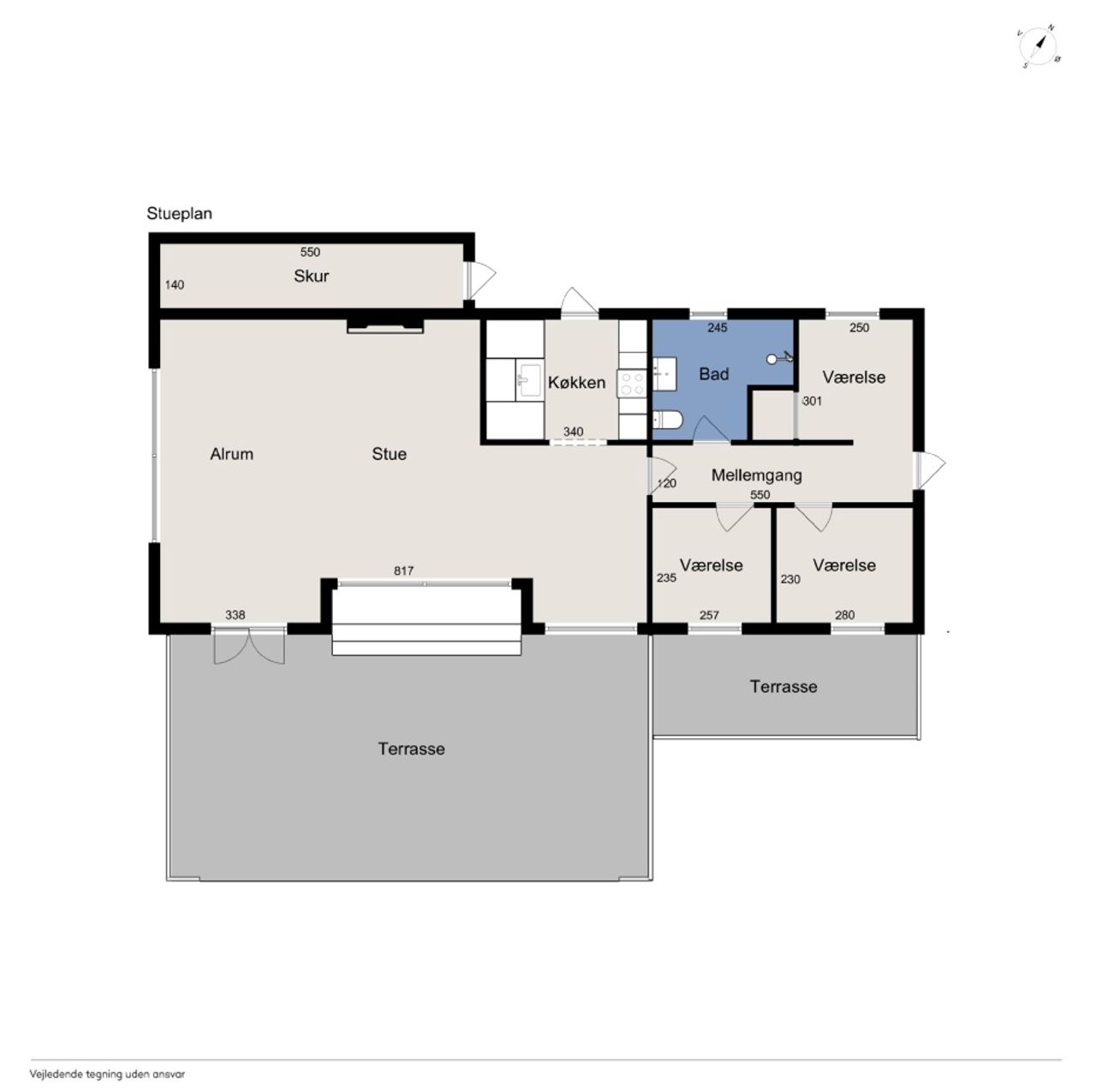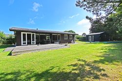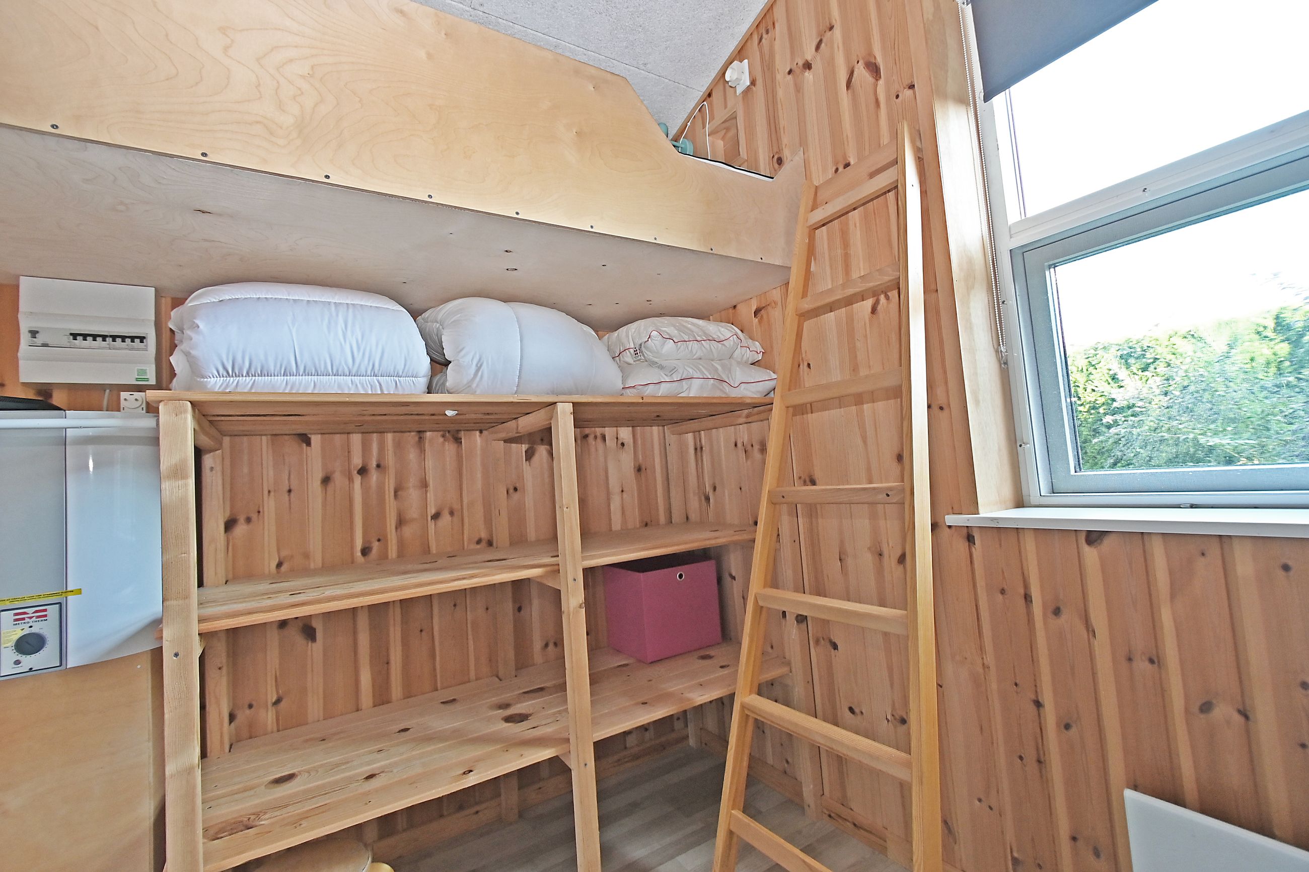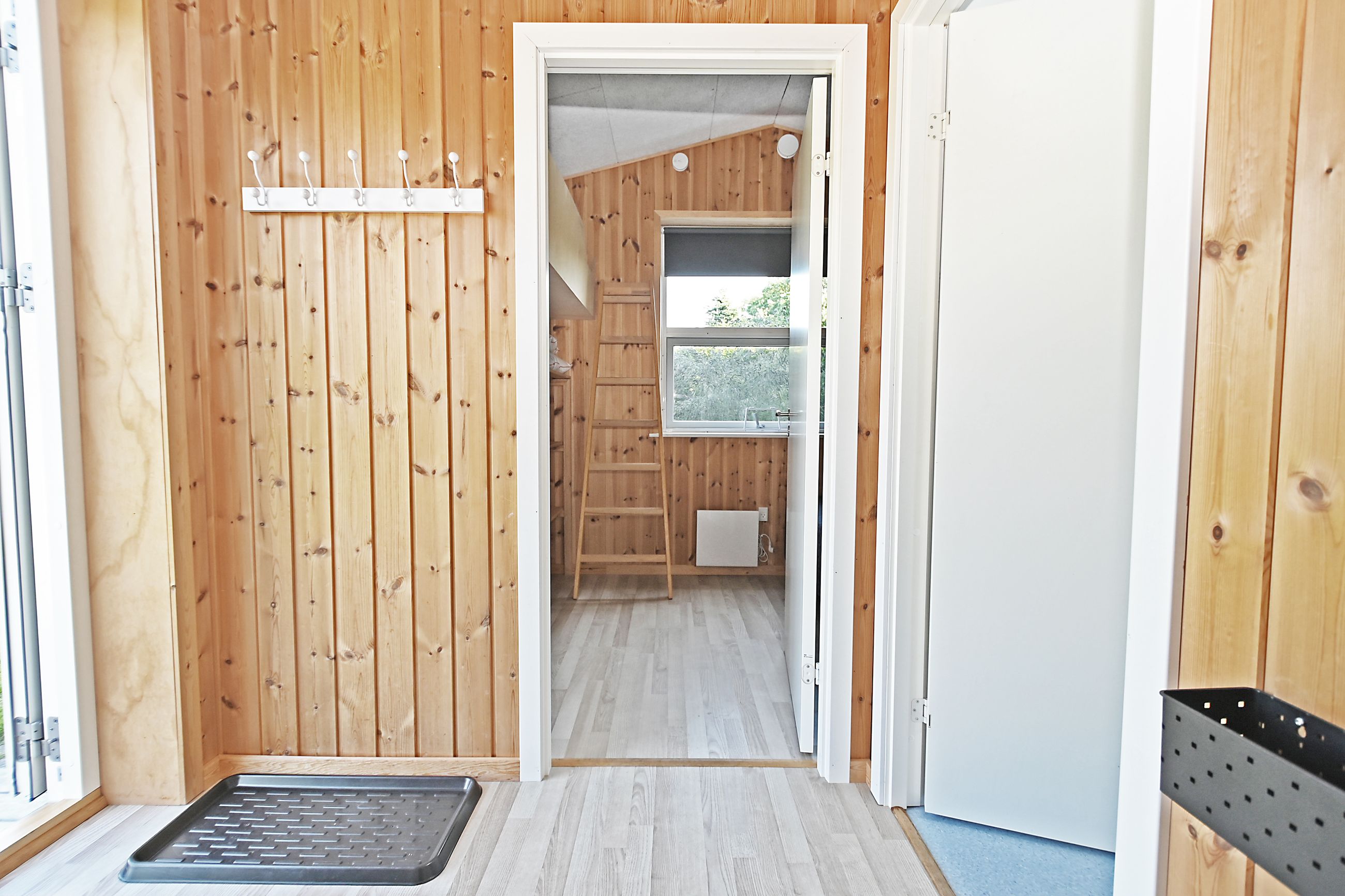 Fra køkkenet er adgang til den nordlige del af huset. Fra stuen er adgang til husets værelsesafsnit via fordelingsgang, der giver adgang til rummeligt badeværelse med bruseniche samt bademiljø. Huset rummer 3 gode værelser/køjerum, med ialt 5 sovepladser. Det ene værelse har adgang til østvendt terrasse , og fra stuen er der adgang til skøn, sydvendt træterrasse på ca + 30 m2.