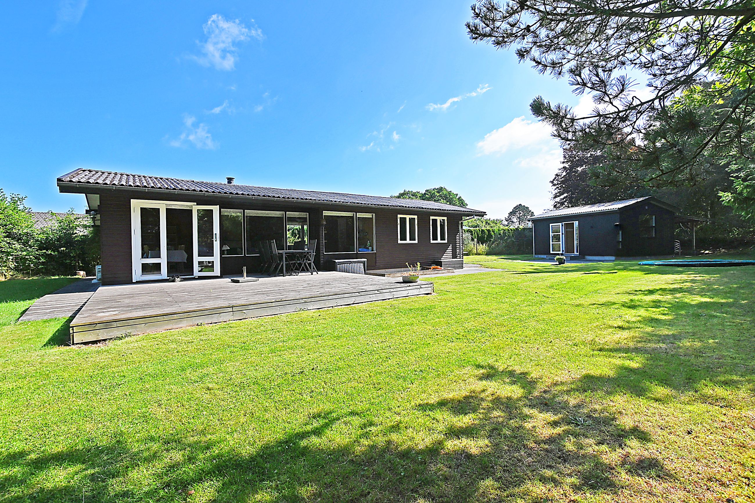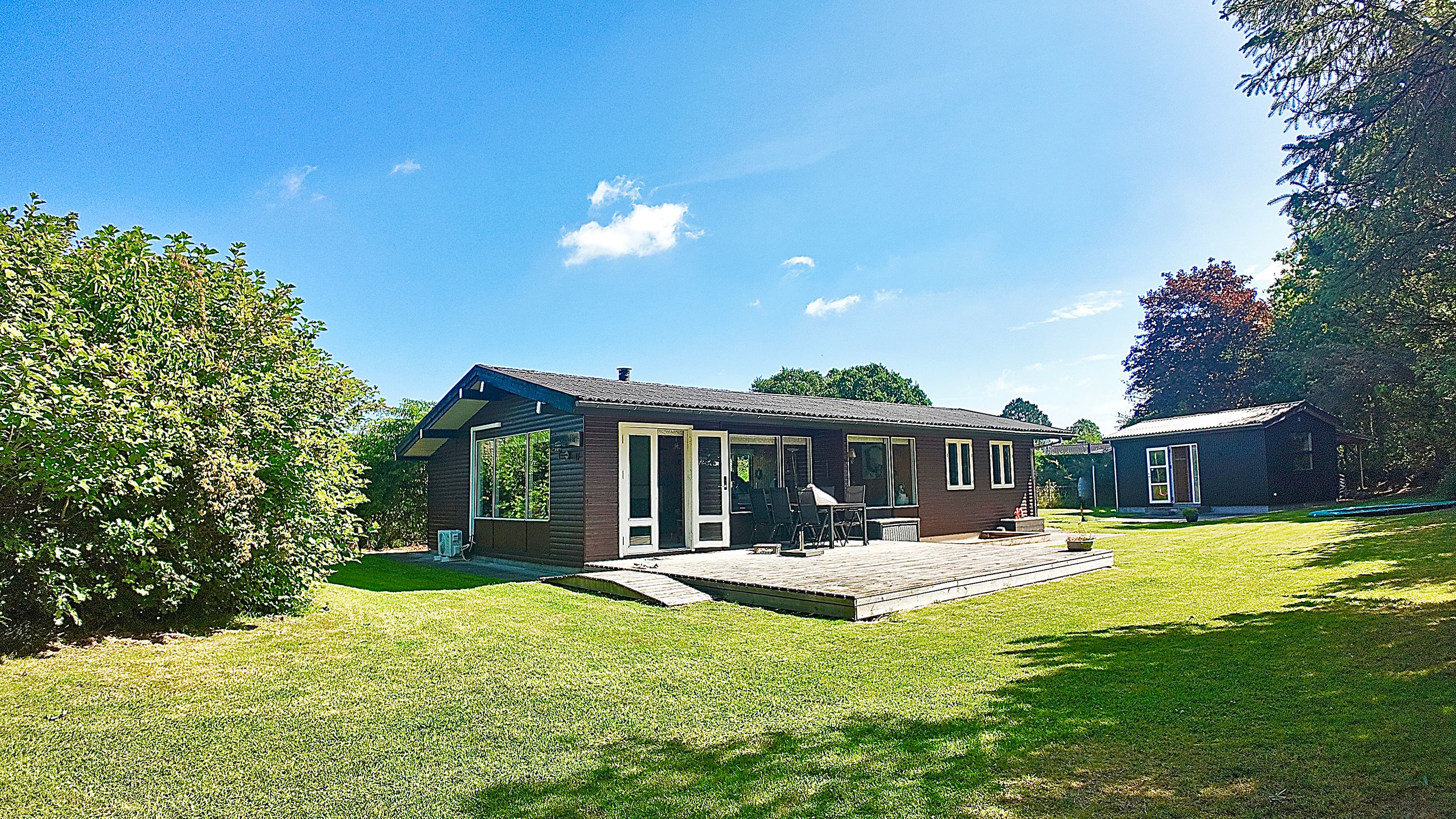 Primært hus. : Indgang fra den ca 30 m2 sydvendte træterrasse .