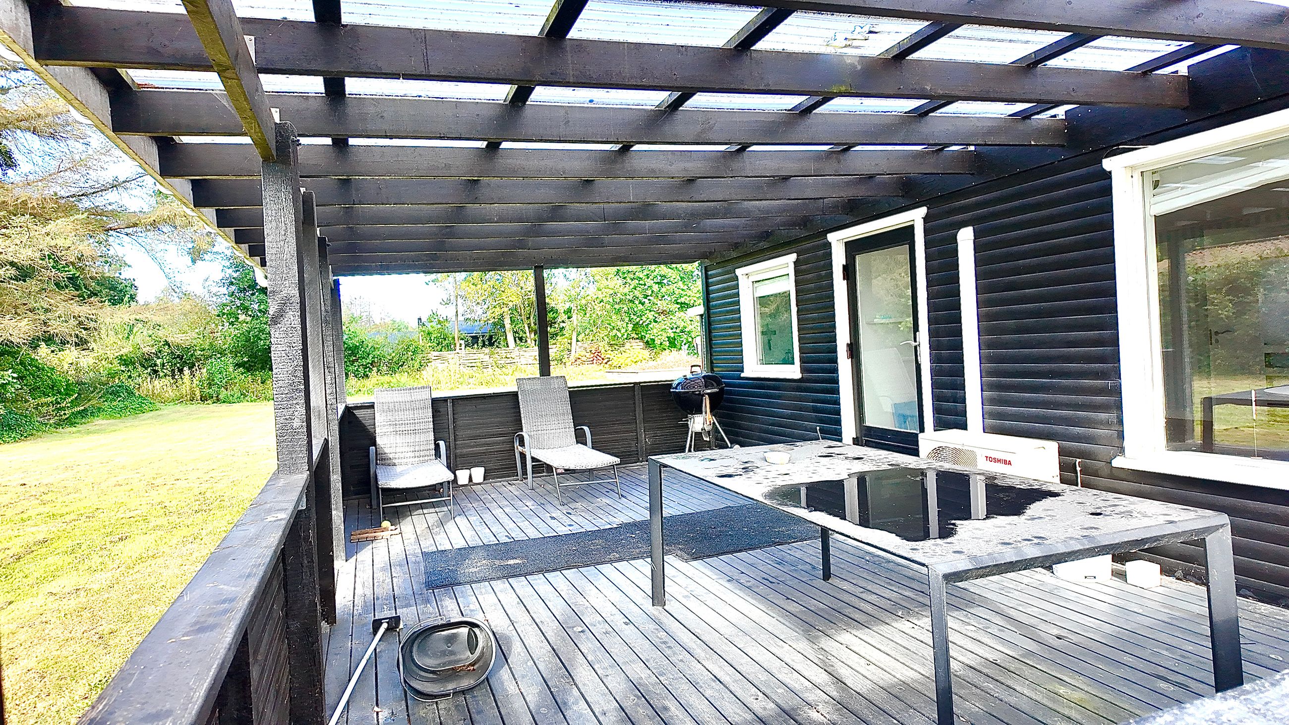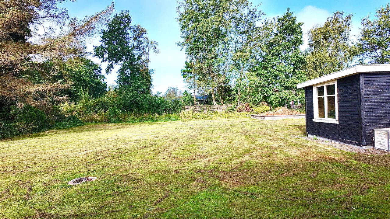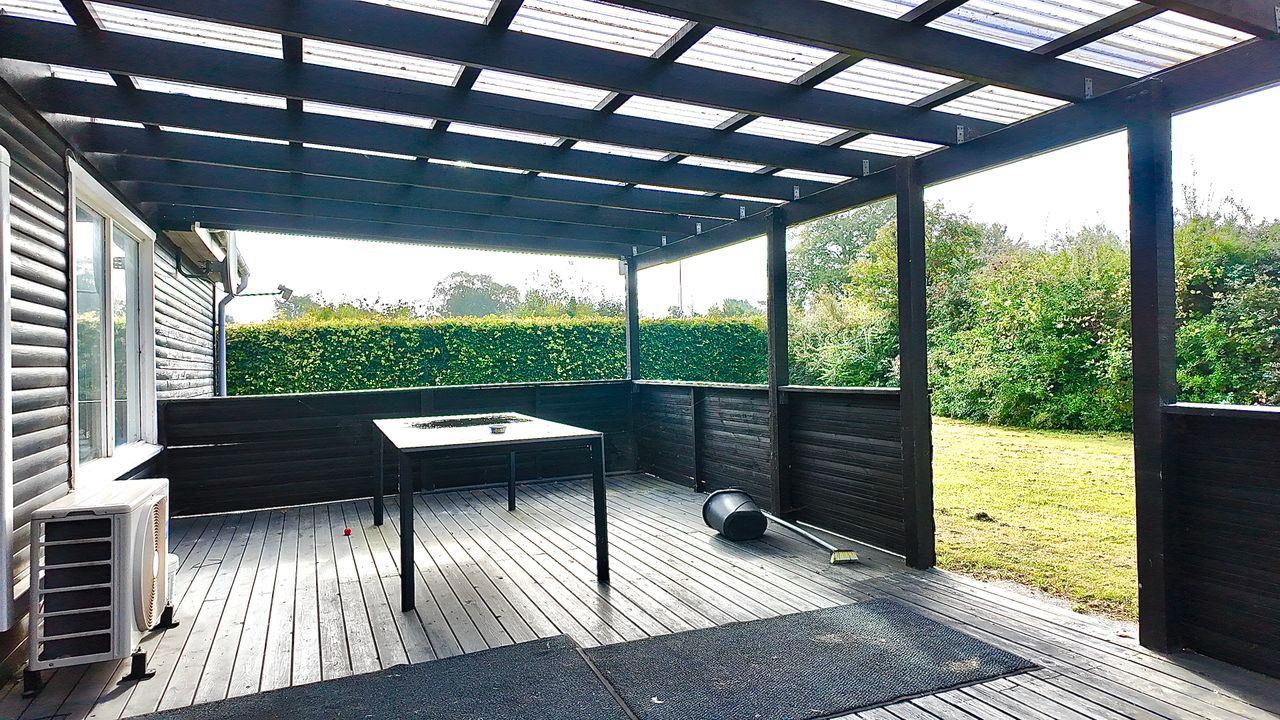 Fra stuen er adgang til stor sydvendt terrasse der er overdækket med klare plader. Til huset hører garage med udhus. Stor lukket grund, omkranset af hæk, hvorved man færdes ugenert. Det er et ældre klassisk hus hvor der må påregnes renovering på flere punkter.