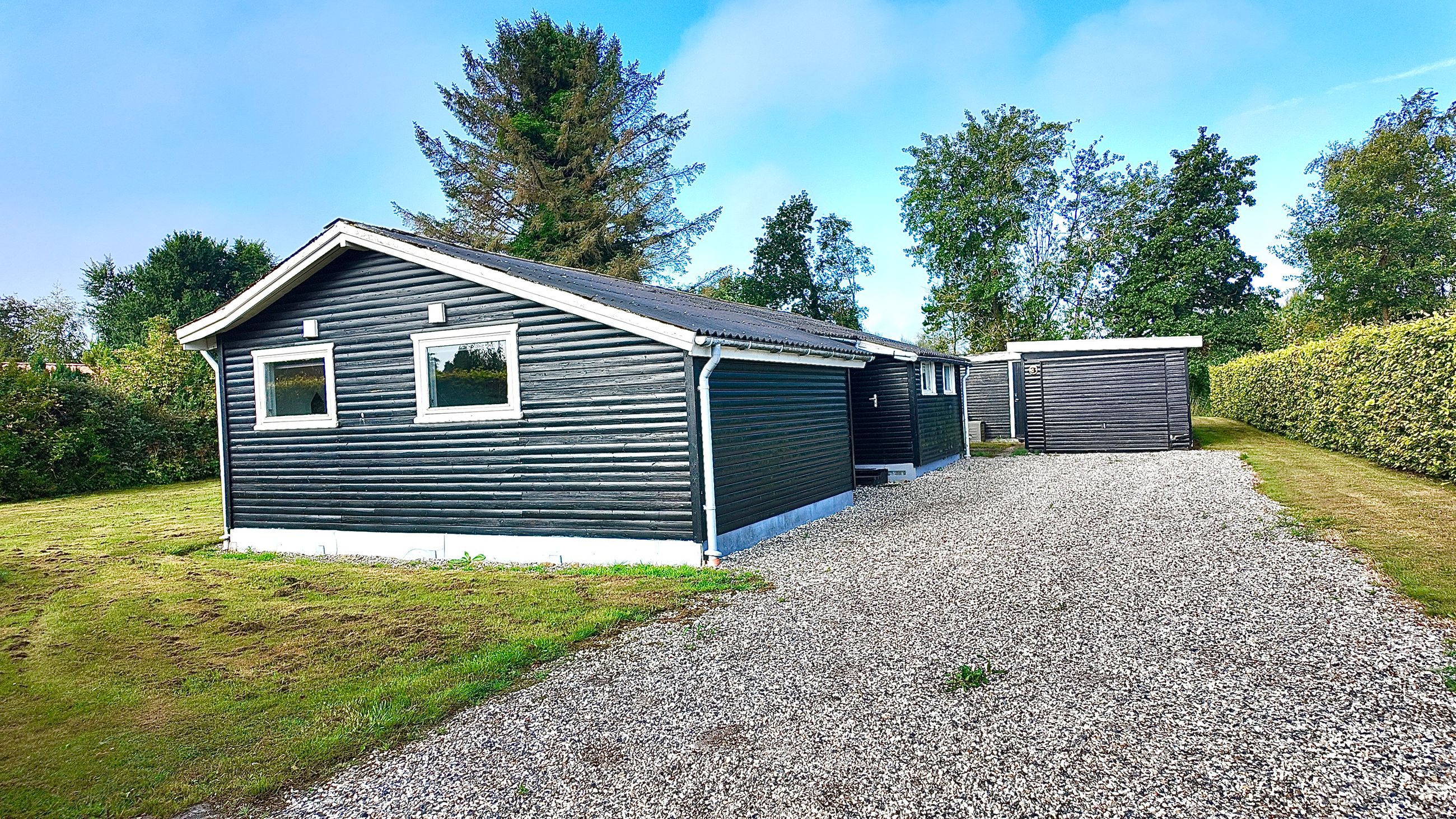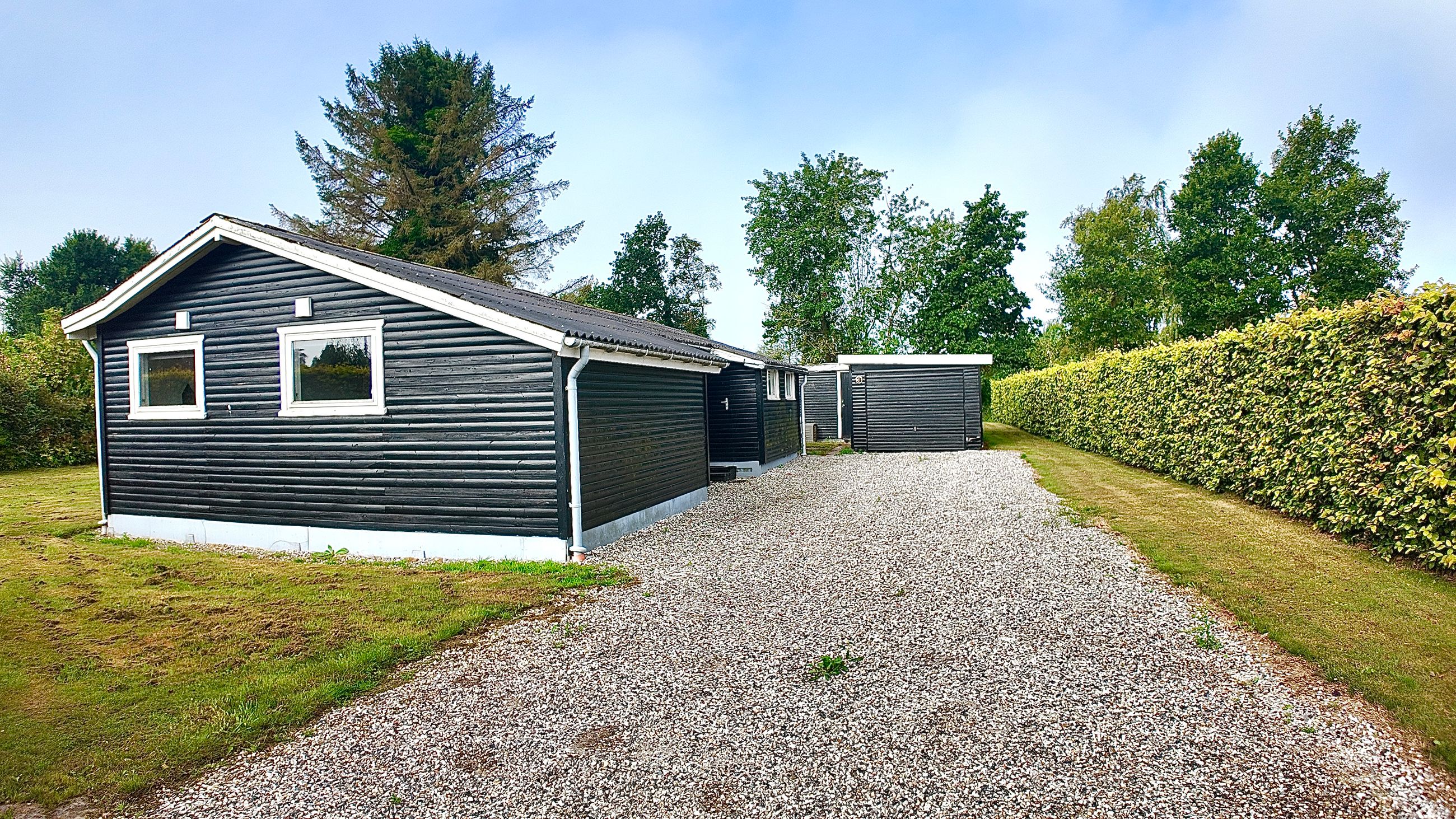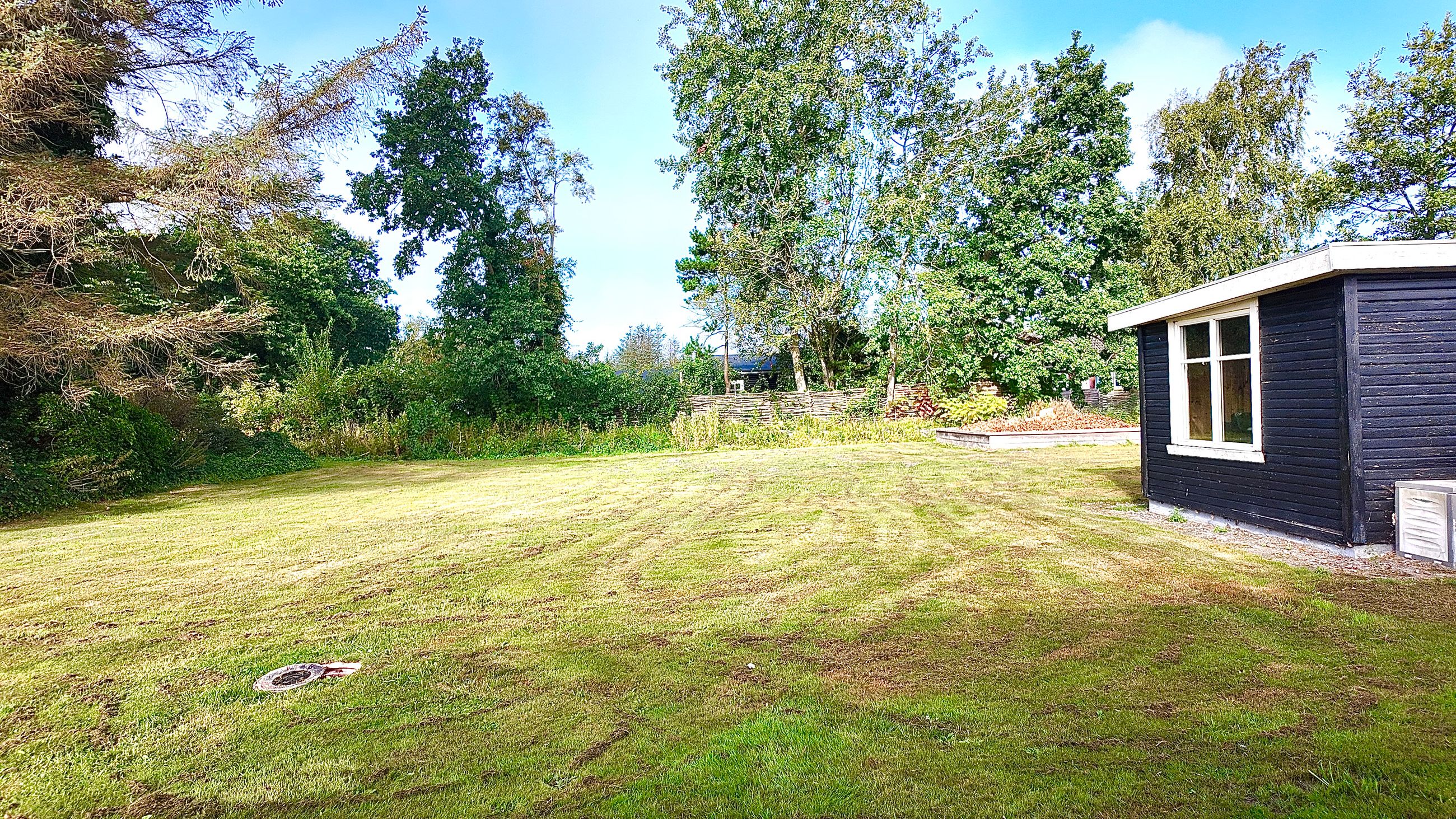 Fra stuen er adgang til stor sydvendt terrasse der er overdækket med klare plader. Til huset hører garage med udhus. Stor lukket grund, omkranset af hæk, hvorved man færdes ugenert. Det er et ældre klassisk hus hvor der må påregnes renovering på flere punkter.