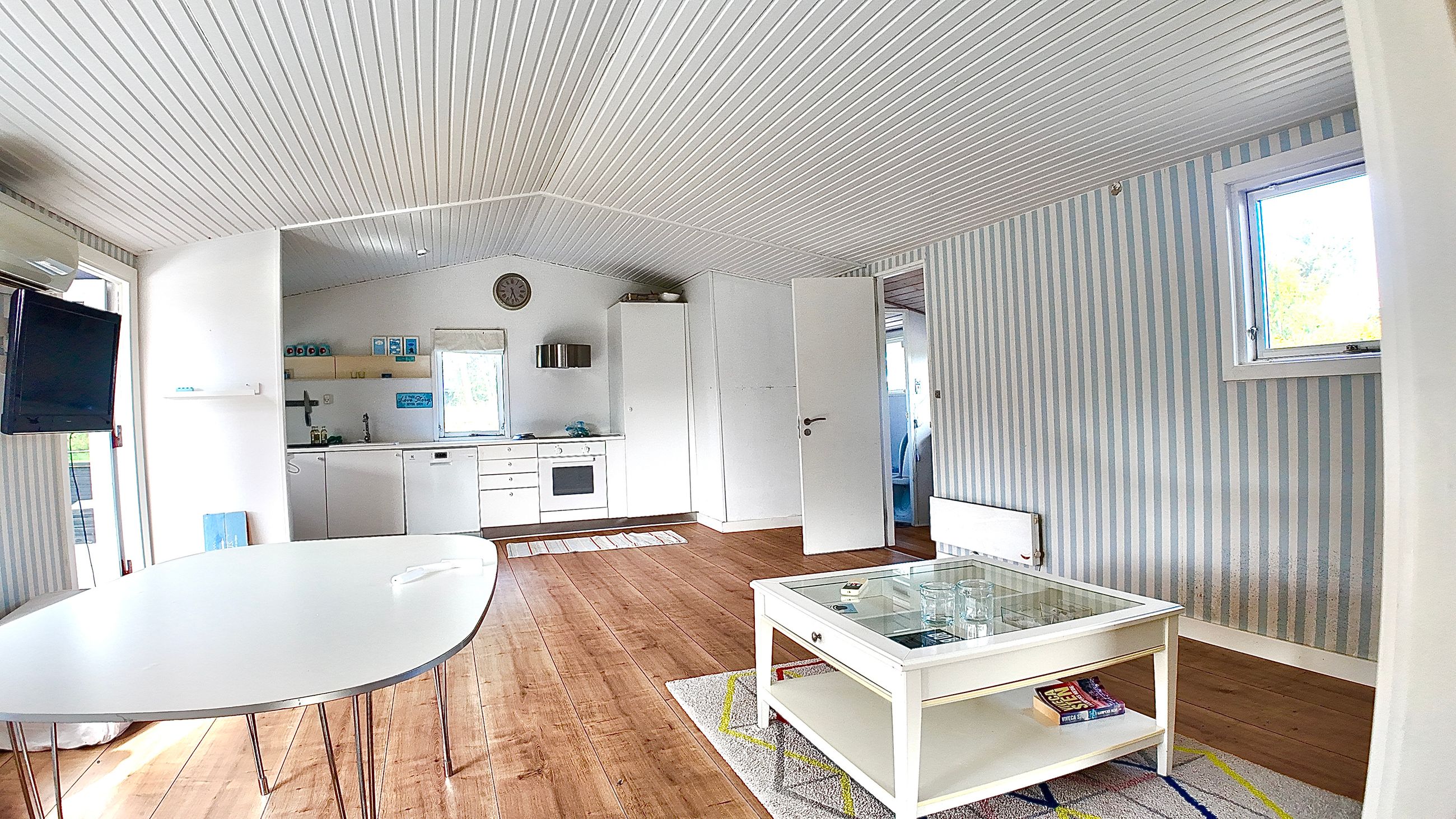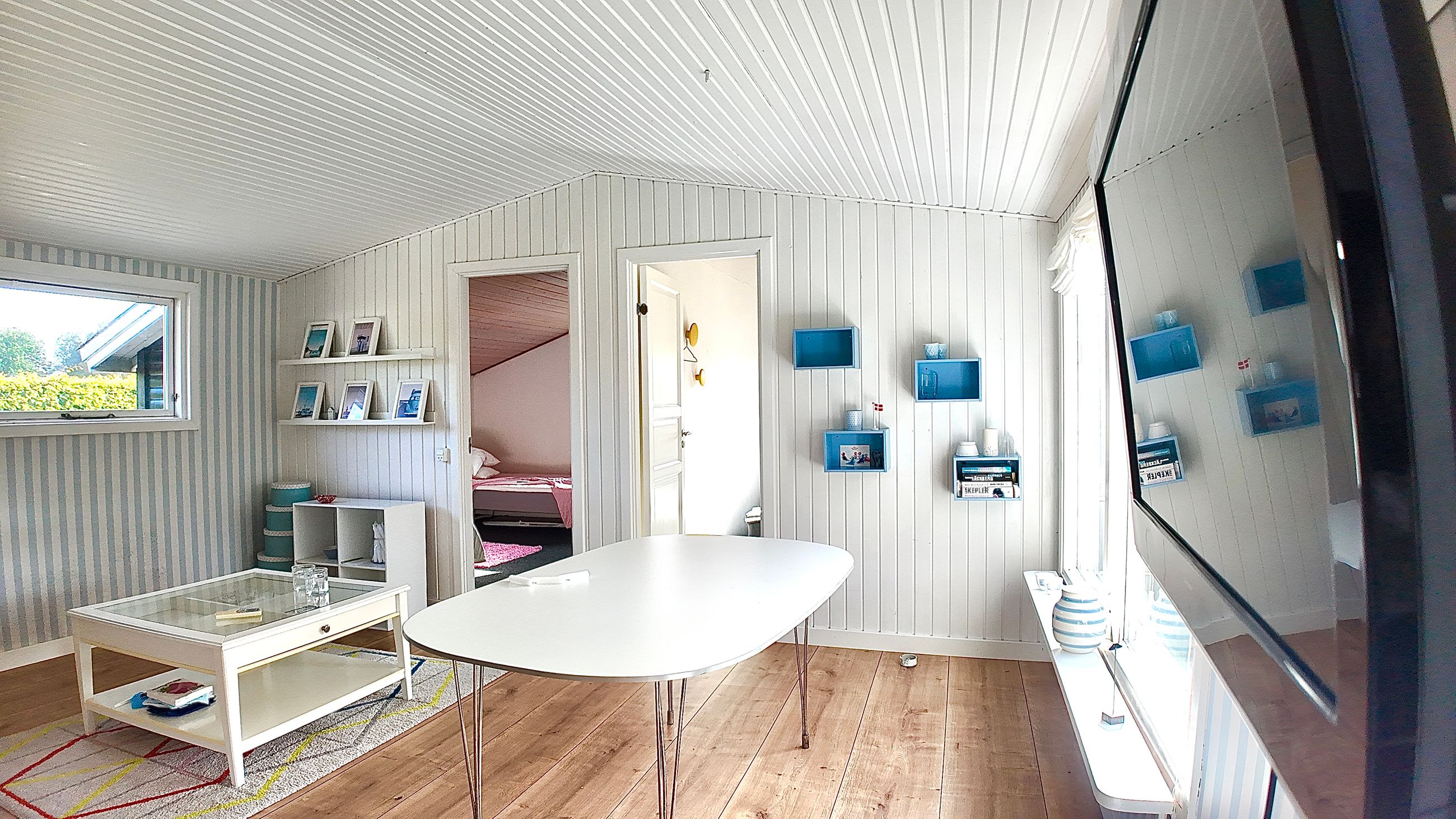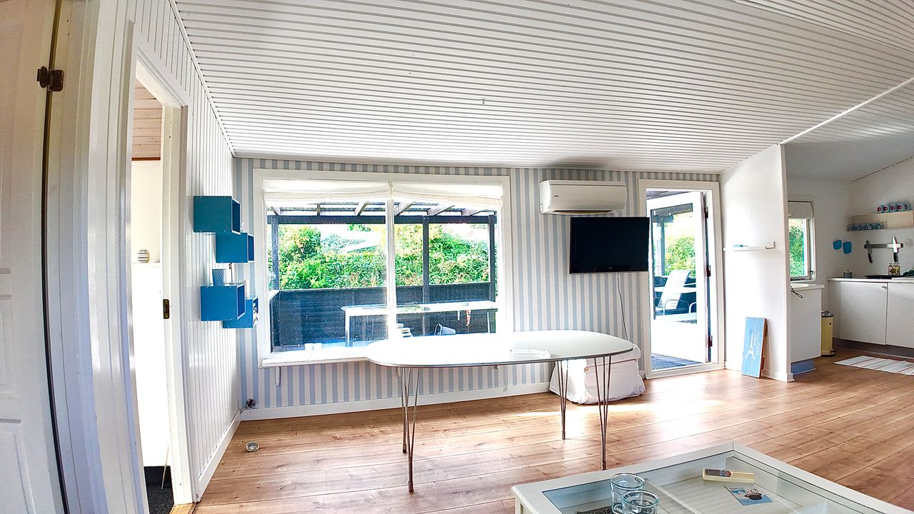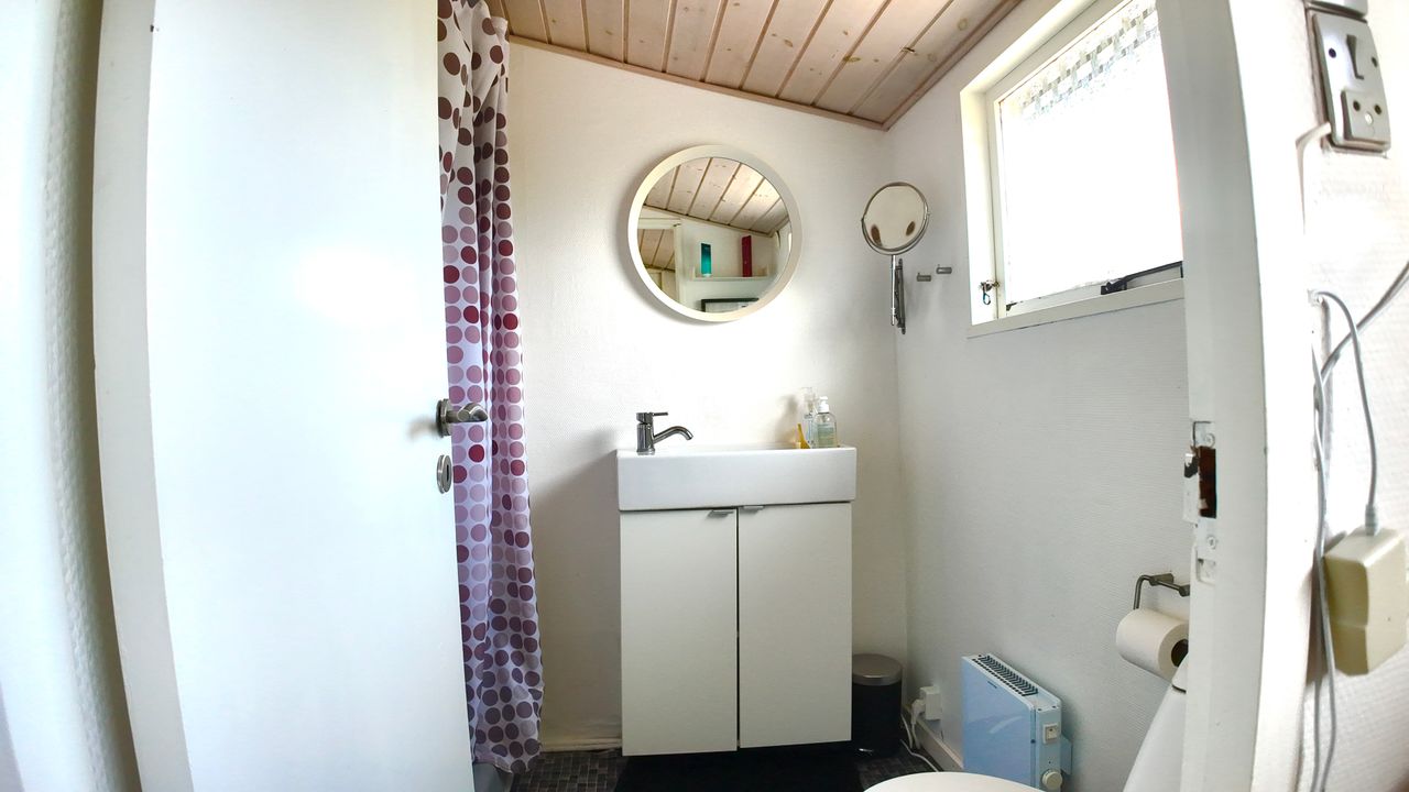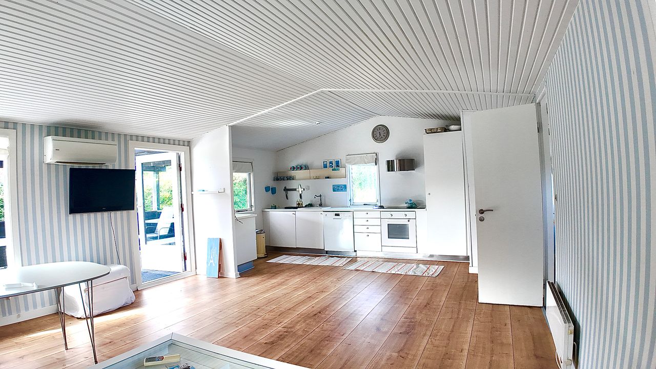 Lille entre, med adgang til badeværelse med lyst interør , bademiljø samt rummelig bruseniche. Fra entre er adgang til husets store stue , der er kombineret med åbent køkkenafsnit. Særdeles rummelig stue med både opholds - og spiseafdeling. Fra stuen er adgang til 2 store værelser. ( Gulve i værelser skal undersøges for ujævnheder) Huset køkkenafsnit er ved vestgavl og fremstår med lyse elementer. Huset opvarmes via Elpaneler og Luft/Luft varmepumpe.