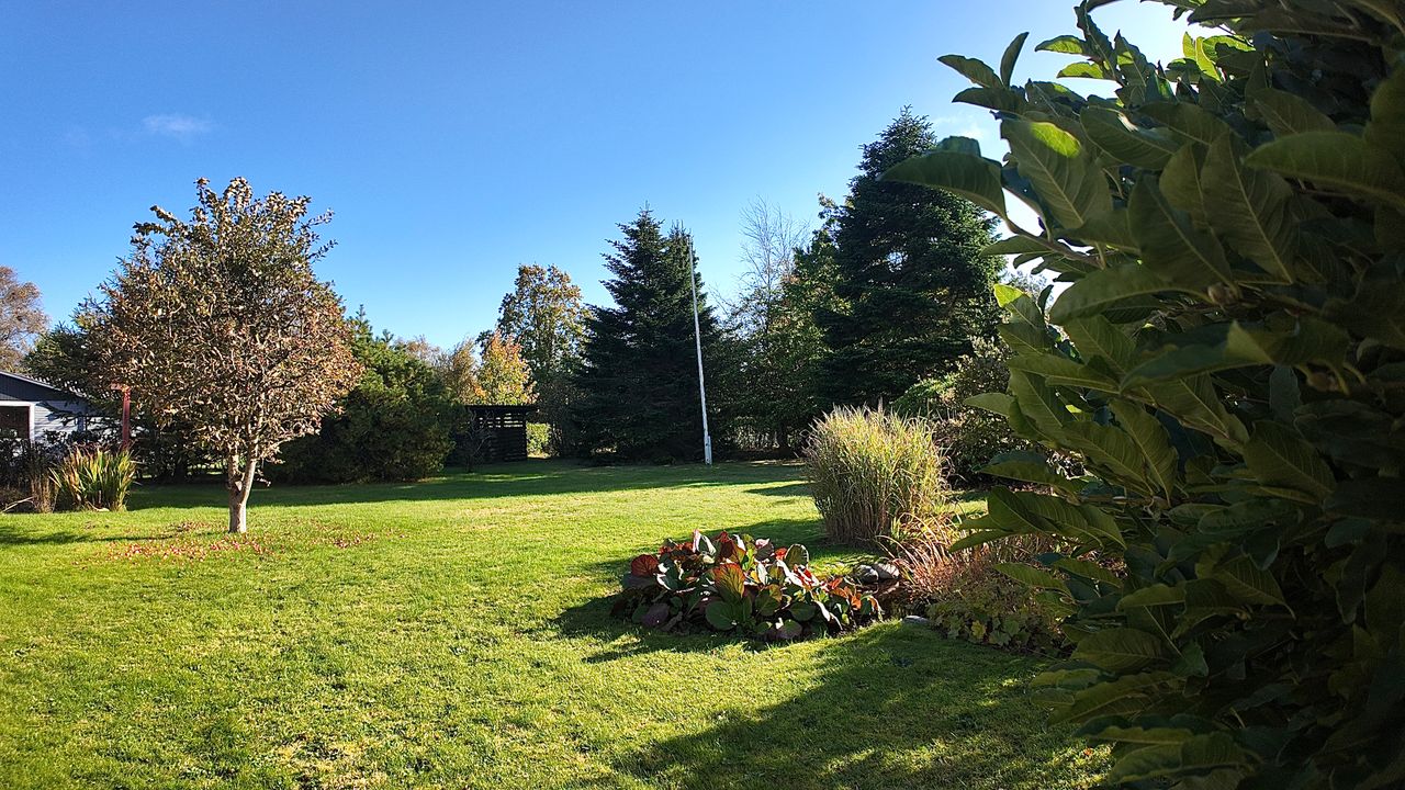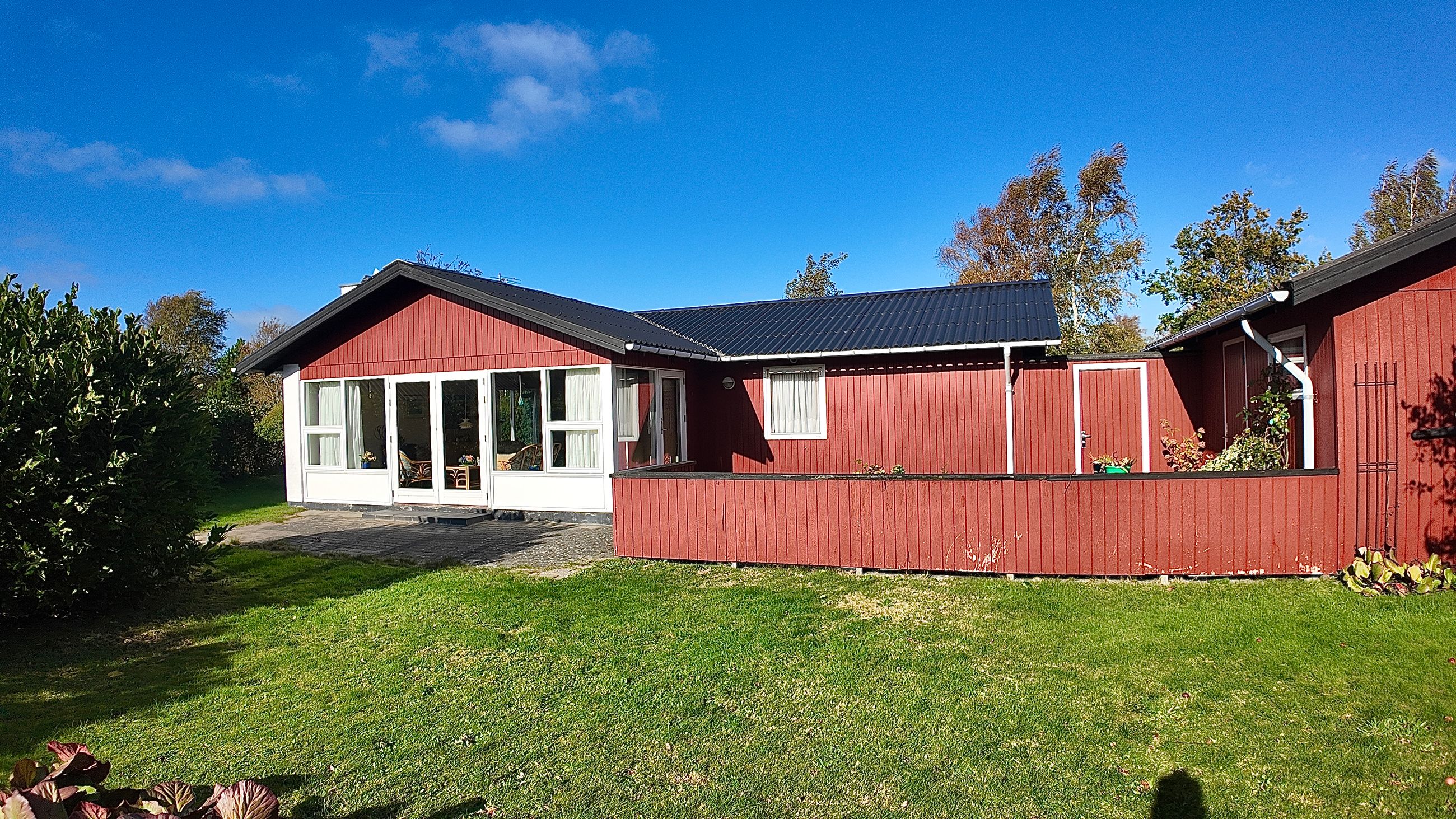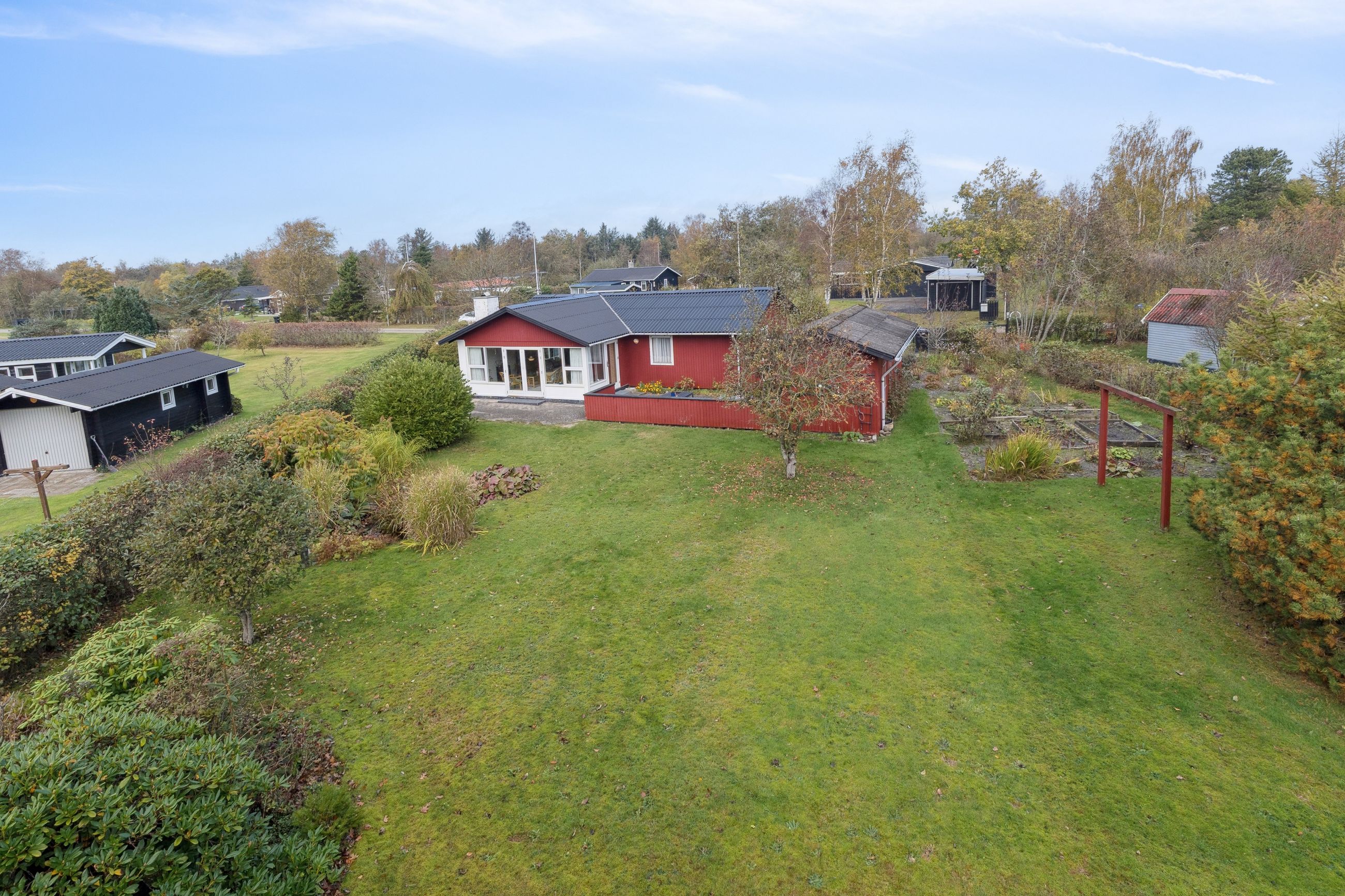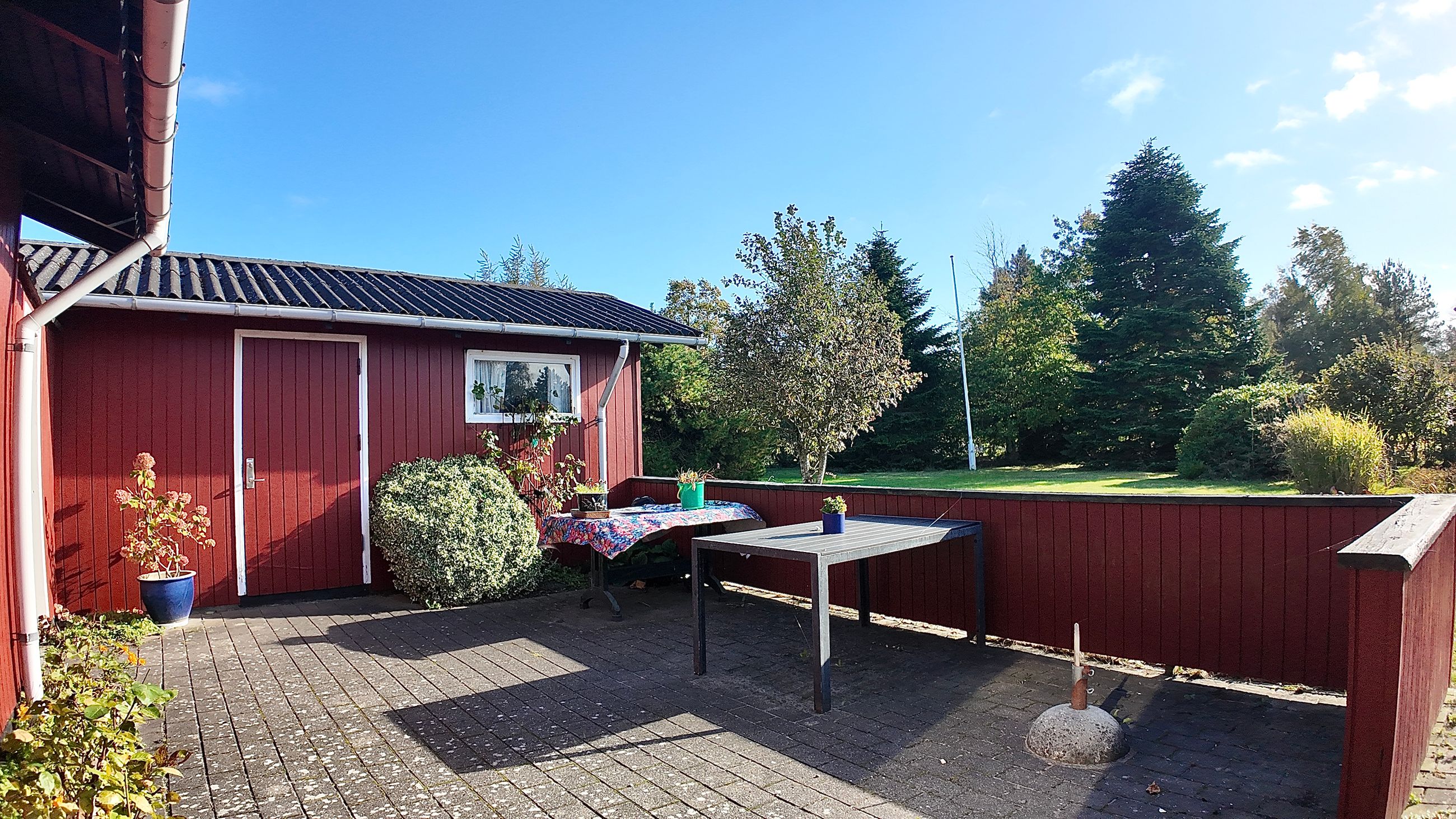 Husets grundareal er hele 1.390 m2 og henligger med flot haveanlæg med høj bevoksning rundt skel og man kan færdes ugenert på ejendommen. Stor sydvendt terrasse der forbinder hus og garage.