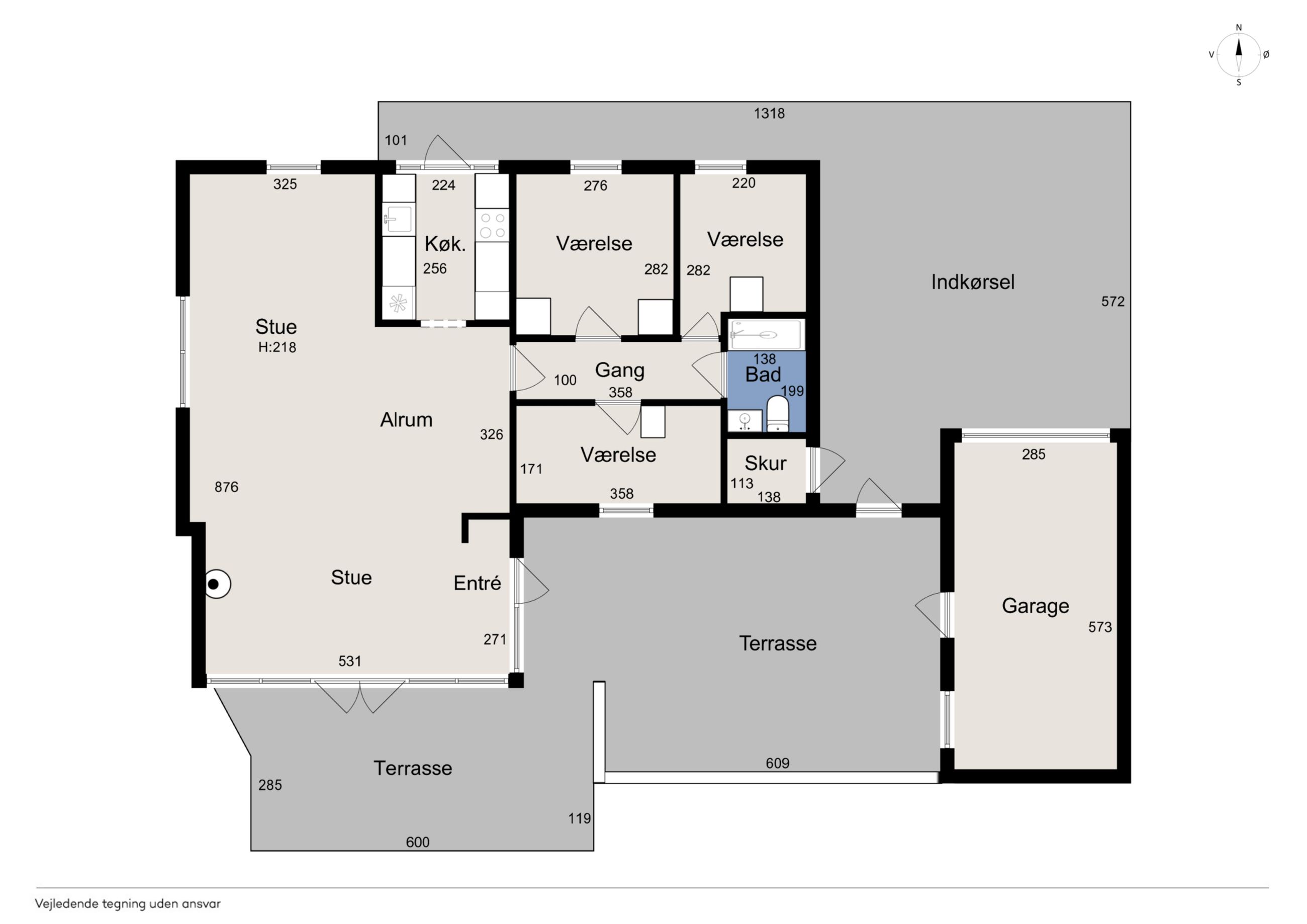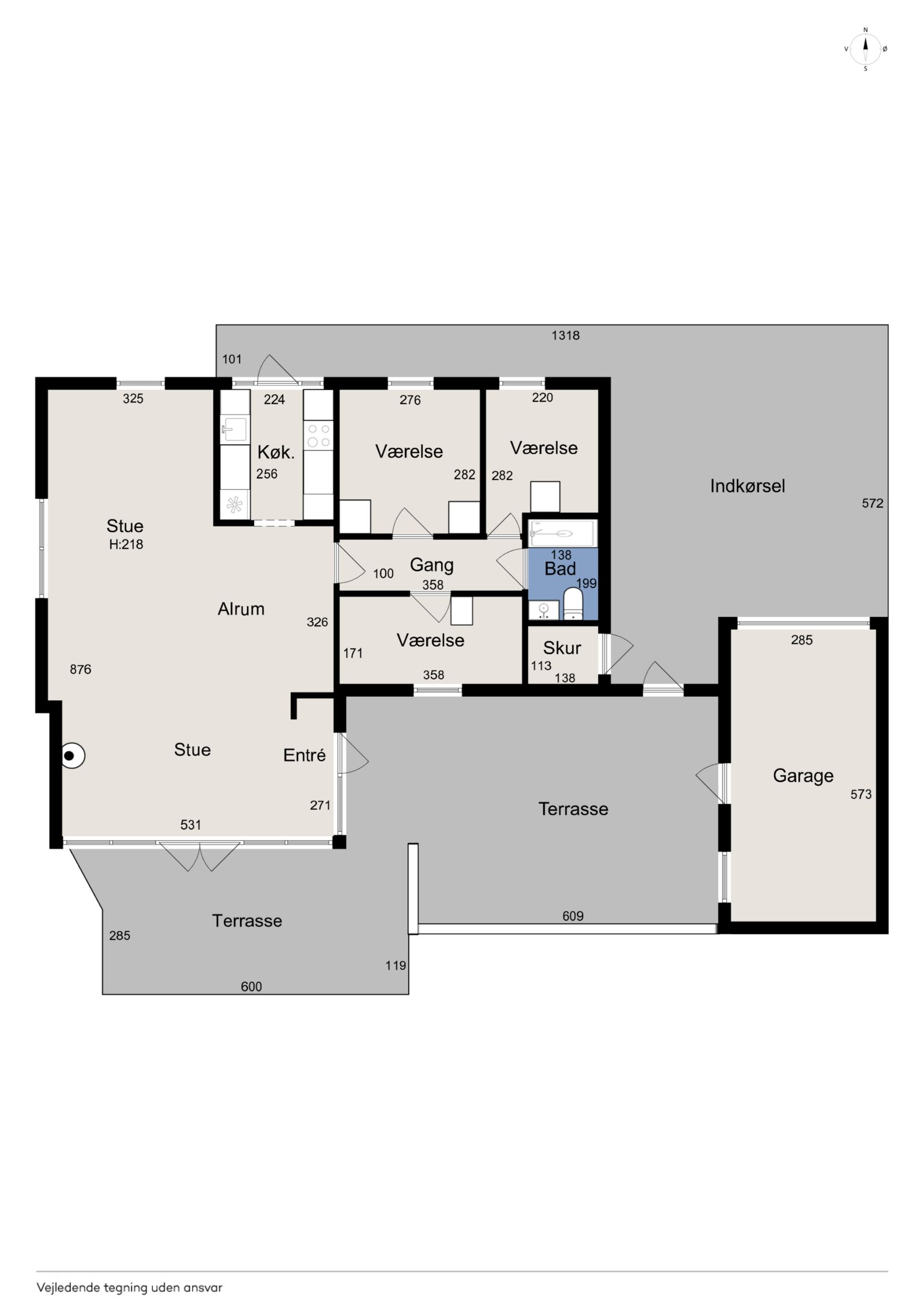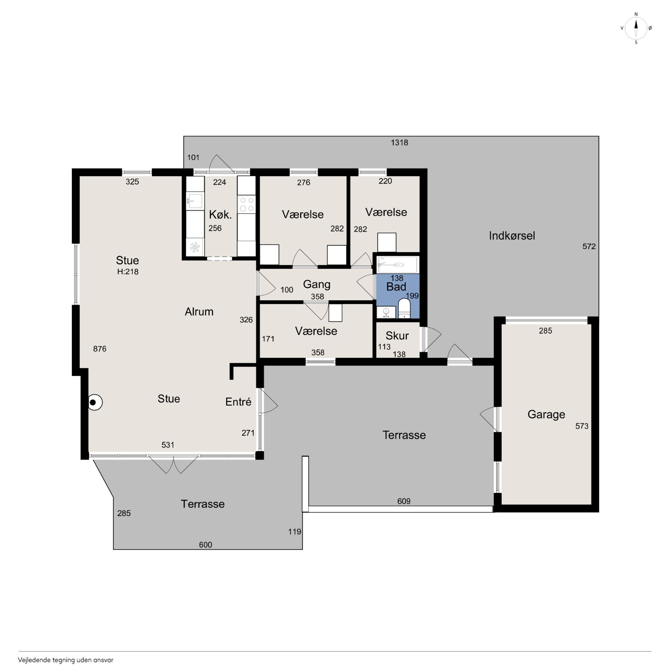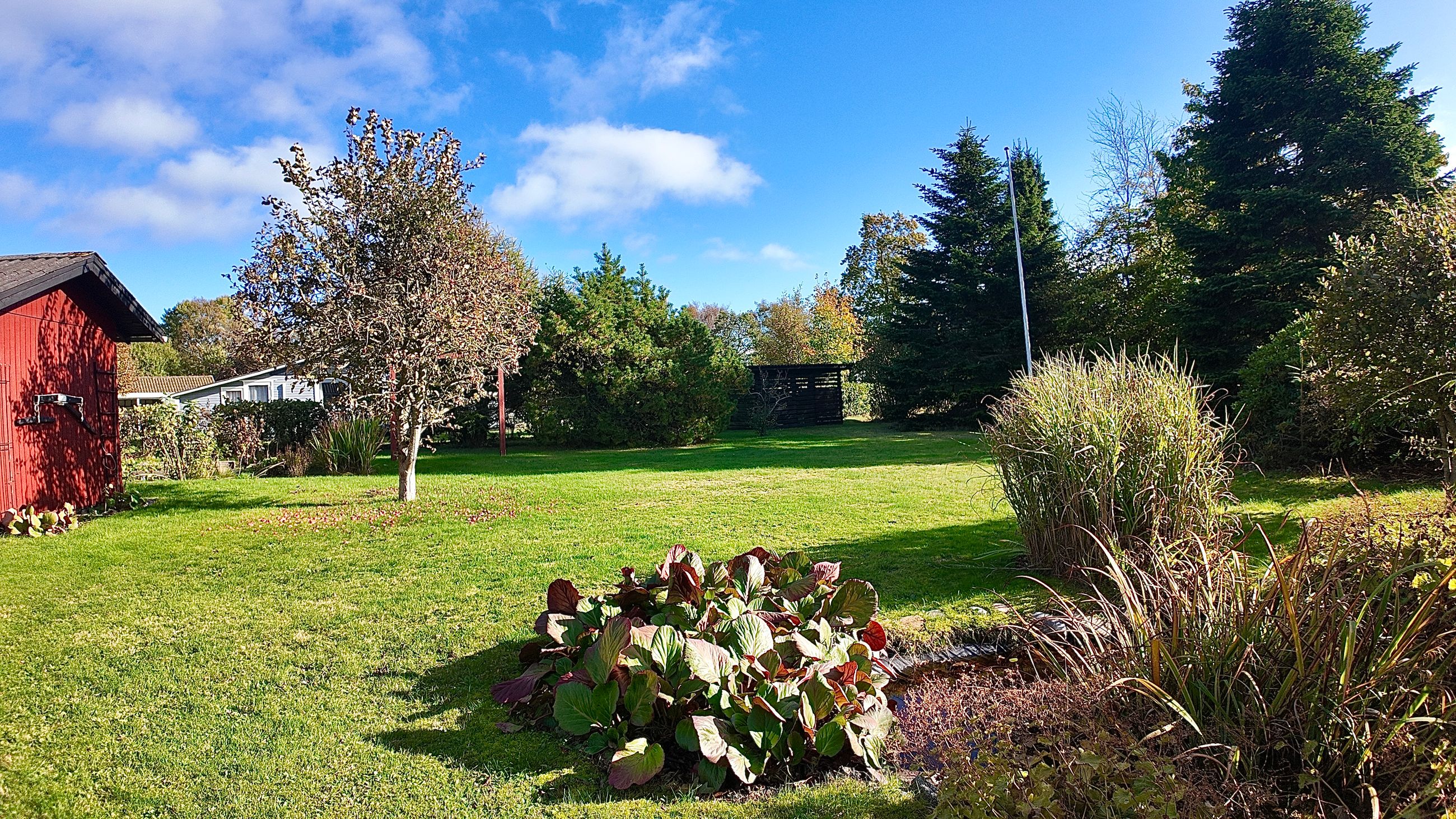 Husets grundareal er hele 1.390 m2 og henligger med flot haveanlæg med høj bevoksning rundt skel og man kan færdes ugenert på ejendommen. Stor sydvendt terrasse der forbinder hus og garage.