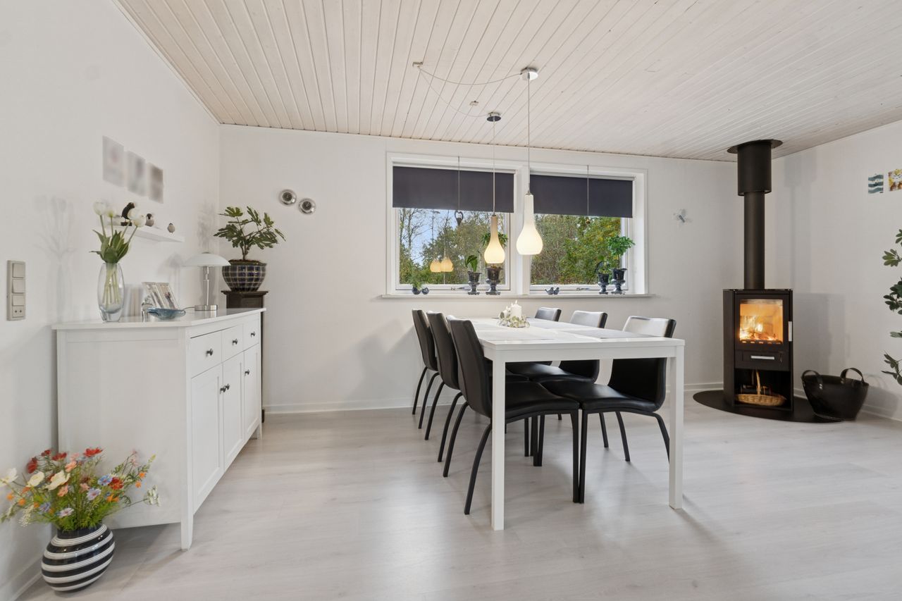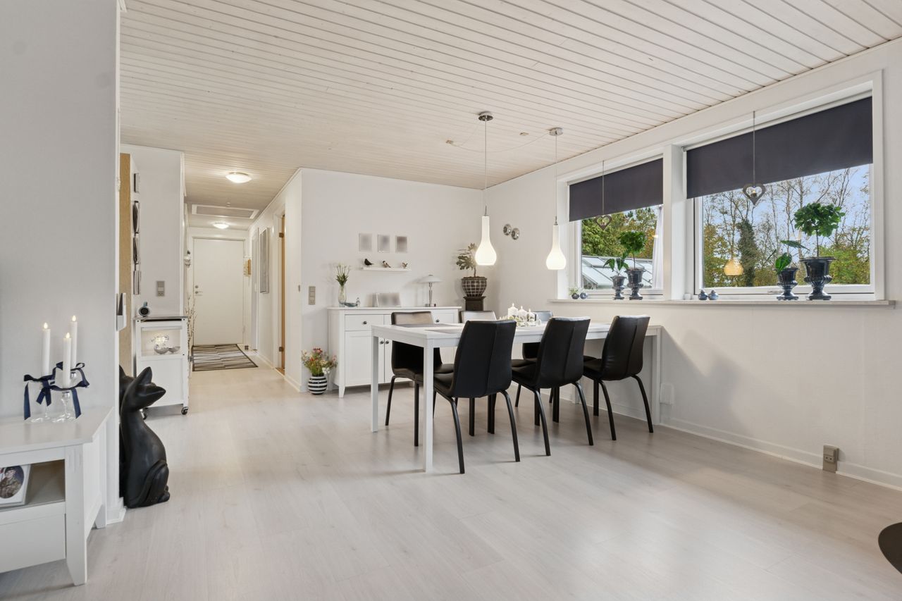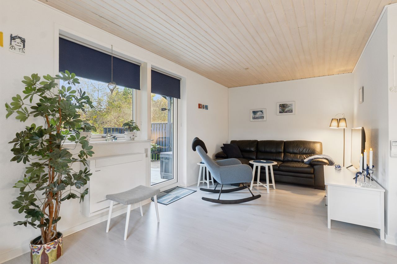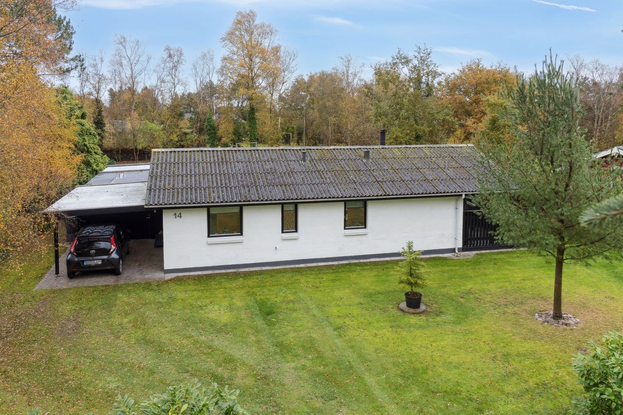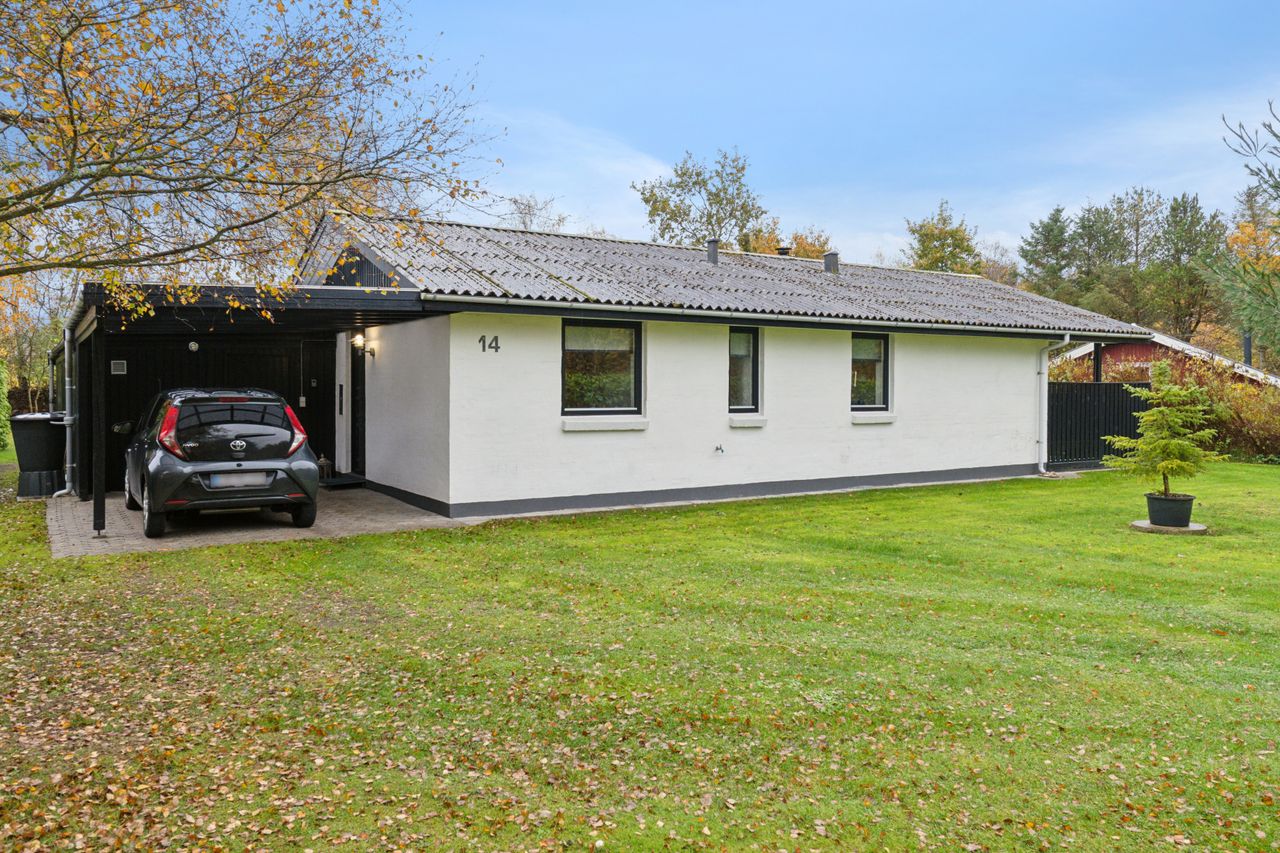 Velkommen indenfor via god overdækning, der fungerer som carport til god fordelingsgang og en fin planløsning. 3 gode værelser. Rummeligt og lyst badeværelse med bruseniche, bademiljø samt installeret vaskemaskine. Godt og praktisk køkken i forbindelse med den rummelige stue der fremstår lys og venlig. Fra stuen er udgang til god overdækket terrasse mod vest. Desuden findes stor træterrasse mod havesiden mod syd. Boligen opvarmes via varmepumpe årg 2024 samt Brændeovn årg 2023.