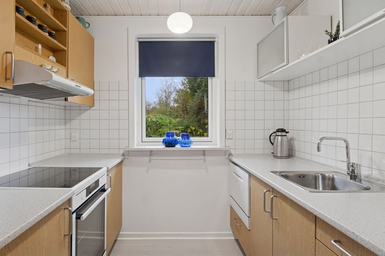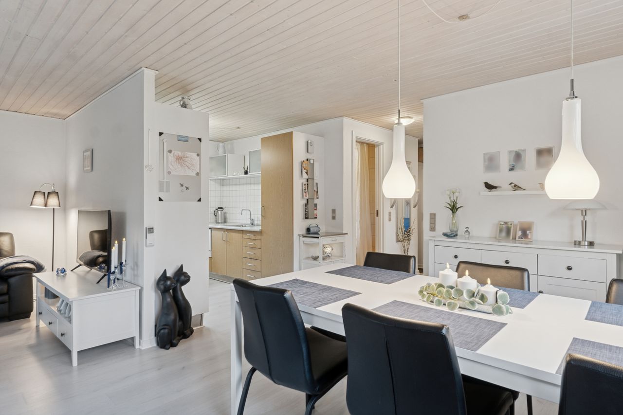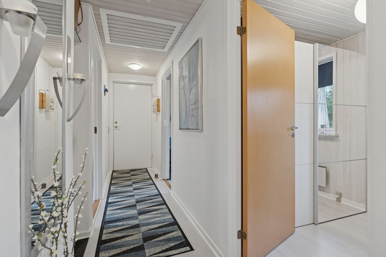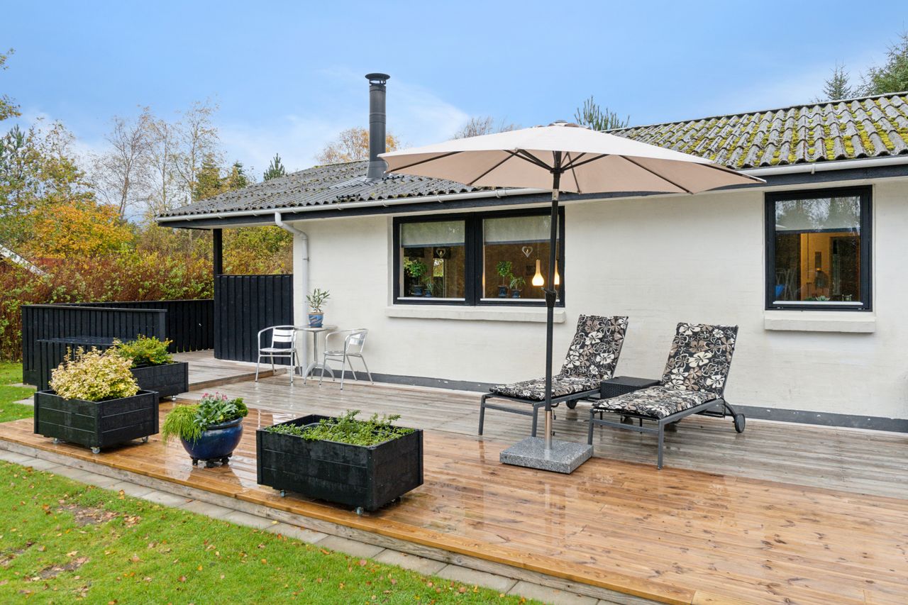 Velkommen indenfor via god overdækning, der fungerer som carport til god fordelingsgang og en fin planløsning. 3 gode værelser. Rummeligt og lyst badeværelse med bruseniche, bademiljø samt installeret vaskemaskine. Godt og praktisk køkken i forbindelse med den rummelige stue der fremstår lys og venlig. Fra stuen er udgang til god overdækket terrasse mod vest. Desuden findes stor træterrasse mod havesiden mod syd. Boligen opvarmes via varmepumpe årg 2024 samt Brændeovn årg 2023.