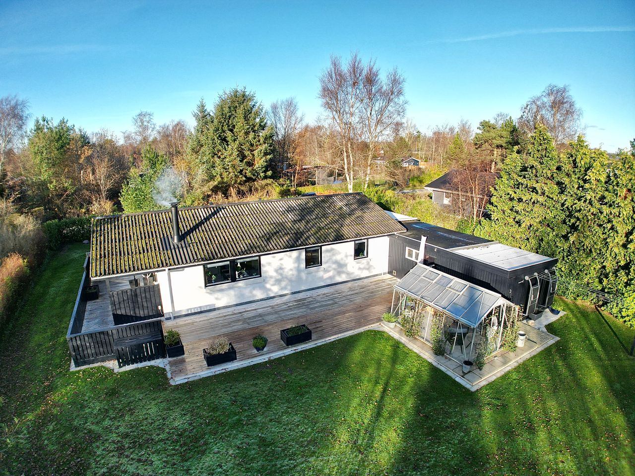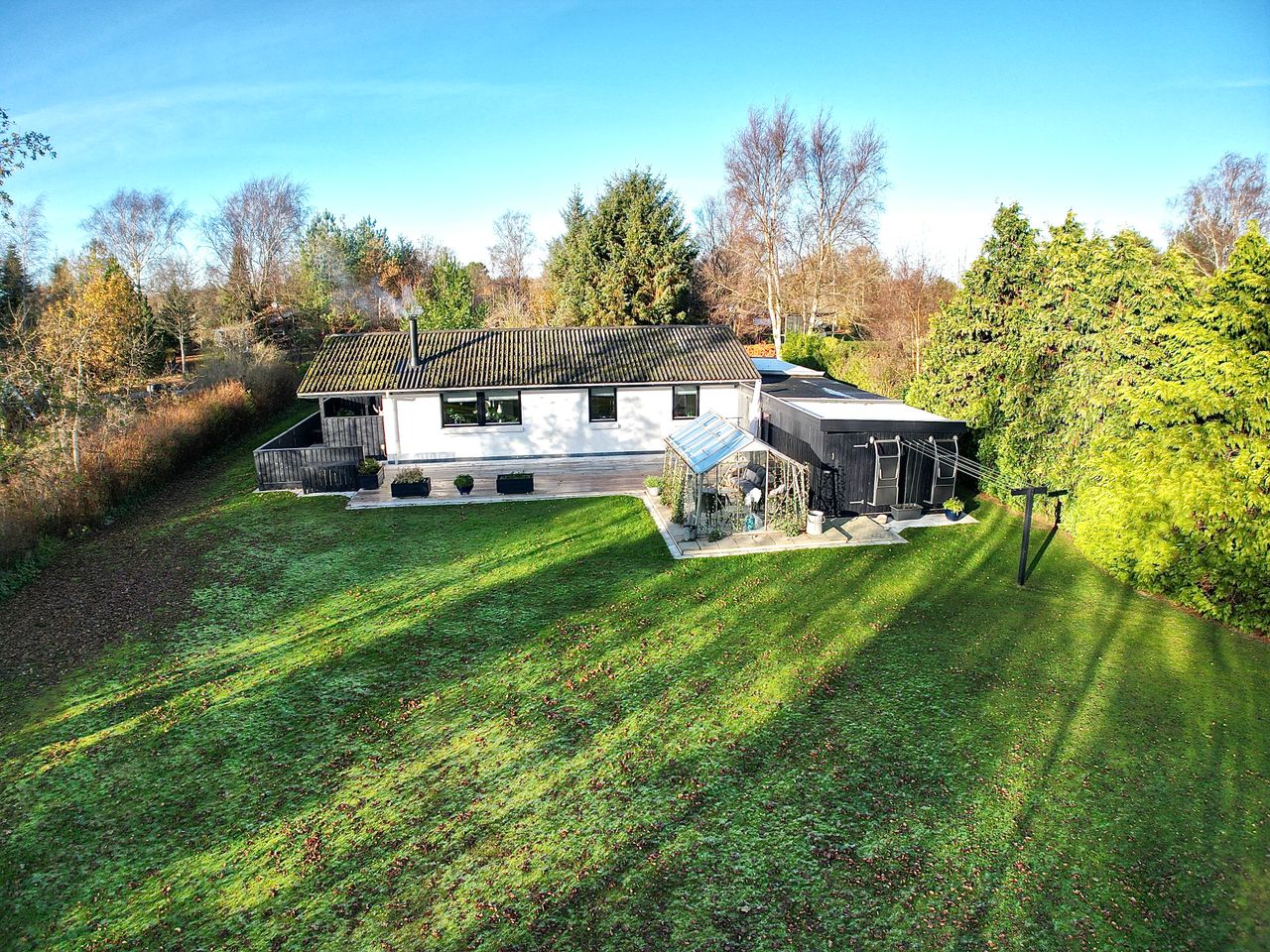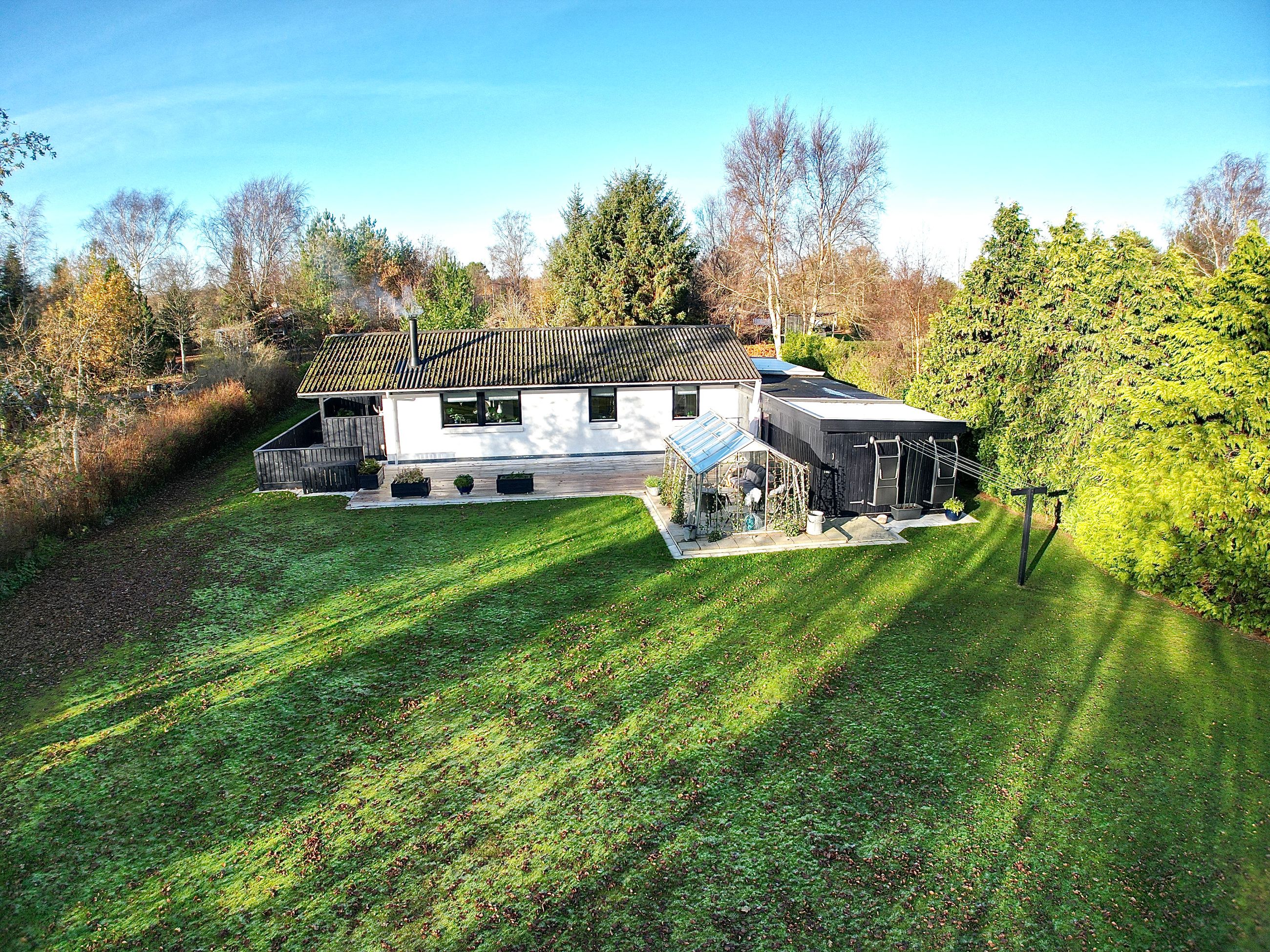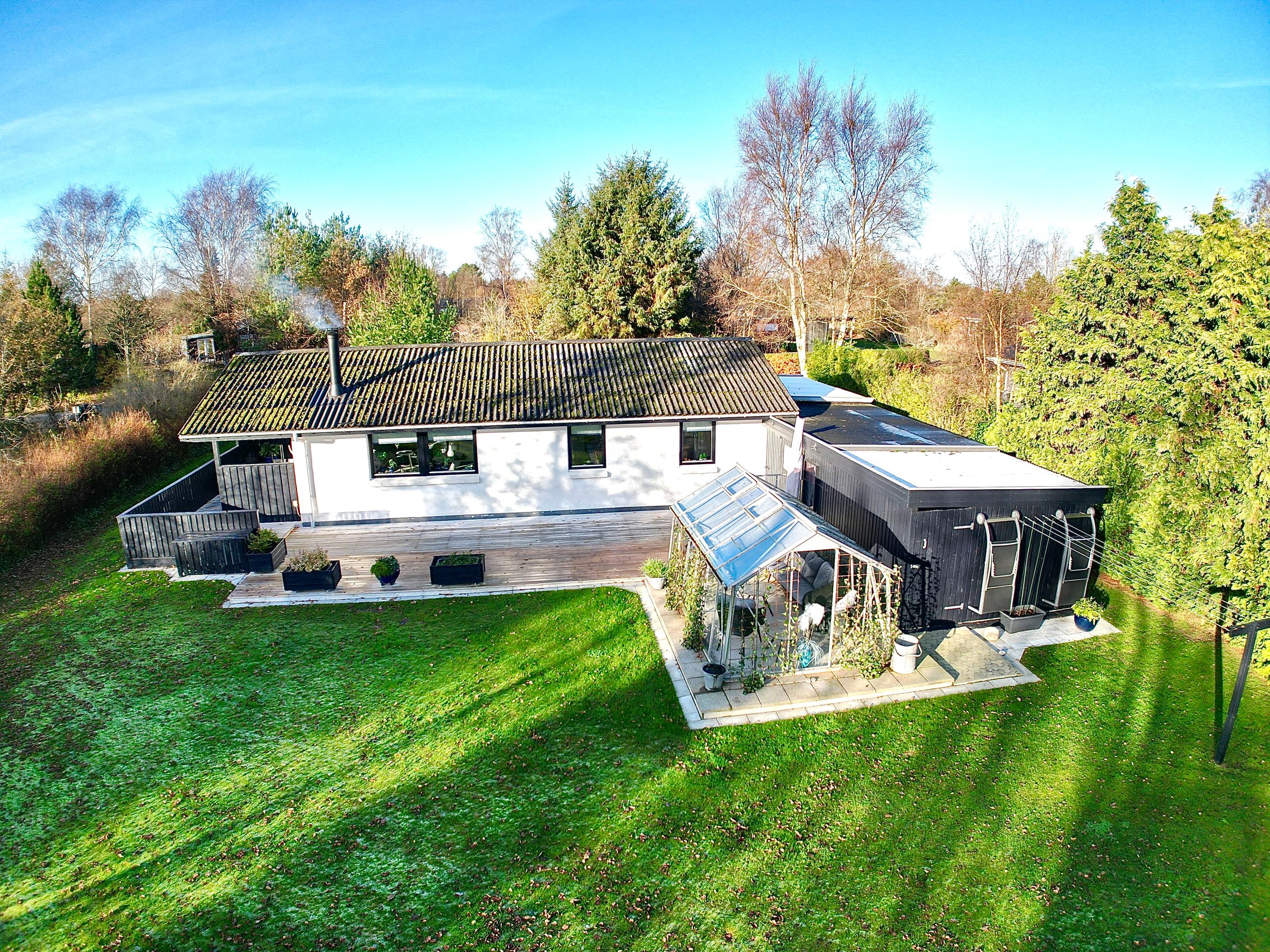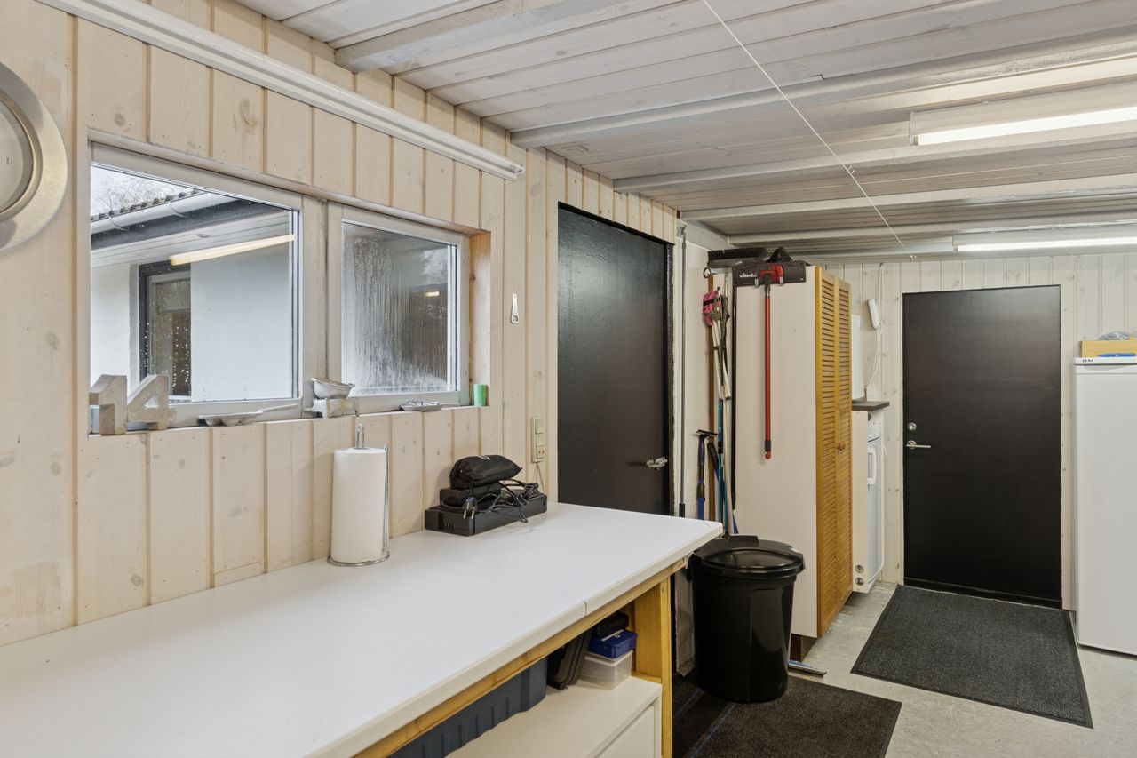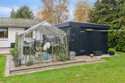 Til ejendommen hører, som tidligere nævnt, Carport - desuden godt isoleret udhus hvor findes værkstedsbord samt opbevaringsmuligheder. Udover dette rum findes brændeskur/redskabsskur samt drivhus.