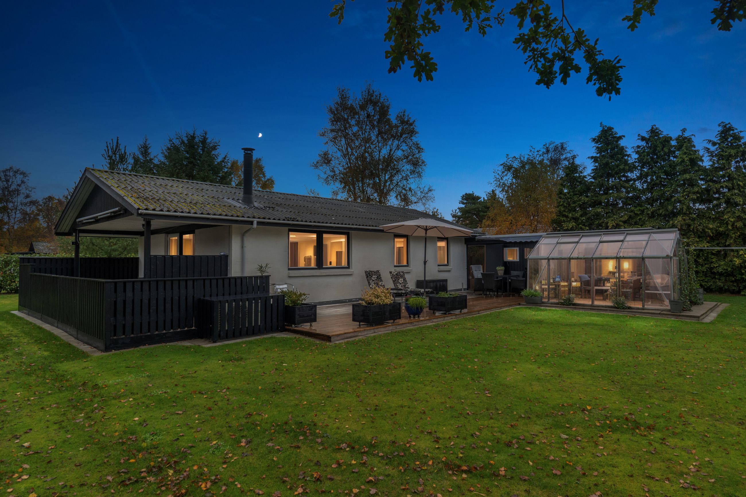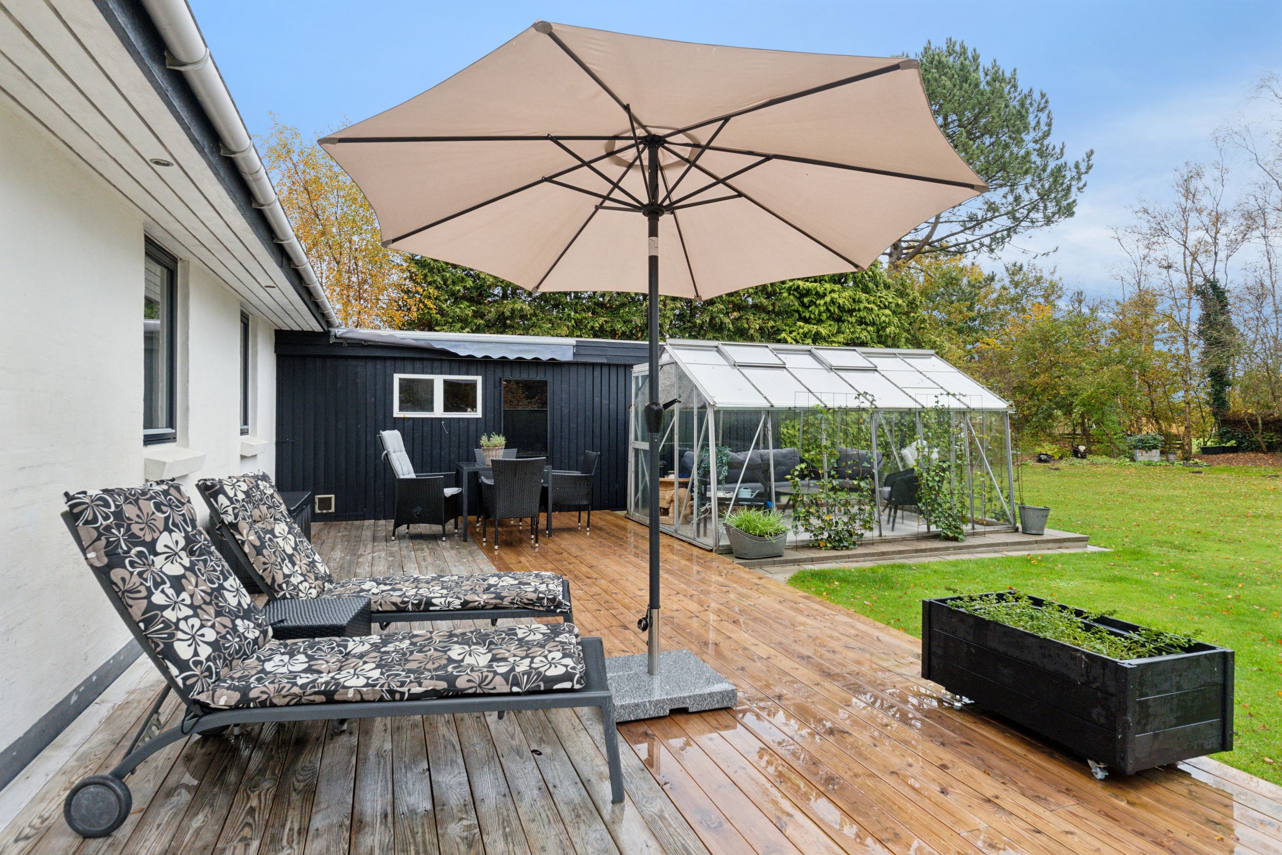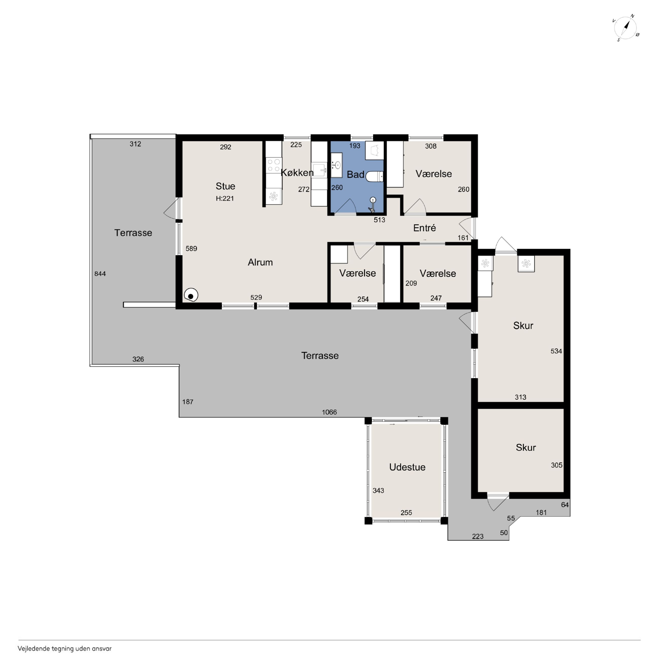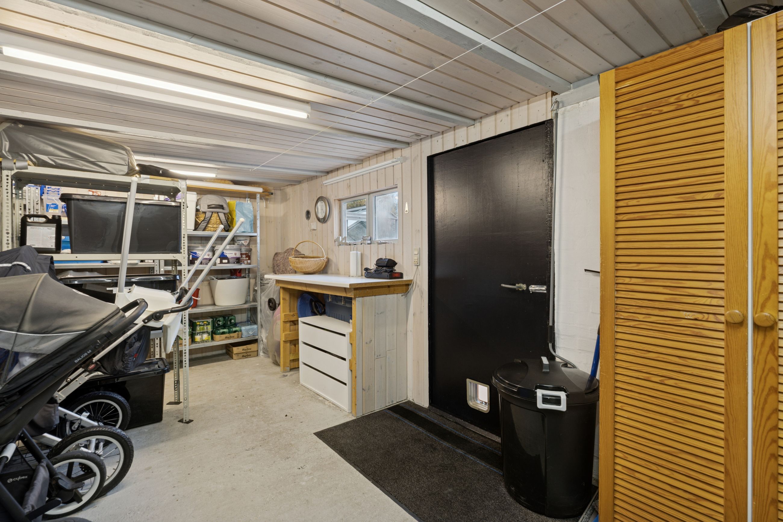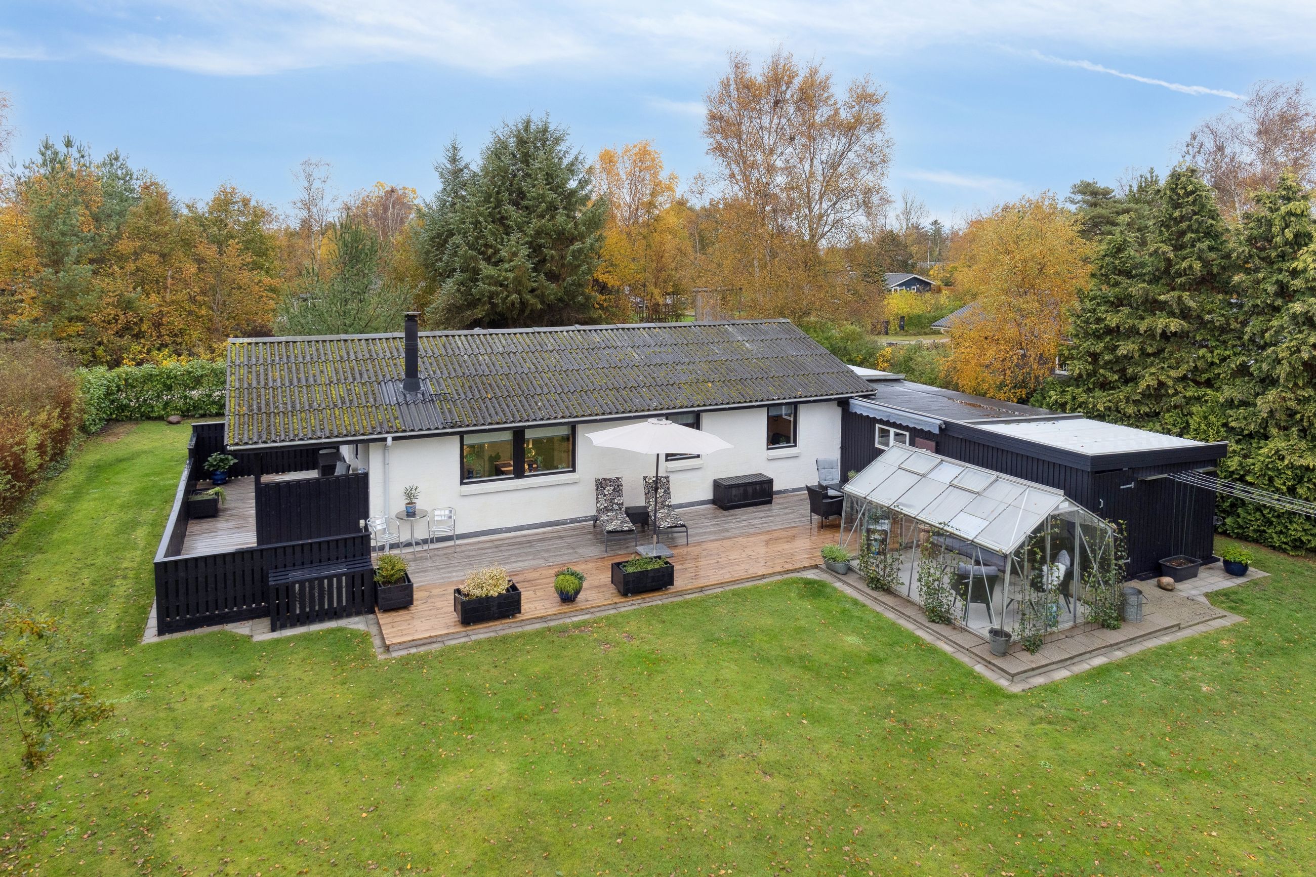 Til ejendommen hører, som tidligere nævnt, Carport - desuden godt isoleret udhus hvor findes værkstedsbord samt opbevaringsmuligheder. Udover dette rum findes brændeskur/redskabsskur samt drivhus.