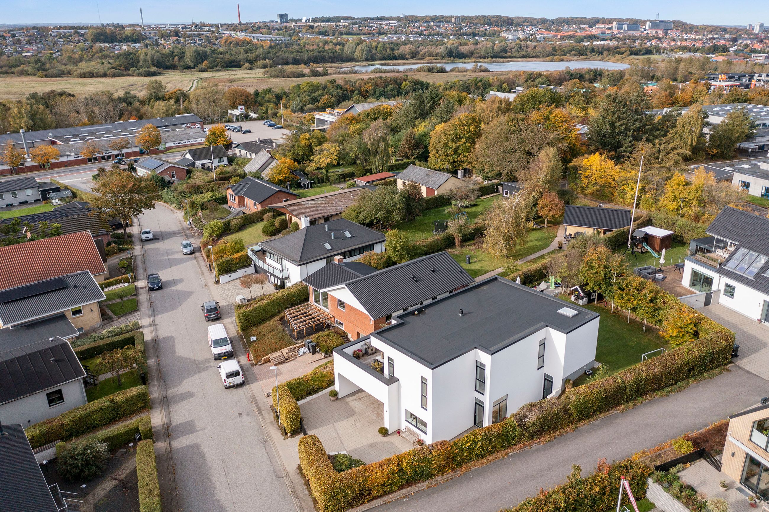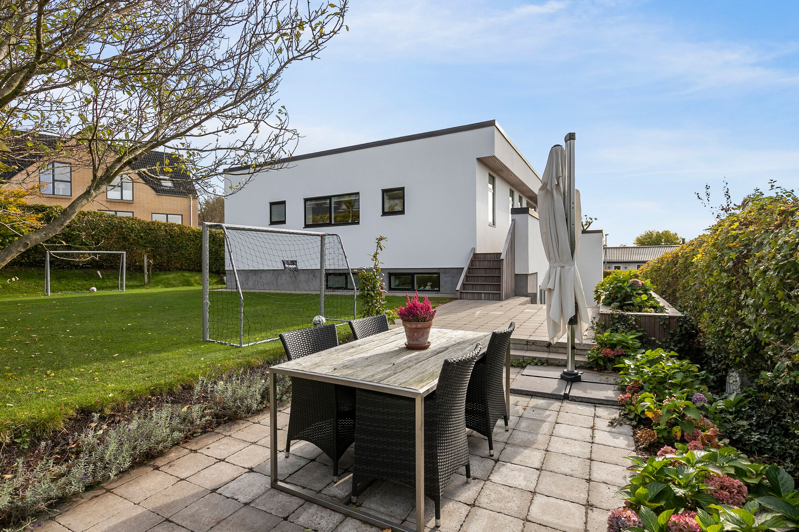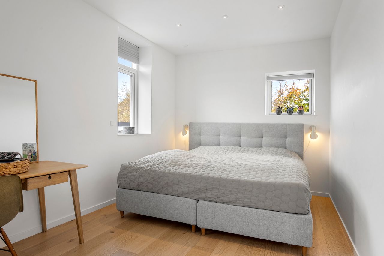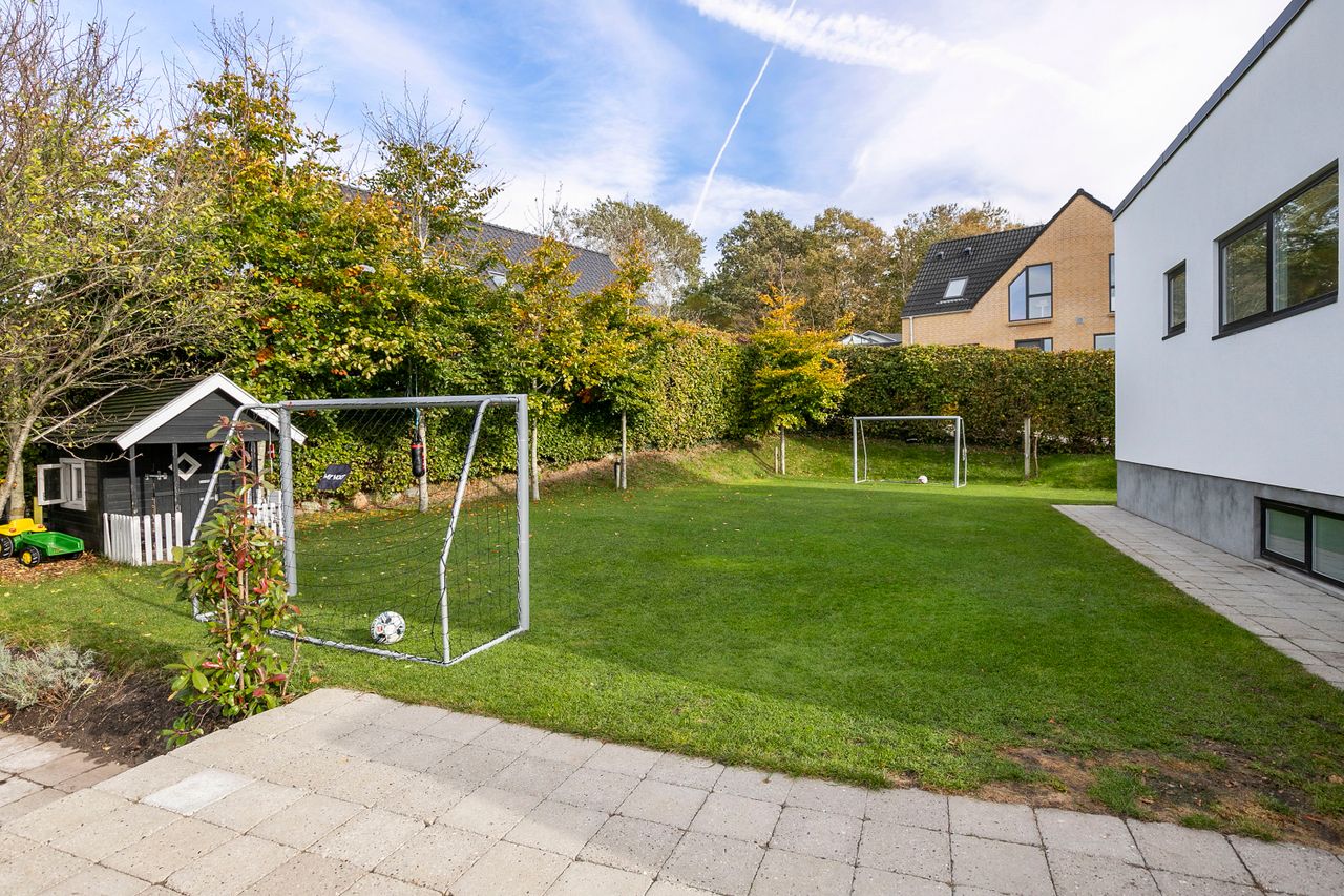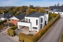 Den arkitekttegnede funkisvilla stod indflytningsklar i 2017. Villaen rummer alt, hvad hjertet kan begære, og ejendommen er opført i meget høj kvalitet. Her er ingen kompromiser, hverken hvad angår indretning eller materialevalg. Alt er gennemtænkt og kræset for ned til mindste detalje, og ejendommen er meget energivenlig med masser af naturligt lys på alle etager. Der er naturligvis gulvvarme og ventilationsanlæg i alle rum, og en rød tråd går igennem både inventar og design. Udvendigt er haven velanlagt og optimeret i forhold til solens stråler, og der er et separat udhus integreret i boligen mod øst. Desuden er der etableret flotte støttemure og flisebelægning rundt om grunden, og hækken har nu nået en højde, der sikrer fuld privatliv.