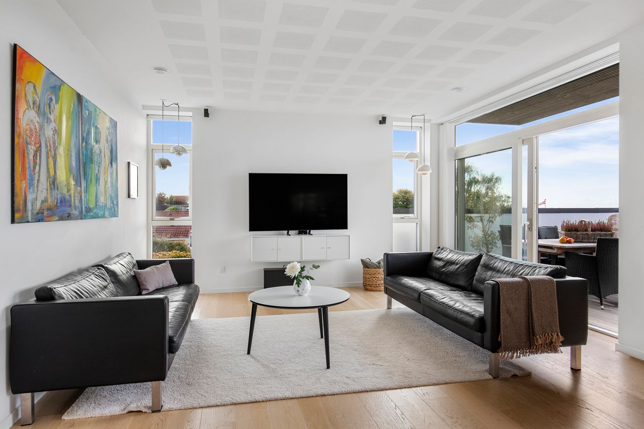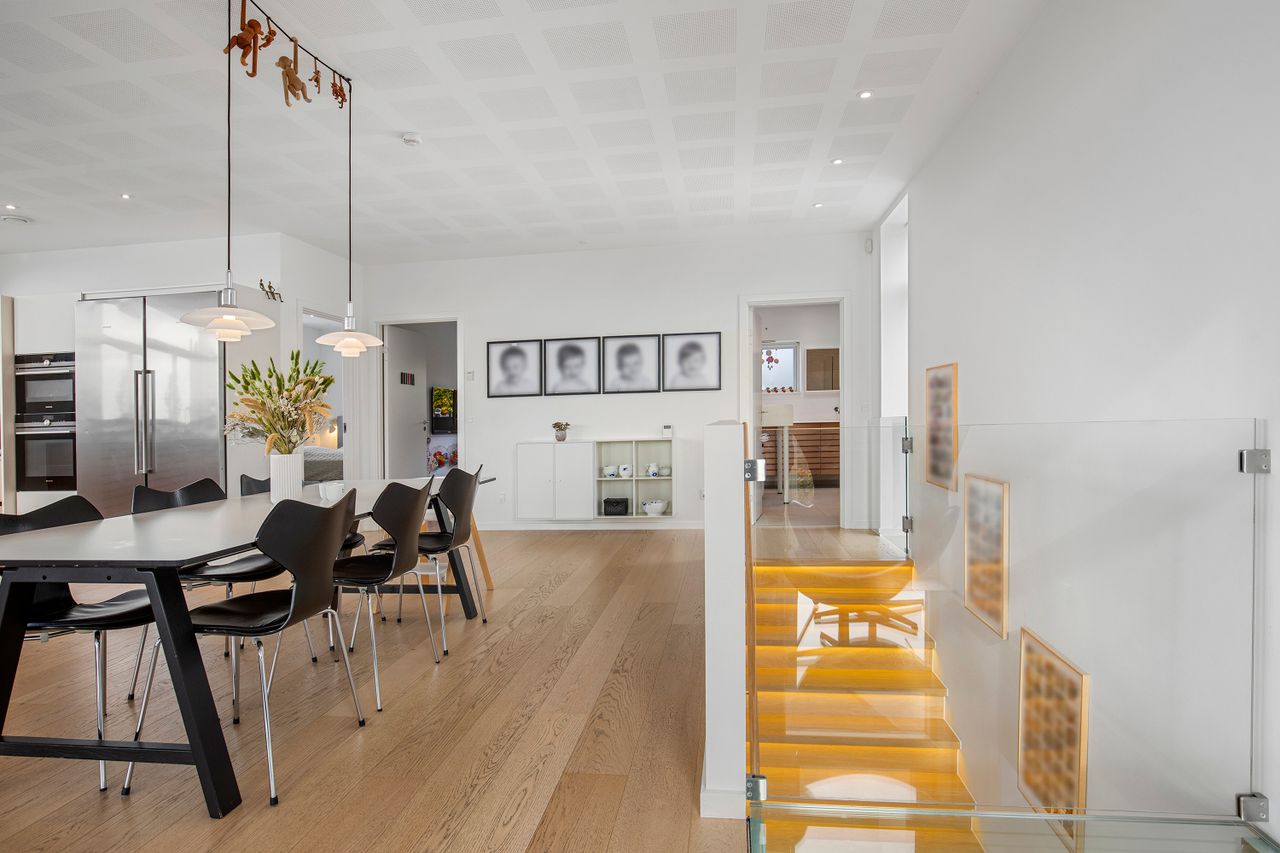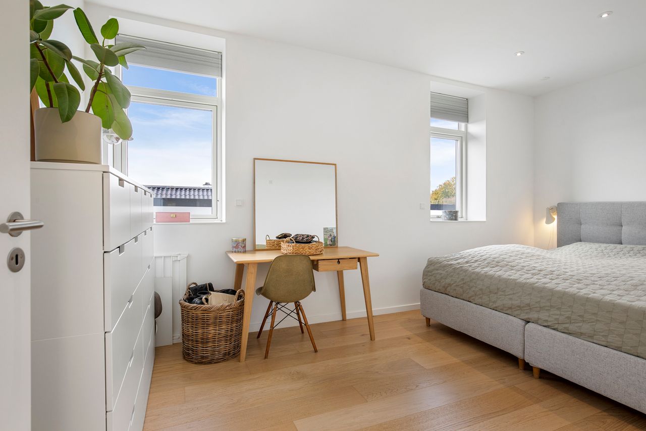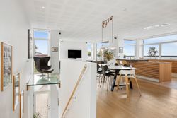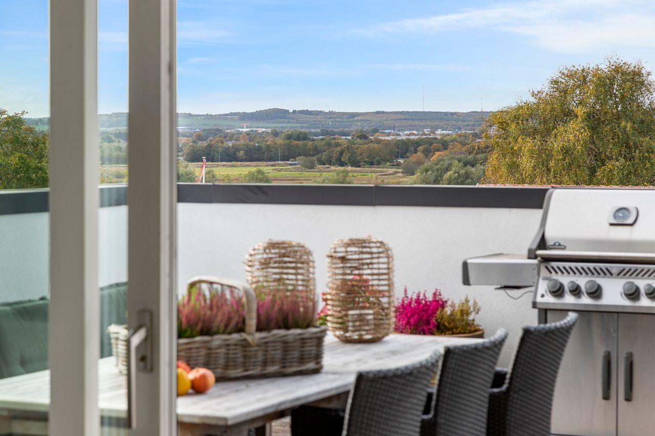 Den øvre etage, som tilgås via en snedkerlavet trappe med indbygget lys, byder på to store og rummelige værelser samt endnu et badeværelse med ovenlysvindue, så lyset strømmer ind hele dagen. Køkken-alrummet er en historie for sig; her er rig mulighed for at udfolde sig kulinarisk. Køkkenet er udstyret med alle hårde hvidevarer udover det sædvanelige, og materialevalget er, som resten af boligen, udsøgt. I forlængelse af alrummet finder vi stuen, hvor der er plads til, at hele familien kan samles. Fra stuen er der udgang til en skøn, ugeneret og privat terrasse mod vest, hvor sommeraftenerne kan nydes i ro og fred. Udsigten fra etagen er ubeskrivelig, og når mørket falder på, bliver den kun smukkere med byens lys i baggrunden.