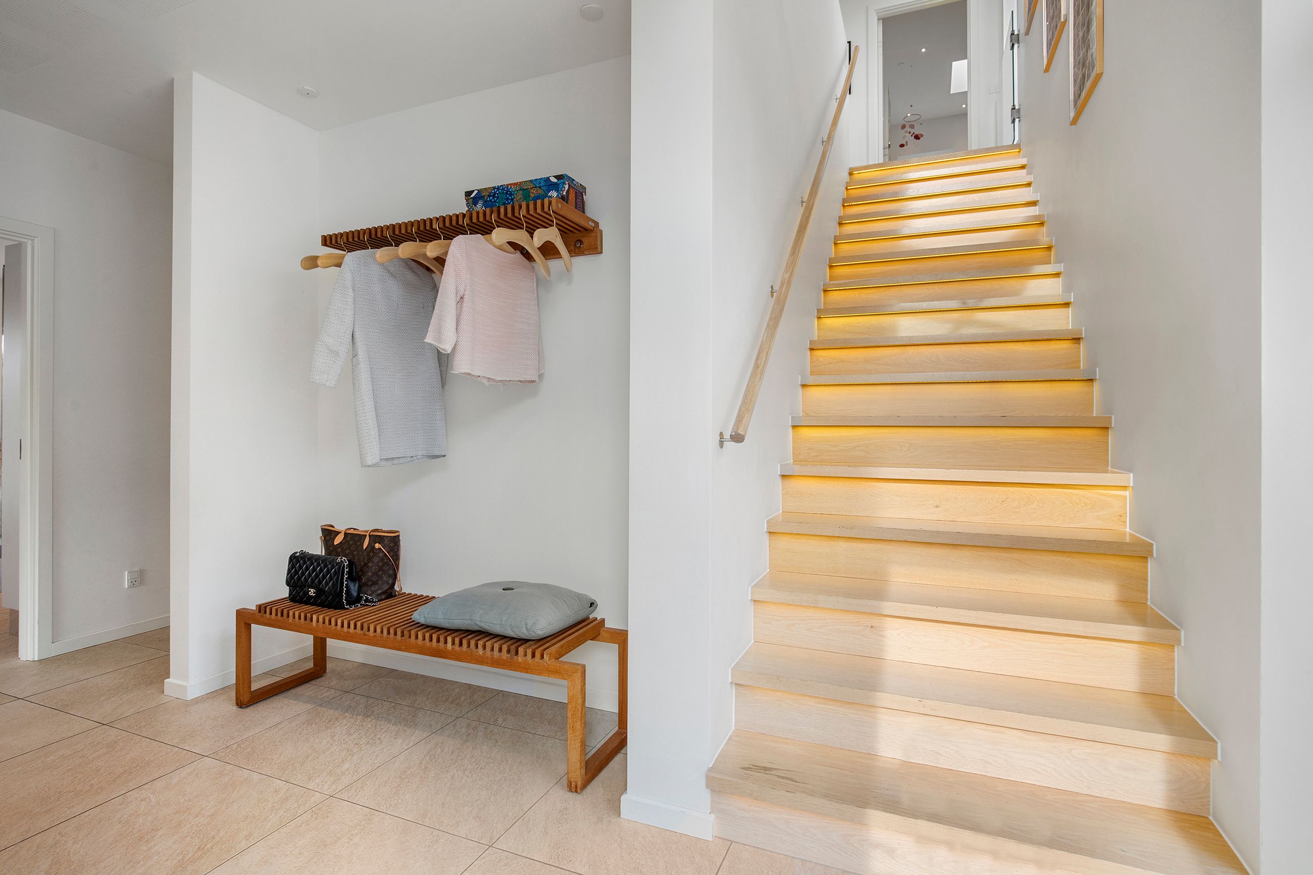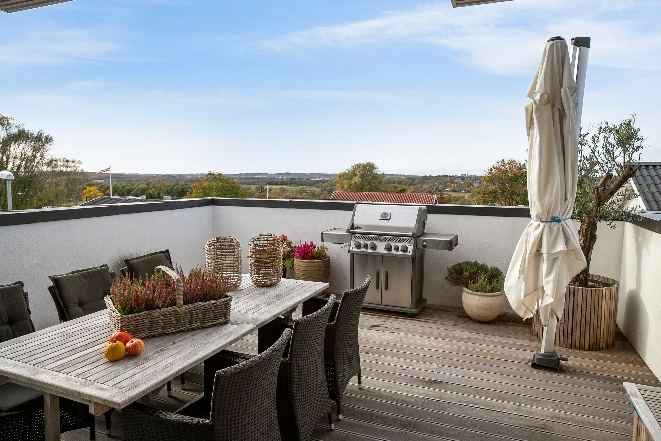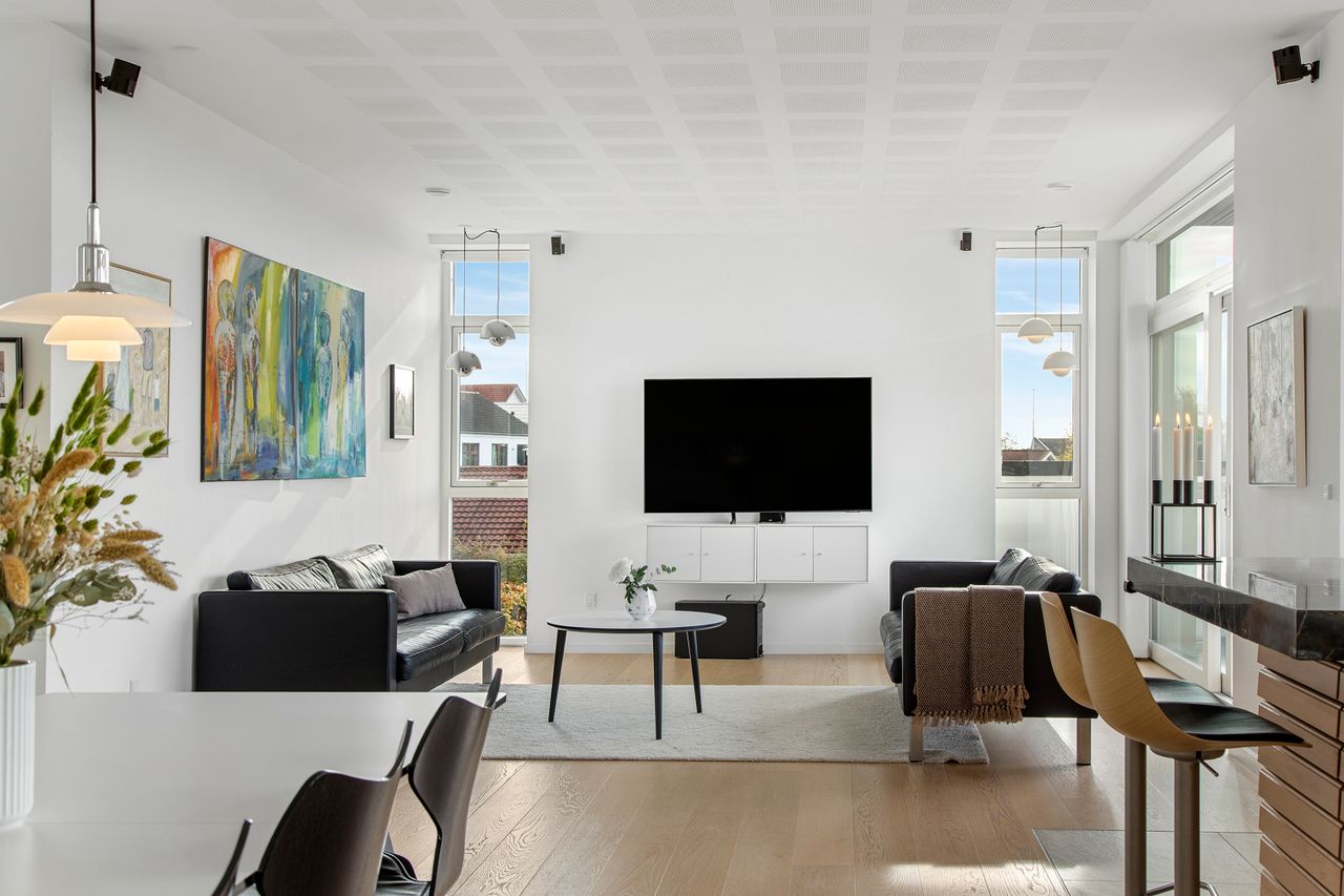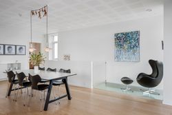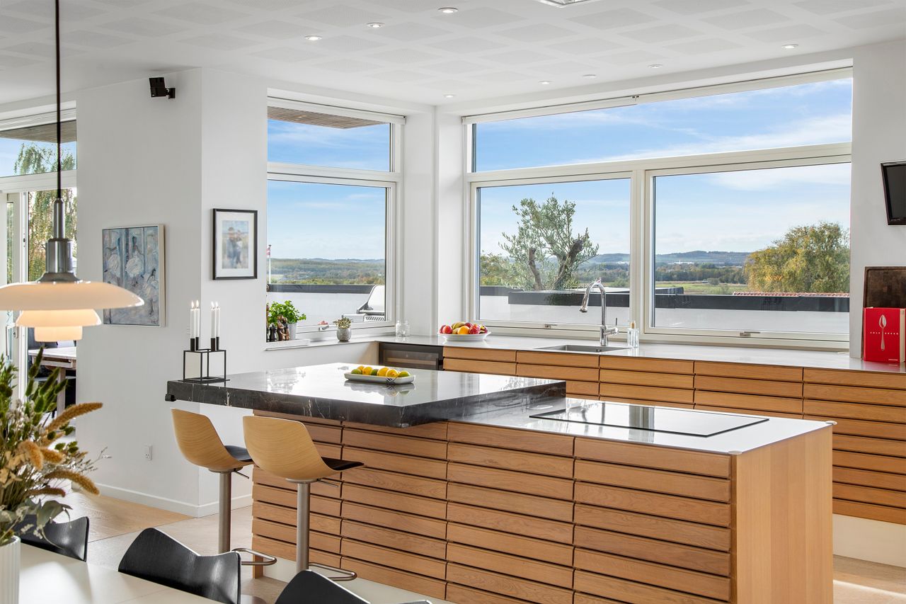 Den øvre etage, som tilgås via en snedkerlavet trappe med indbygget lys, byder på to store og rummelige værelser samt endnu et badeværelse med ovenlysvindue, så lyset strømmer ind hele dagen. Køkken-alrummet er en historie for sig; her er rig mulighed for at udfolde sig kulinarisk. Køkkenet er udstyret med alle hårde hvidevarer udover det sædvanelige, og materialevalget er, som resten af boligen, udsøgt. I forlængelse af alrummet finder vi stuen, hvor der er plads til, at hele familien kan samles. Fra stuen er der udgang til en skøn, ugeneret og privat terrasse mod vest, hvor sommeraftenerne kan nydes i ro og fred. Udsigten fra etagen er ubeskrivelig, og når mørket falder på, bliver den kun smukkere med byens lys i baggrunden.