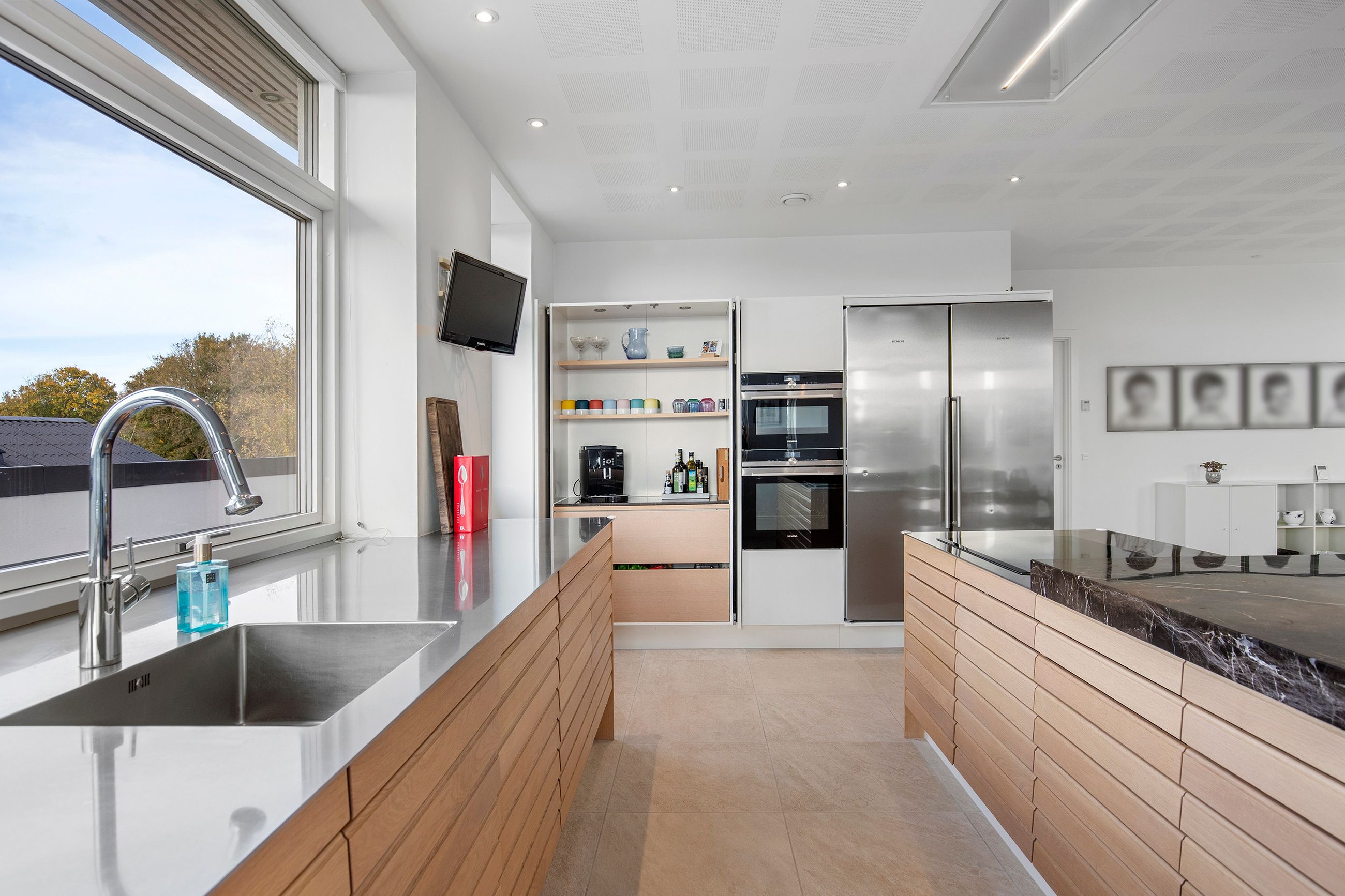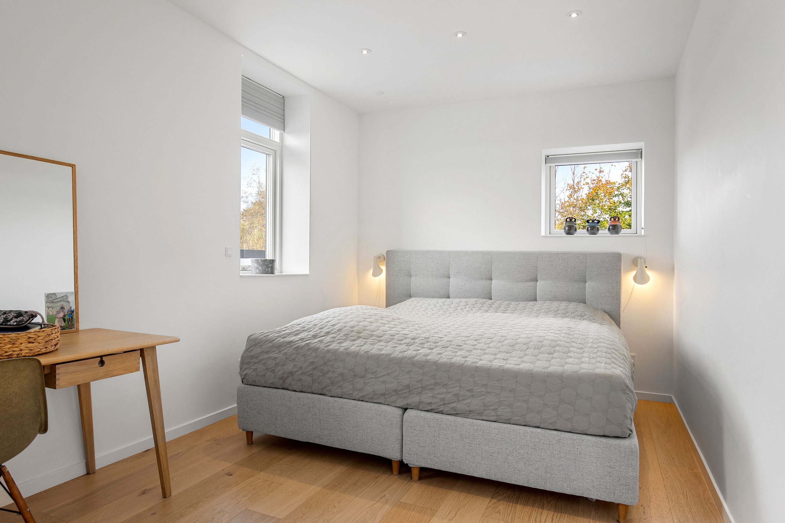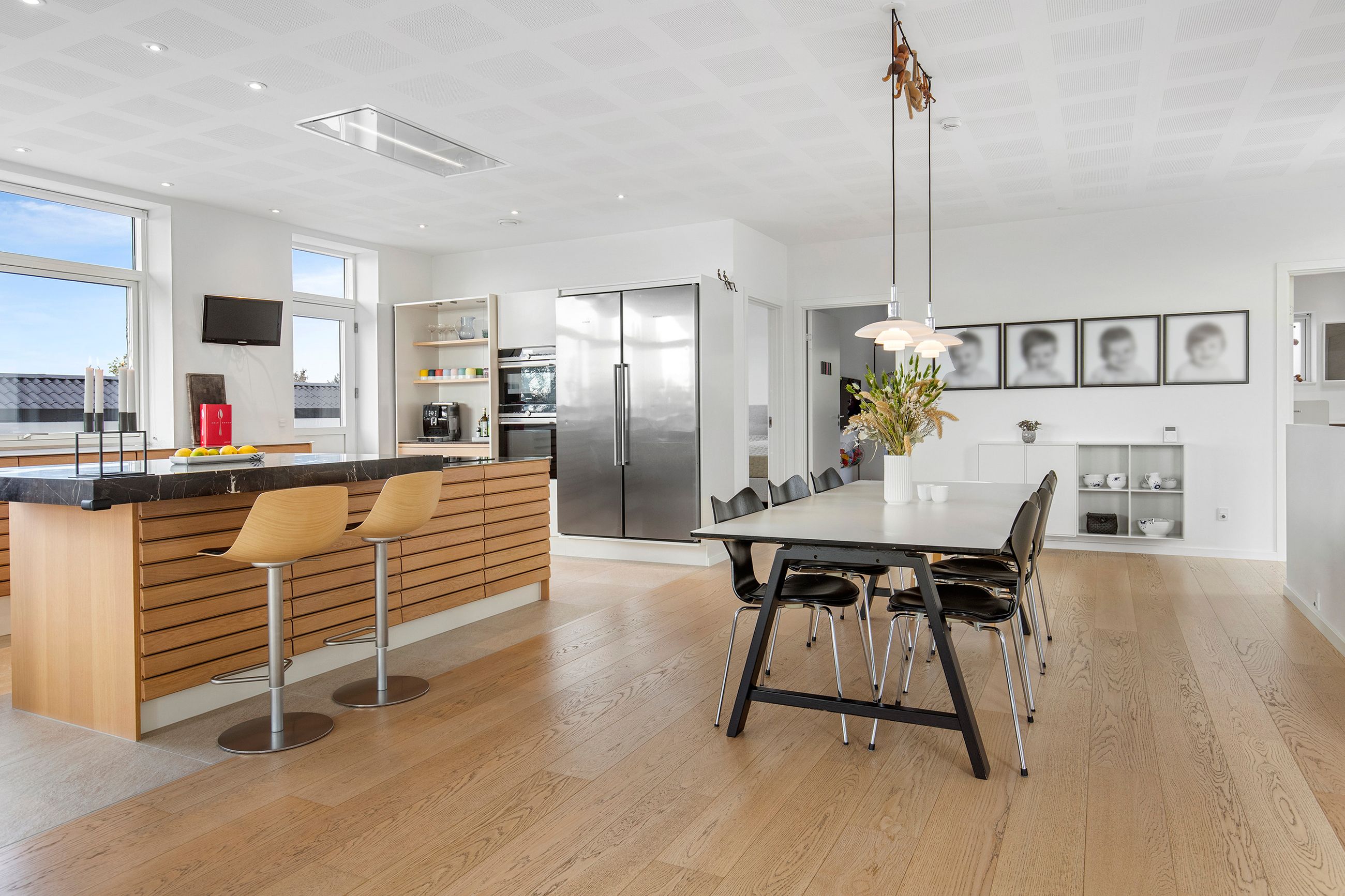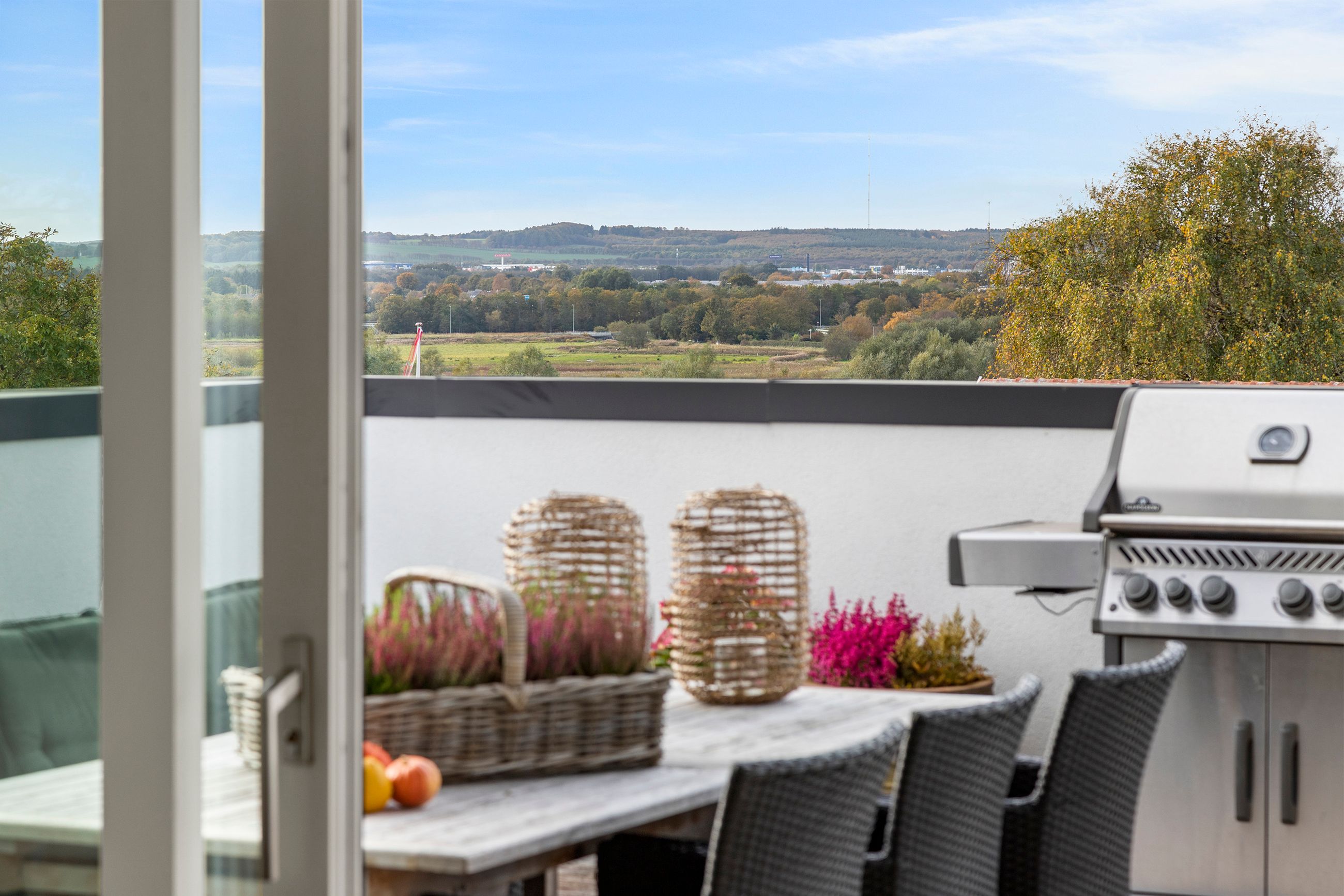 Den øvre etage, som tilgås via en snedkerlavet trappe med indbygget lys, byder på to store og rummelige værelser samt endnu et badeværelse med ovenlysvindue, så lyset strømmer ind hele dagen. Køkken-alrummet er en historie for sig; her er rig mulighed for at udfolde sig kulinarisk. Køkkenet er udstyret med alle hårde hvidevarer udover det sædvanelige, og materialevalget er, som resten af boligen, udsøgt. I forlængelse af alrummet finder vi stuen, hvor der er plads til, at hele familien kan samles. Fra stuen er der udgang til en skøn, ugeneret og privat terrasse mod vest, hvor sommeraftenerne kan nydes i ro og fred. Udsigten fra etagen er ubeskrivelig, og når mørket falder på, bliver den kun smukkere med byens lys i baggrunden.