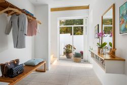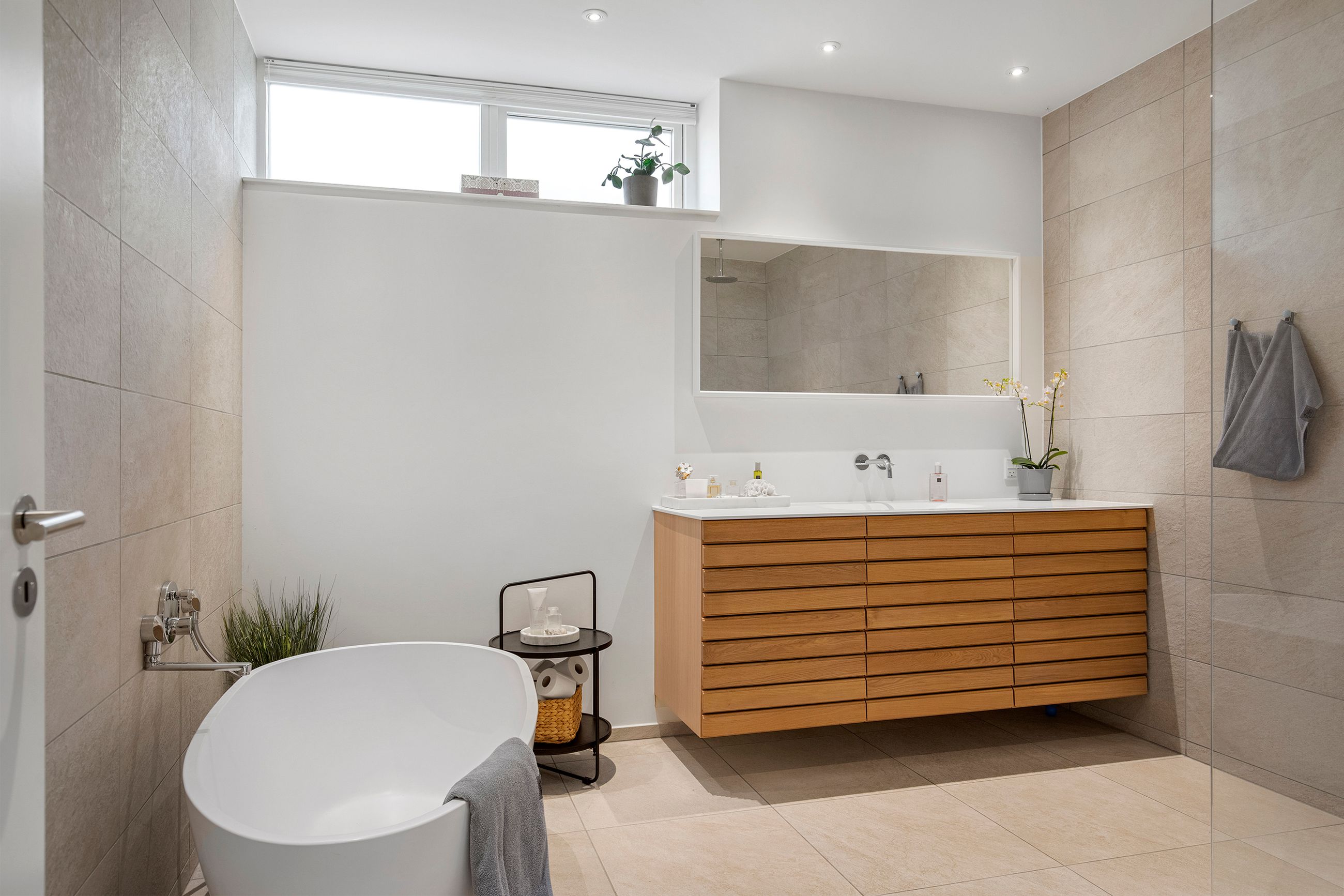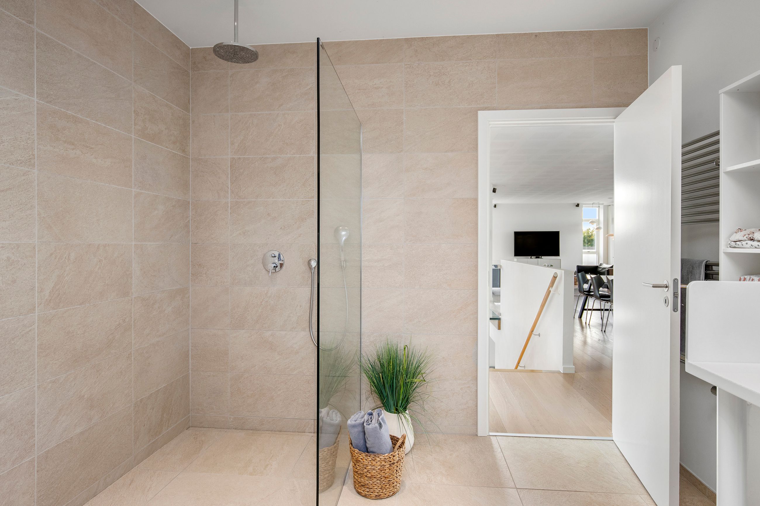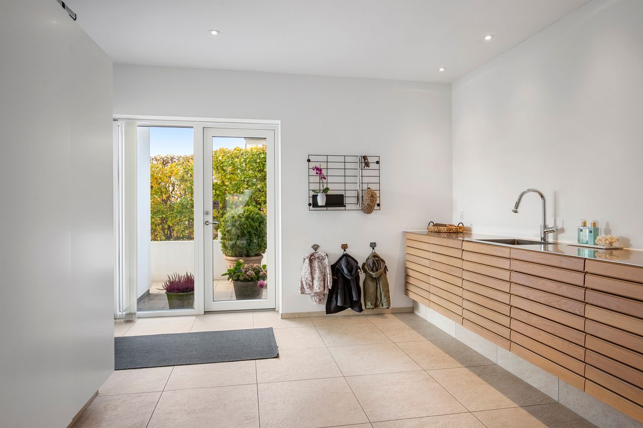Når man ankommer til ejendommen, føres man først til den private indkørsel, som leder direkte til den rummelige dobbelte carport. Den smukke indgang til husets hall imponerer med sin lofthøjde, der strækker sig over to etager. Underetagen byder på et rummeligt børneværelse samt yderligere to store disponible rum, der er meget anvendelige. Etagen rummer desuden et større multirum, som binder de øvrige rum sammen, samt et imponerende badeværelse med fritstående badekar og bruseniche – alt sammen udført i en stil, der leder tankerne mod en italiensk spa. Fra carporten kan man tilgå bryggerset direkte, hvor der er rigelig opbevaringsplads samt vaskefaciliteter.