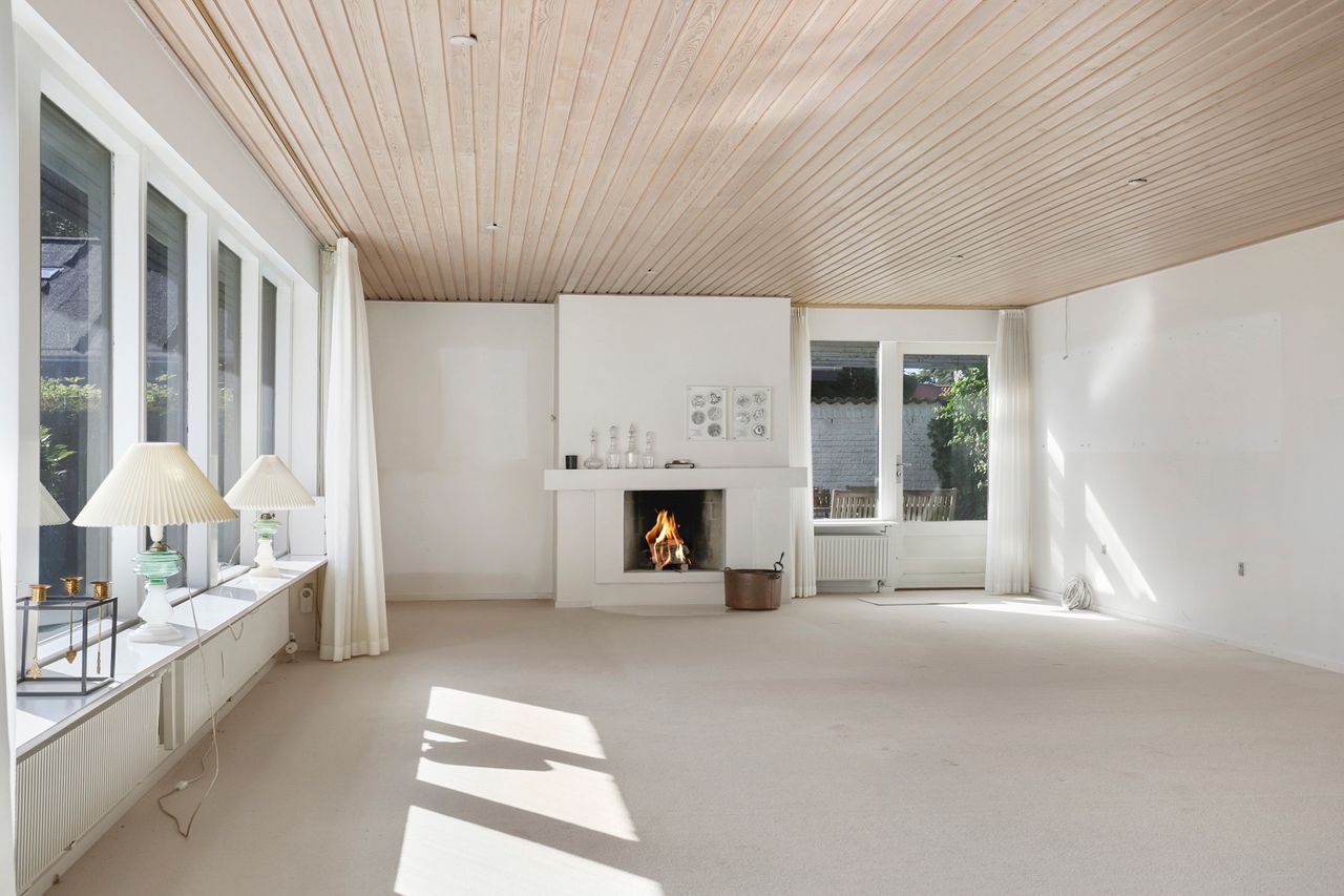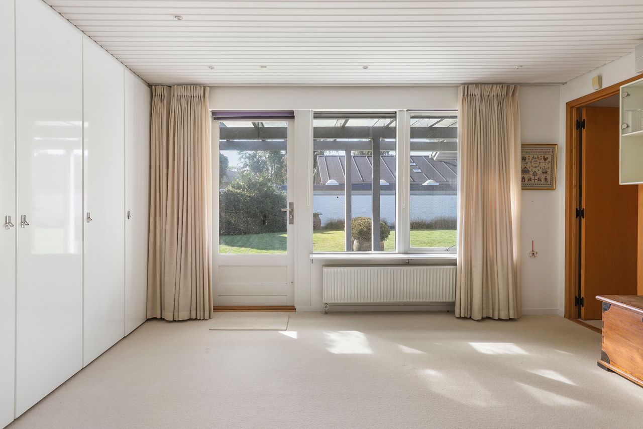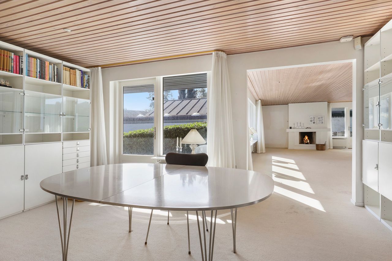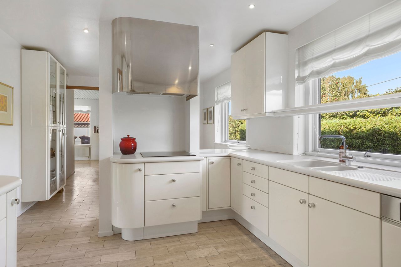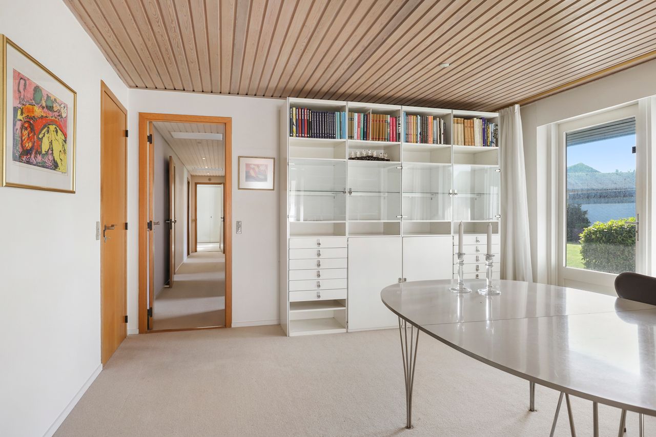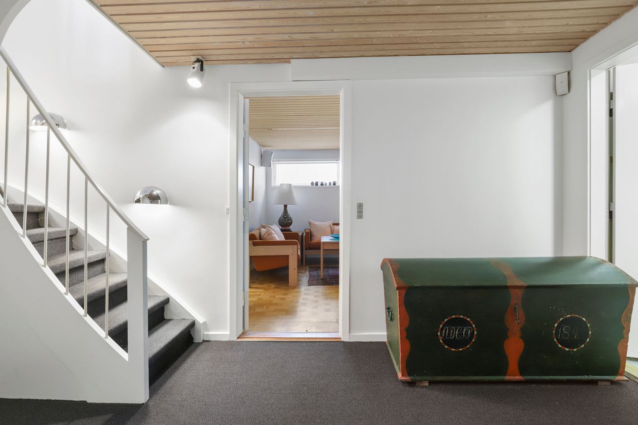 Når man træder ind i boligen, kommer man først til entréen, hvorfra man fortsætter til den store fordelingsgang. Herfra er der adgang til et værelse, der egner sig perfekt som gæsteværelse eller kontor. Ved siden af værelset findes et gæstetoilet. På den modsatte side af fordelingsgangen ligger boligens spisestue, som er i åben forlængelse af hovedstuen, hvor der er en flot udsigt til haven. Fra stuen er der adgang til den vestvendte, overdækkede terrasse med udendørs ildsted. Overfor spisestuen finder vi ejendommens køkken, der er meget velholdt med moderne hårde hvidevarer og masser af bordplads. Der er også god plads til spisning i køkkenet. I forlængelse af køkkenet ligger bryggerset med vaskefaciliteter og egen udgang. Fra bryggerset er der også adgang til underetagen. Stueplan afsluttes med værelsesafdelingen, som består af to store værelser med indbyggede skabe og et separat stort soveværelse med egen udgang til haven. Det primære badeværelse findes også i denne afdeling og fremstår lyst, indbydende og tidssvarende med skjult bruseniche og gulvvarme.