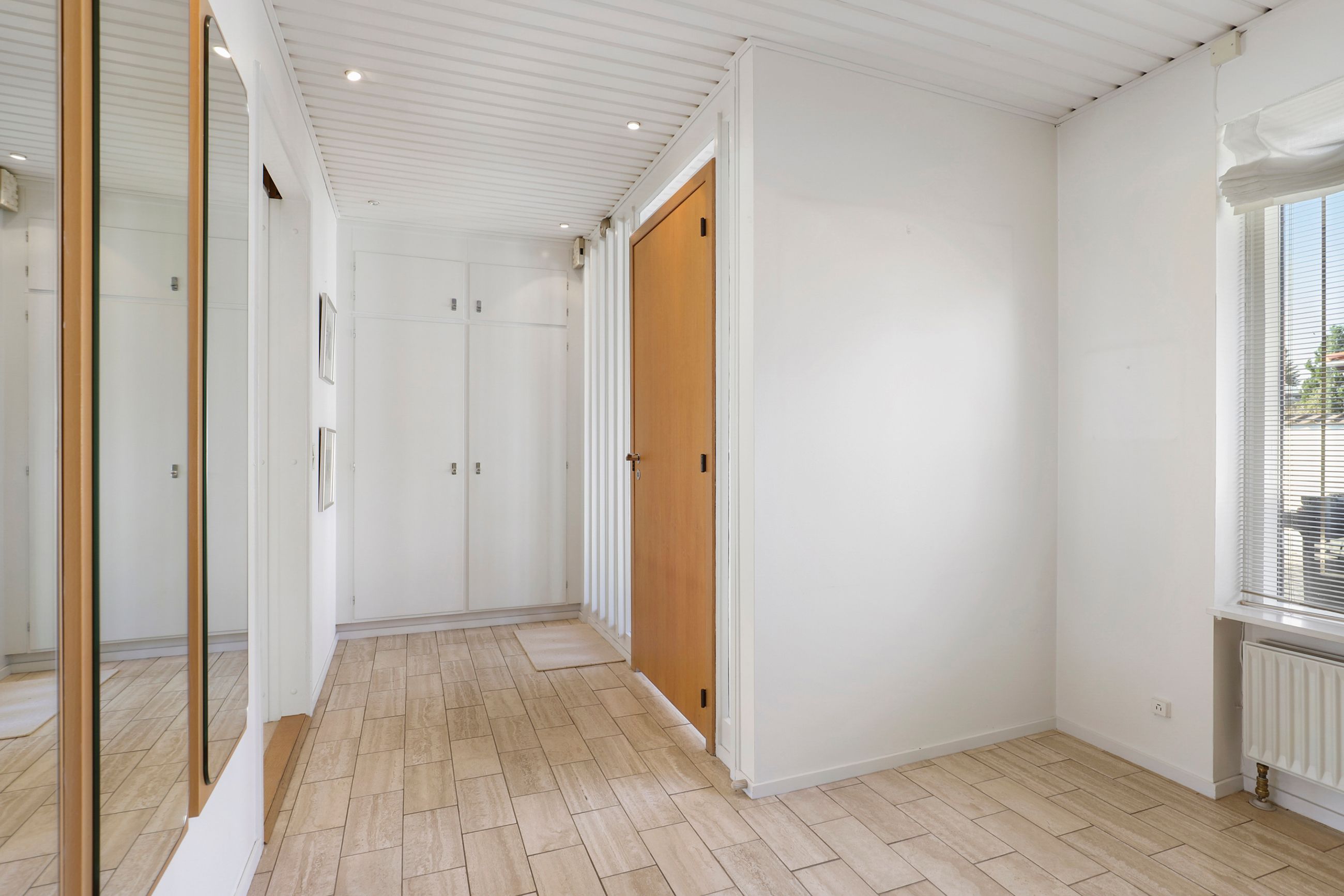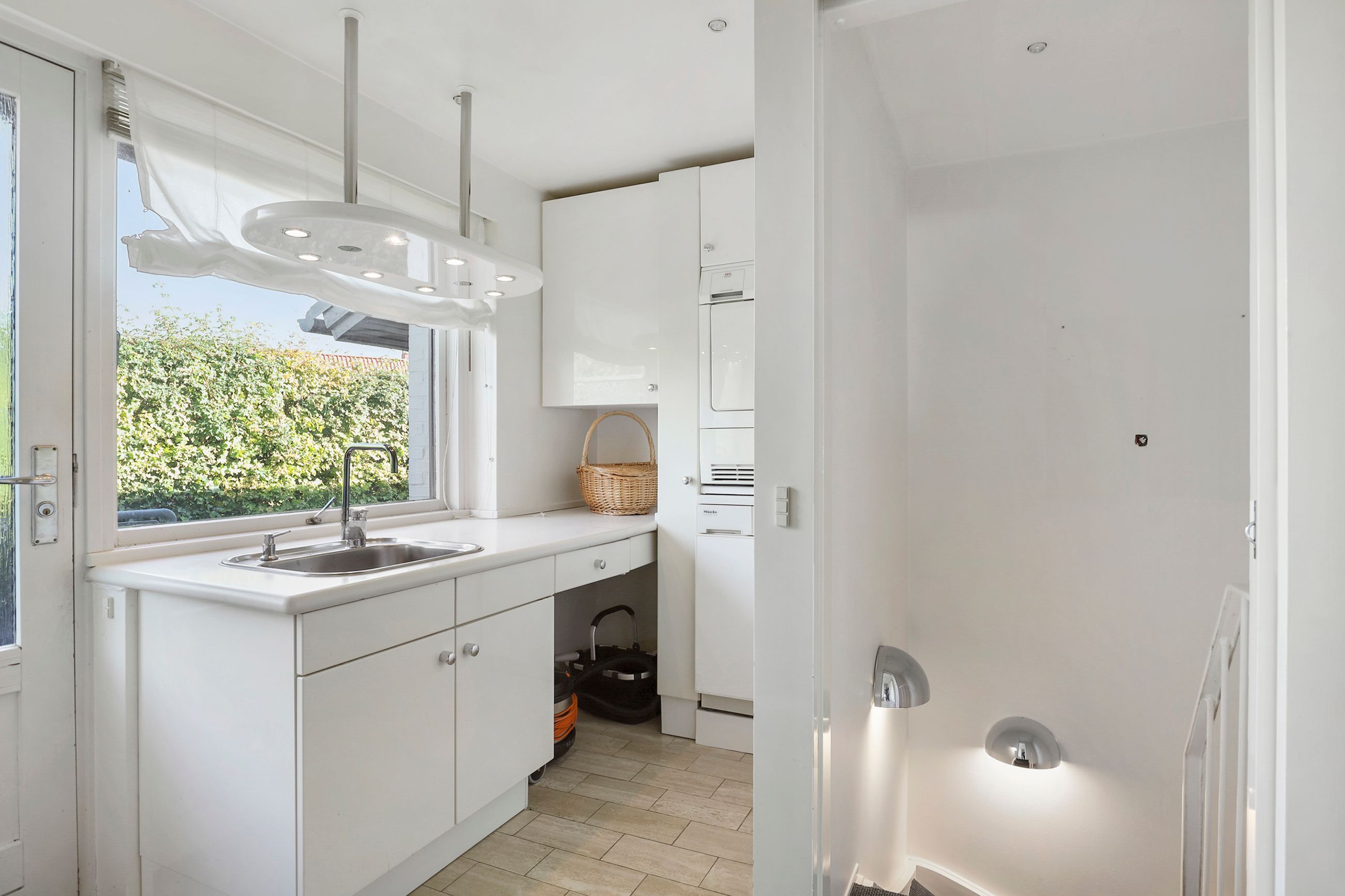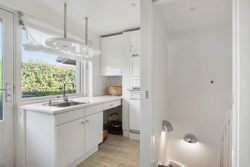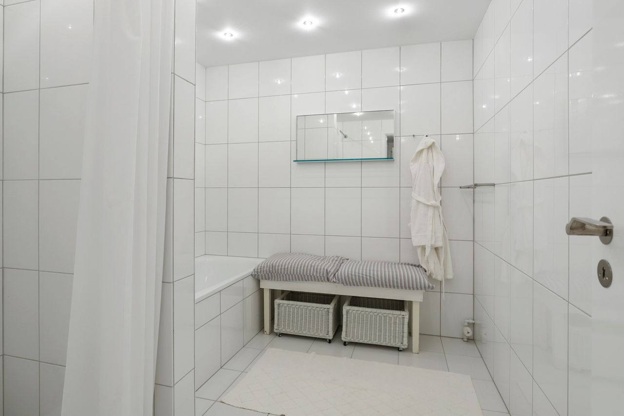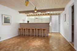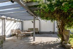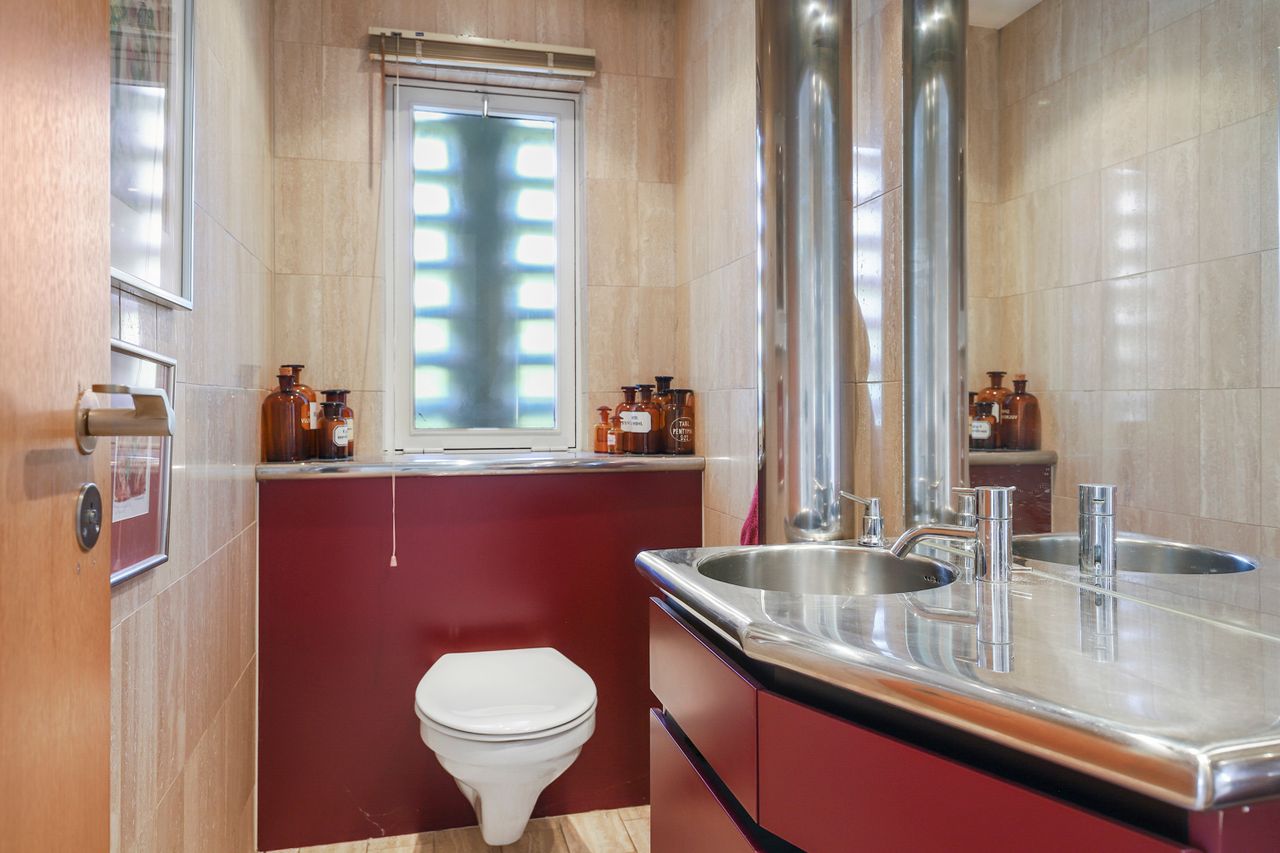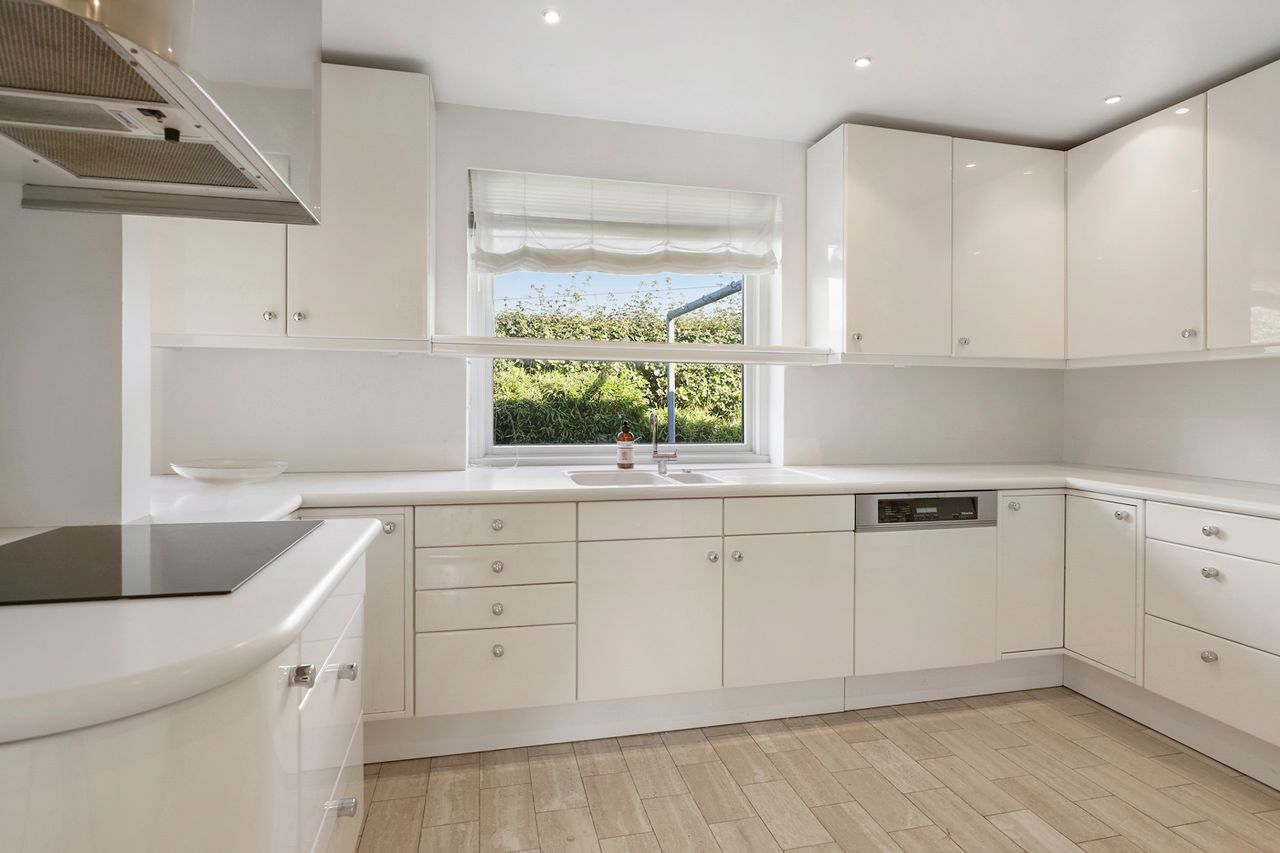 Når man træder ind i boligen, kommer man først til entréen, hvorfra man fortsætter til den store fordelingsgang. Herfra er der adgang til et værelse, der egner sig perfekt som gæsteværelse eller kontor. Ved siden af værelset findes et gæstetoilet. På den modsatte side af fordelingsgangen ligger boligens spisestue, som er i åben forlængelse af hovedstuen, hvor der er en flot udsigt til haven. Fra stuen er der adgang til den vestvendte, overdækkede terrasse med udendørs ildsted. Overfor spisestuen finder vi ejendommens køkken, der er meget velholdt med moderne hårde hvidevarer og masser af bordplads. Der er også god plads til spisning i køkkenet. I forlængelse af køkkenet ligger bryggerset med vaskefaciliteter og egen udgang. Fra bryggerset er der også adgang til underetagen. Stueplan afsluttes med værelsesafdelingen, som består af to store værelser med indbyggede skabe og et separat stort soveværelse med egen udgang til haven. Det primære badeværelse findes også i denne afdeling og fremstår lyst, indbydende og tidssvarende med skjult bruseniche og gulvvarme.