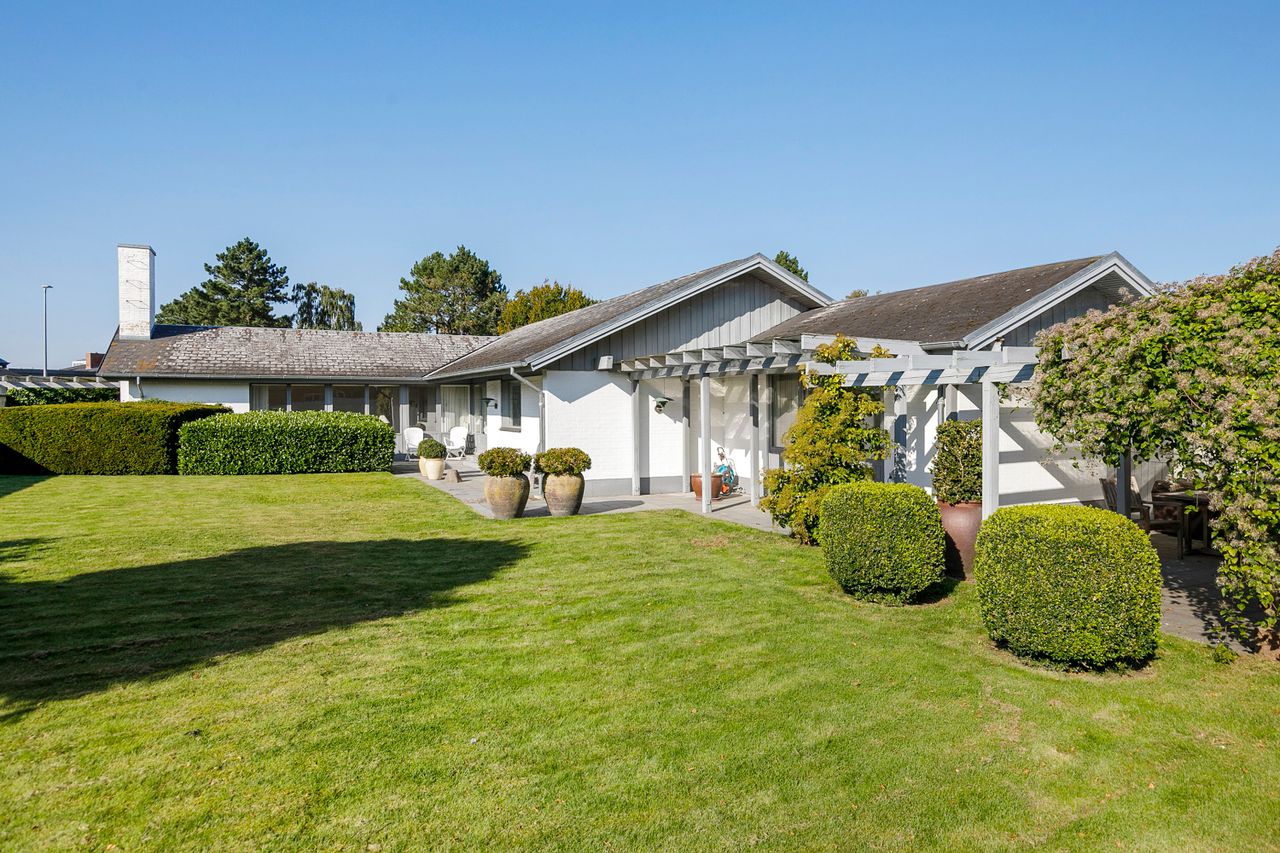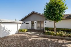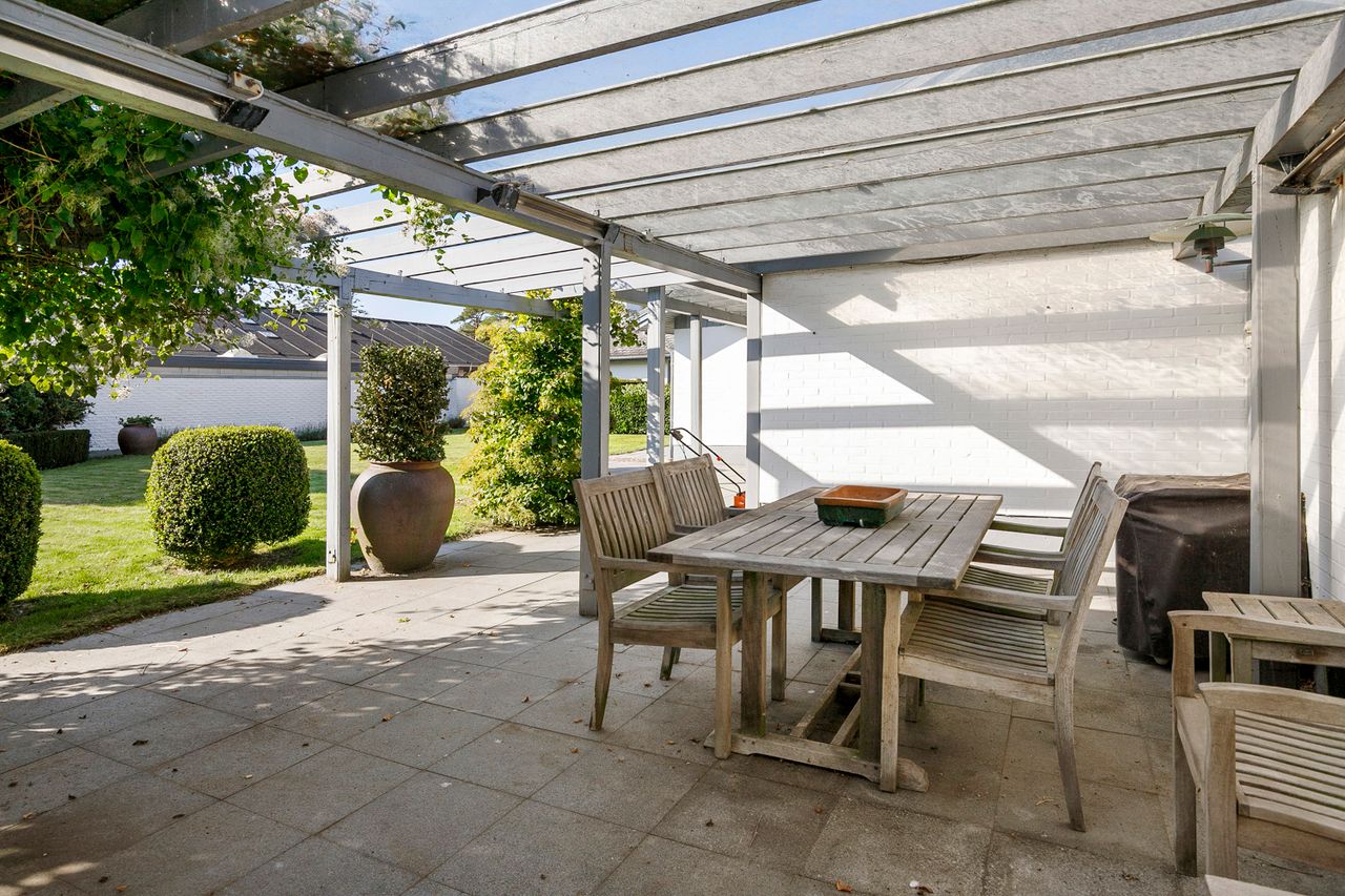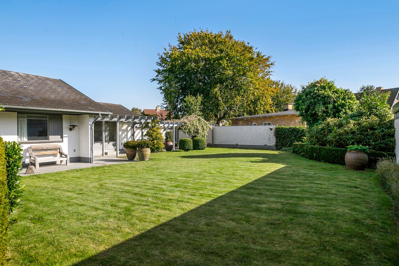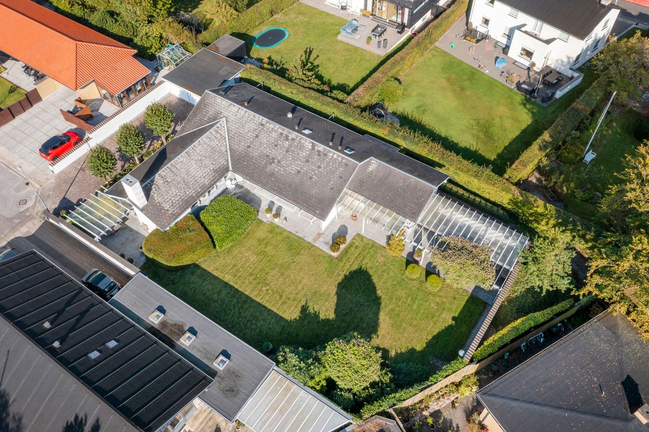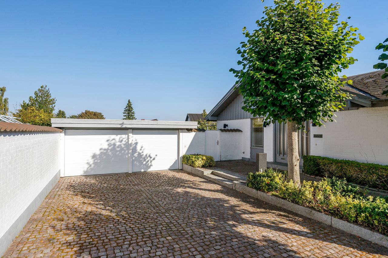 Villaen er en arkitekttegnet 1-plans villa, som fremstår meget velholdt og indbydende. Boligen rummer hele 207 kvm. i stueplan, og dertil kommer en god, tør og anvendelig underetage på 110 kvm. Til boligen hører også en 35 kvm. muret garage med el-port hvor bilen kan med udgang til baghaven og bryggers. Villaen er beliggende på en 1.026 kvm. stor solrig grund med en ugeneret sydvestvendt have. Haven fremstår meget velanlagt og byder derudover på store terrasser samt overdækkede arealer.