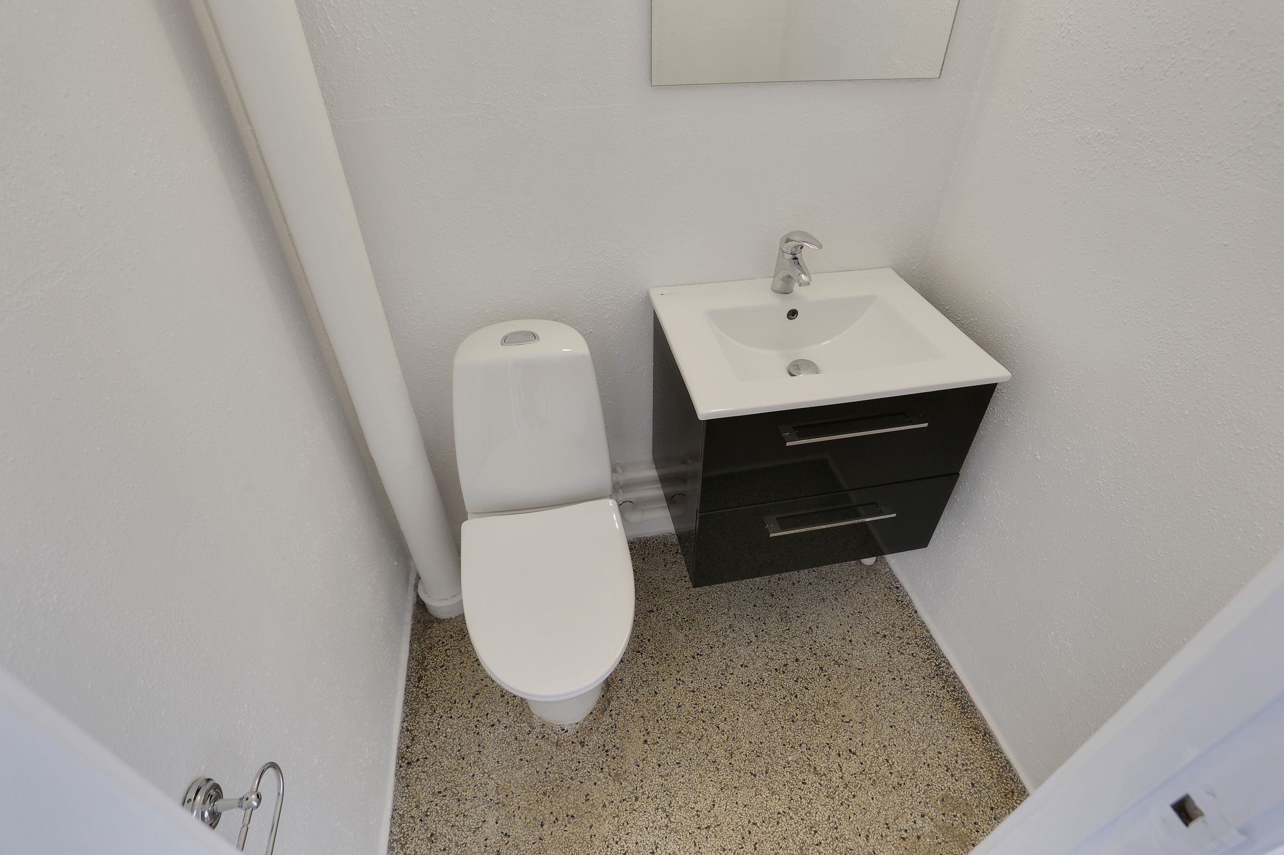 Bad og toilet er praktisk opdelt, hvilket er ideelt i hverdagen og når der er gæster. Elementerne er udskiftet i 2017, og der er mulighed for at sammenlægge rummene til ét større badeværelse, hvis man ønsker det.