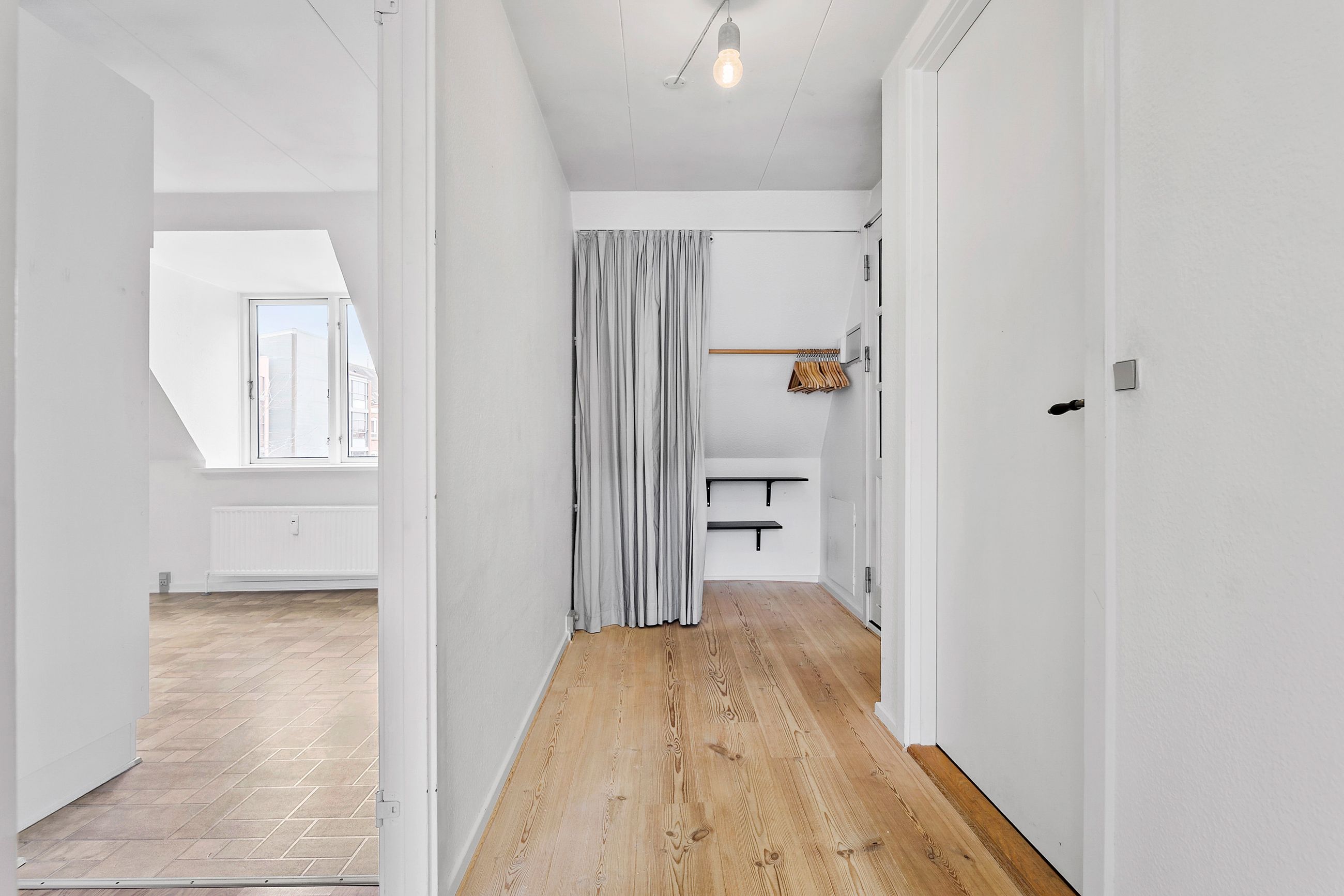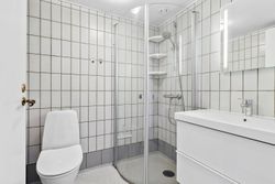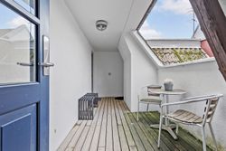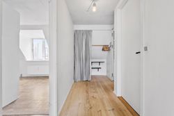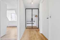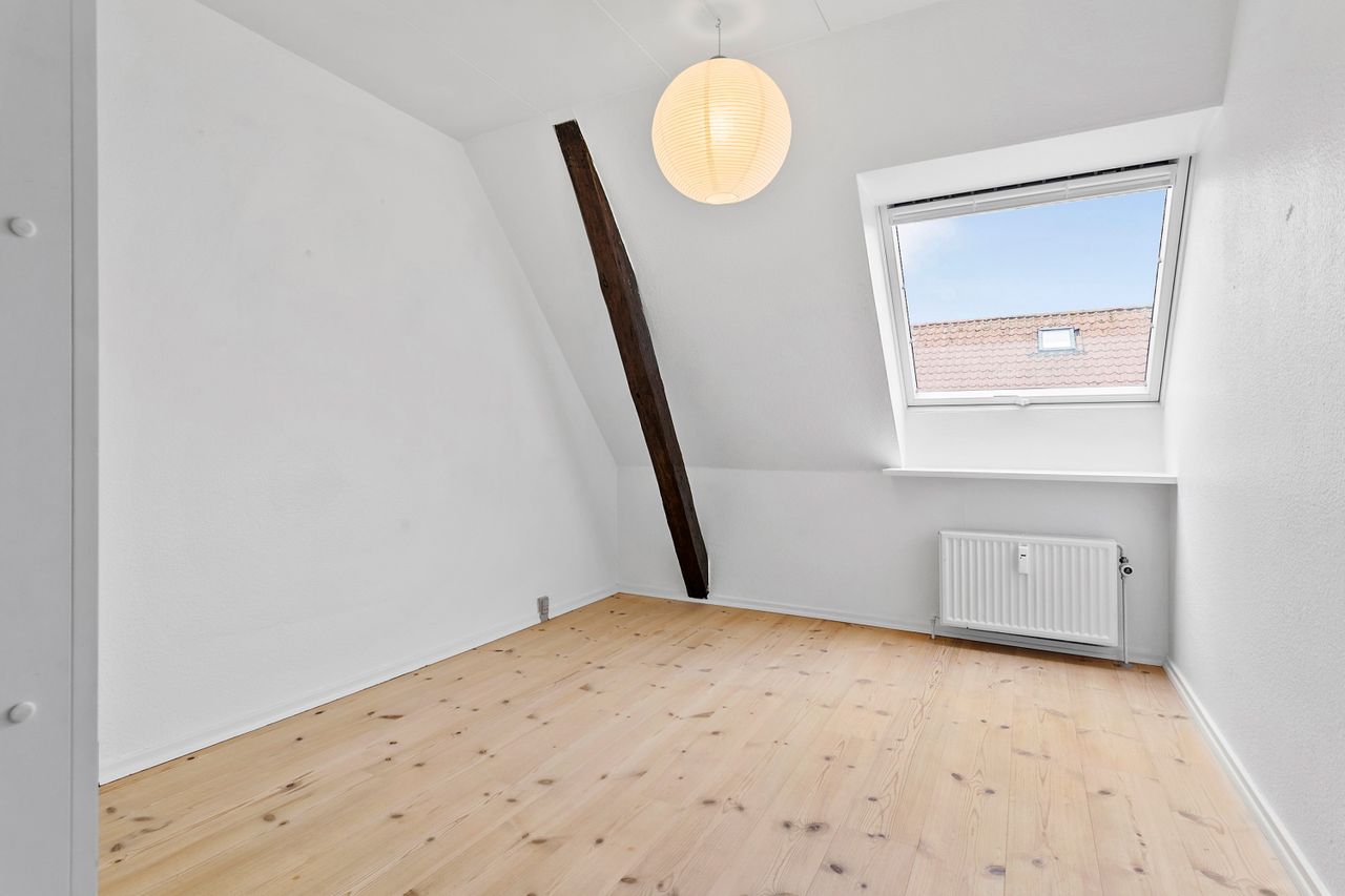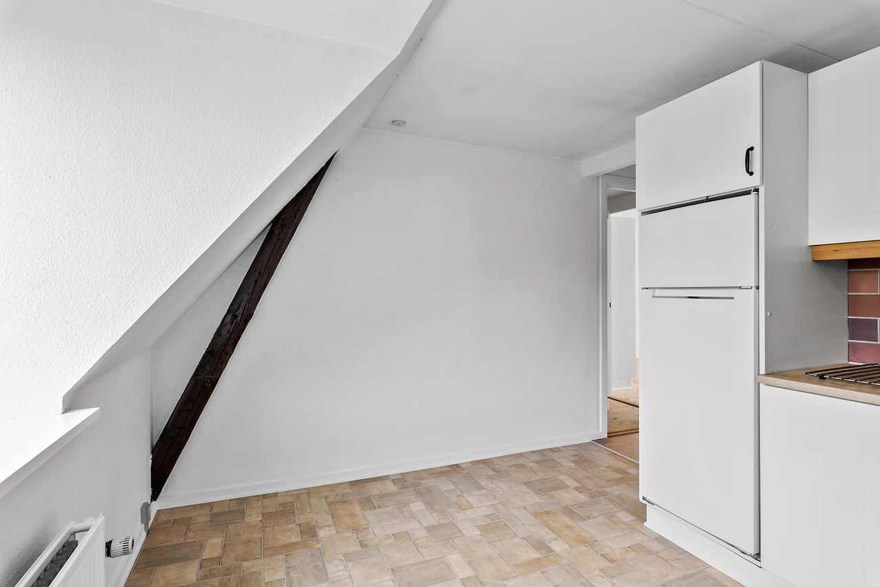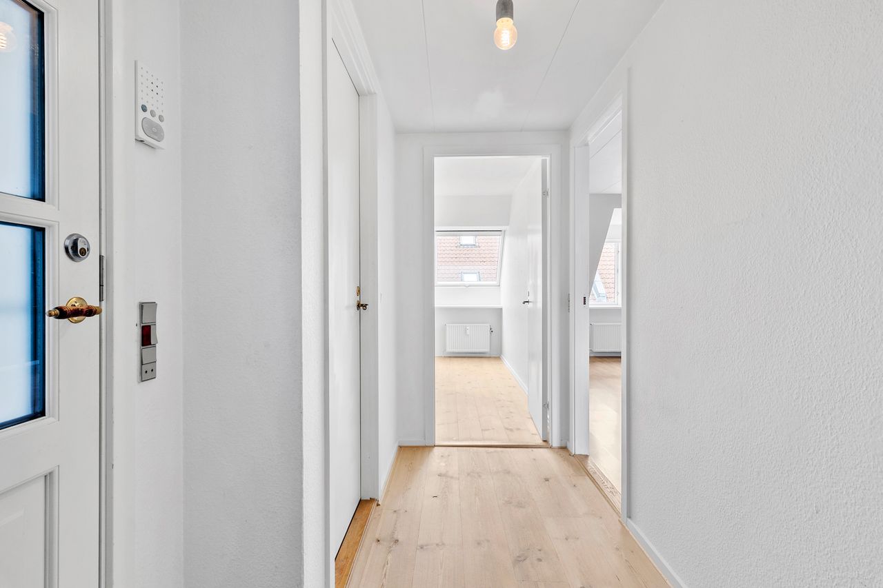 Ved etagen træder man ud på en åben altanrepos, som deles med naboen, og hvor aftensolen kan nydes. Entréen har god plads til overtøj og øvrig opbevaring. Køkkenet ligger med adgang fra fordelingsgangen og her får man alt i hårde hvidevarer og rigelig bordplads til at udfolde sig – der er også plads til et mindre spisebord i køkkenet. På modsatte side findes badeværelset, som er rummeligt og udstyret med en god bruseniche samt et moderniseret bademiljø i lyse farver. Soveværelset ligger mod de rolige omgivelser og har rigelig plads til dobbeltseng og opbevaring. Den nuværende stue har et skønt lysindfald hele dagen fra syd og god plads til både spise- og sofaområde.