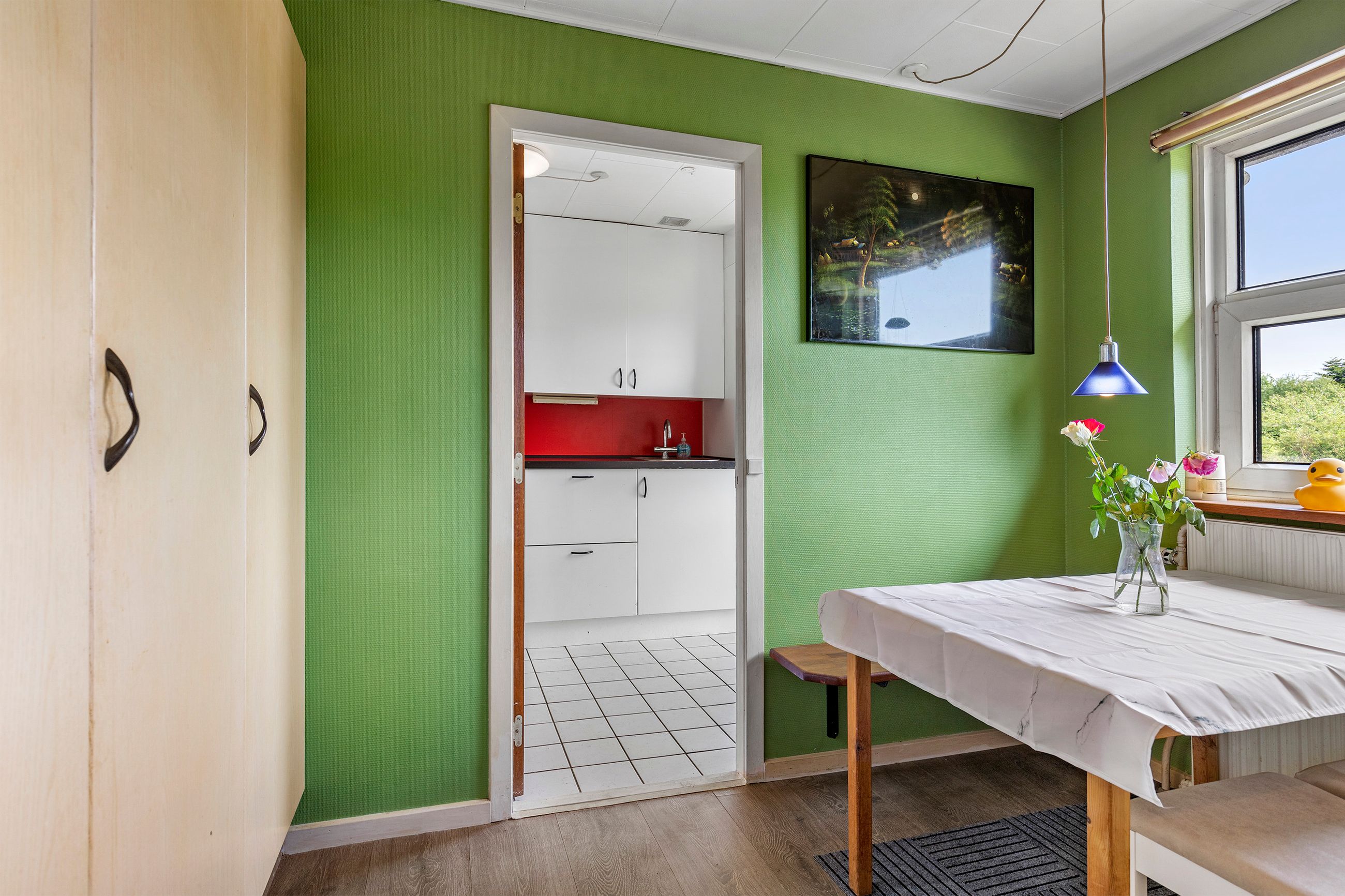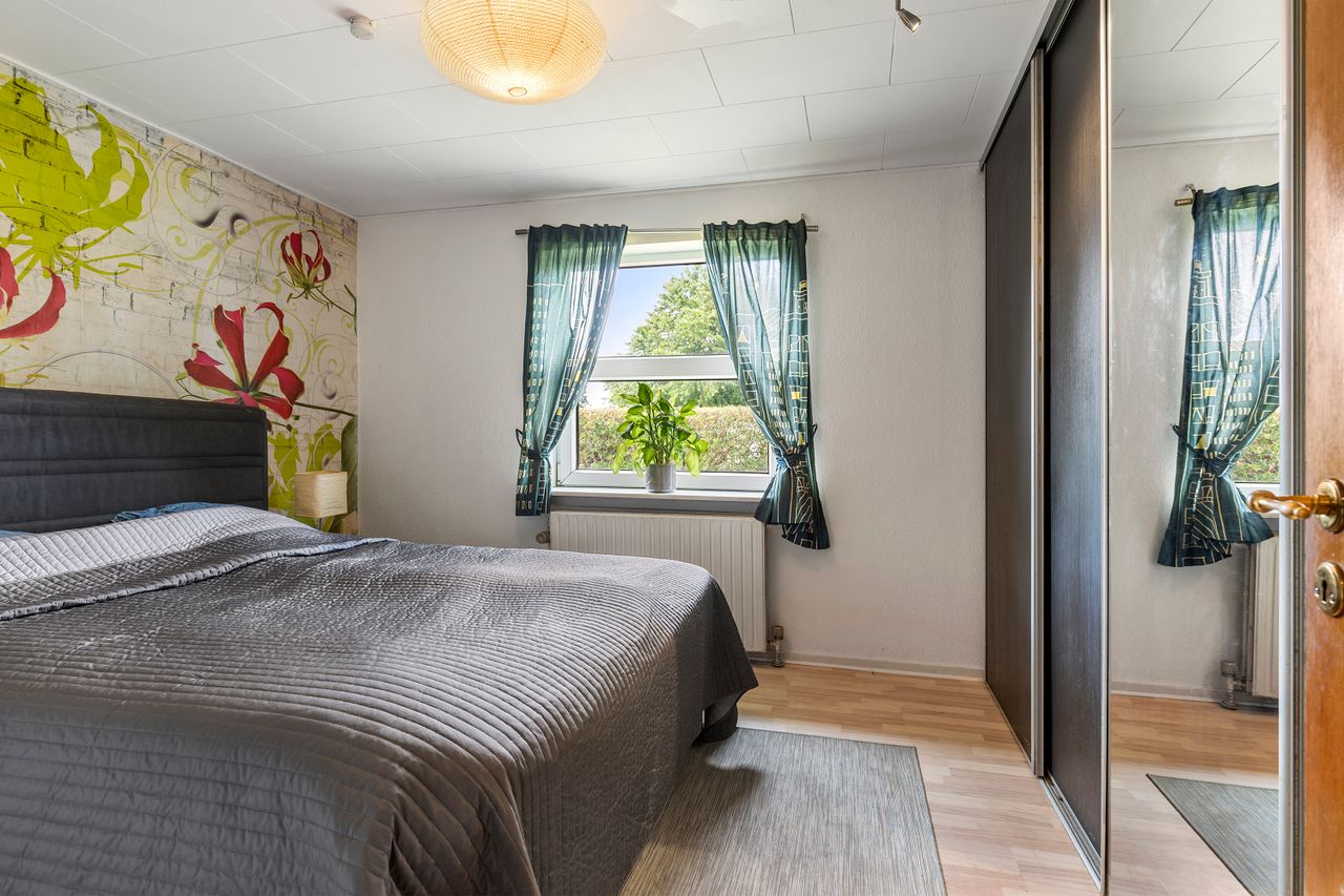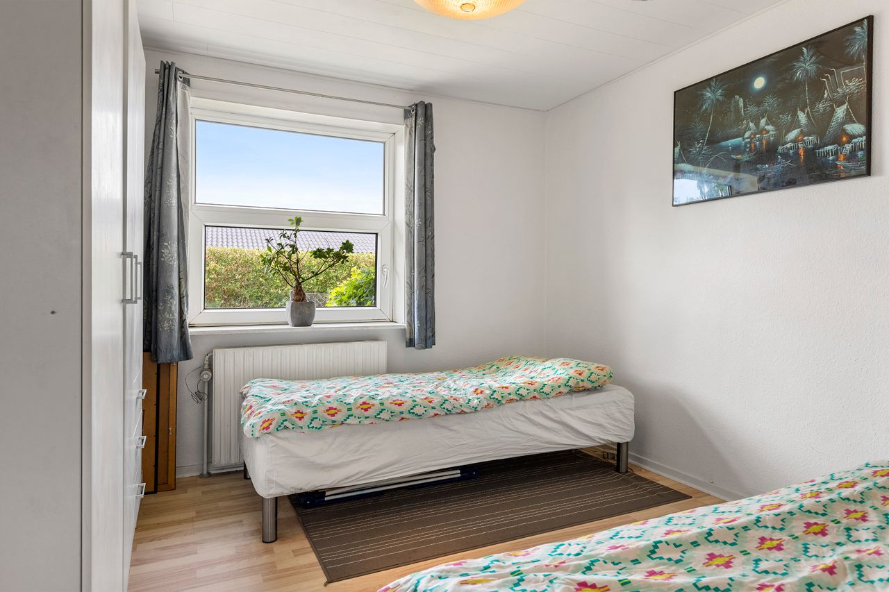 Soveafdelingen ligger samlet i den modsatte ende af huset og består af tre gode, regulære værelser, der alle er velegnede som soveværelser, børneværelser eller hjemmekontor. Derudover får man et pænt badeværelse med bruseniche samt gulvvarme.