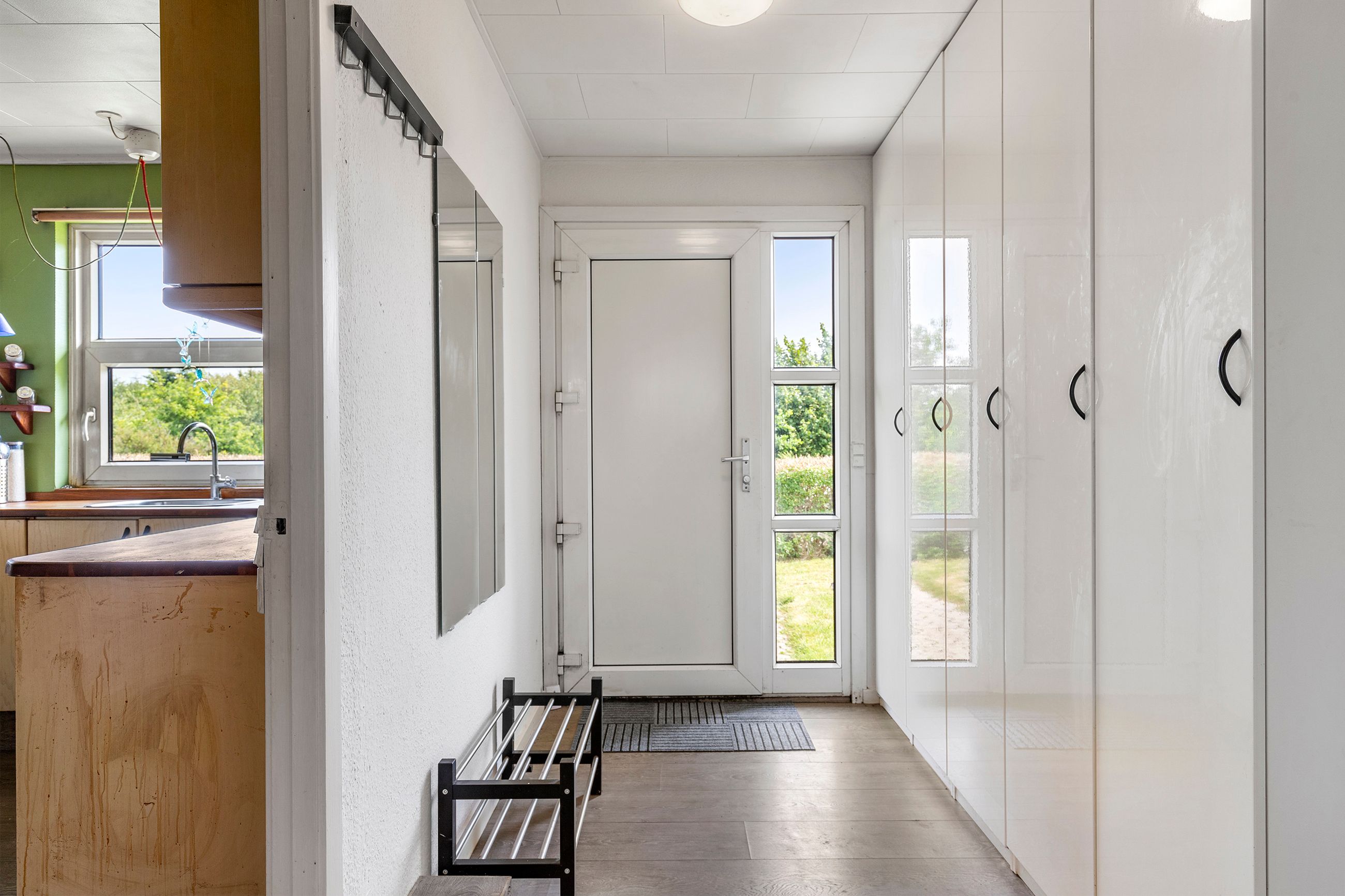 Planløsningen er gennemtænkt, og huset fremstår godt indrettet. Man træder ind i en praktisk entré der er i åben forbindelse med en god fordelingsgang, herfra er der på højre side indgang til et godt rummeligt køkken som desuden har plads til spiseafdeling. Derudover har man lige frem indgang til husets store stue, der med et stort vinduesparti giver masser af lys.