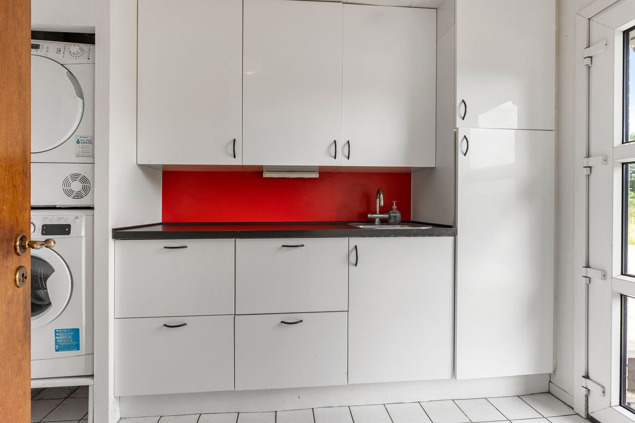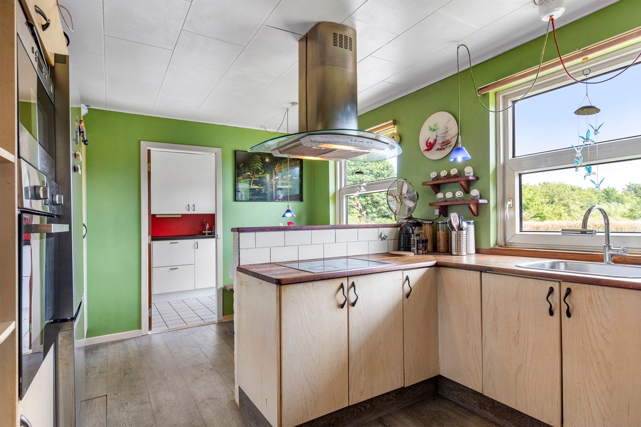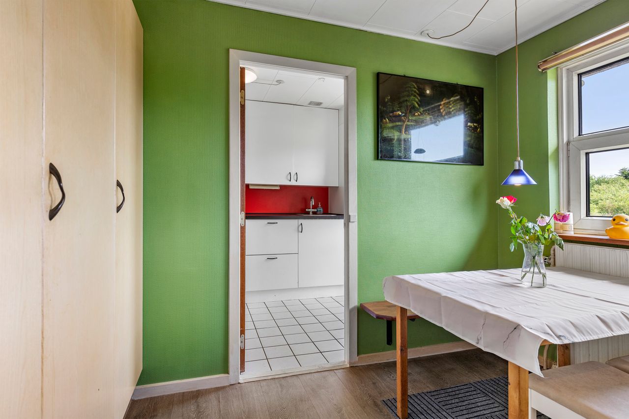 Skulle man have ønske om en større bolig, så er det oplagt at inddrage muret garage samt udhus, der i dag findes under samme tagkonstruktion. Dette vil bringe boligarealet op på kvm. 170.