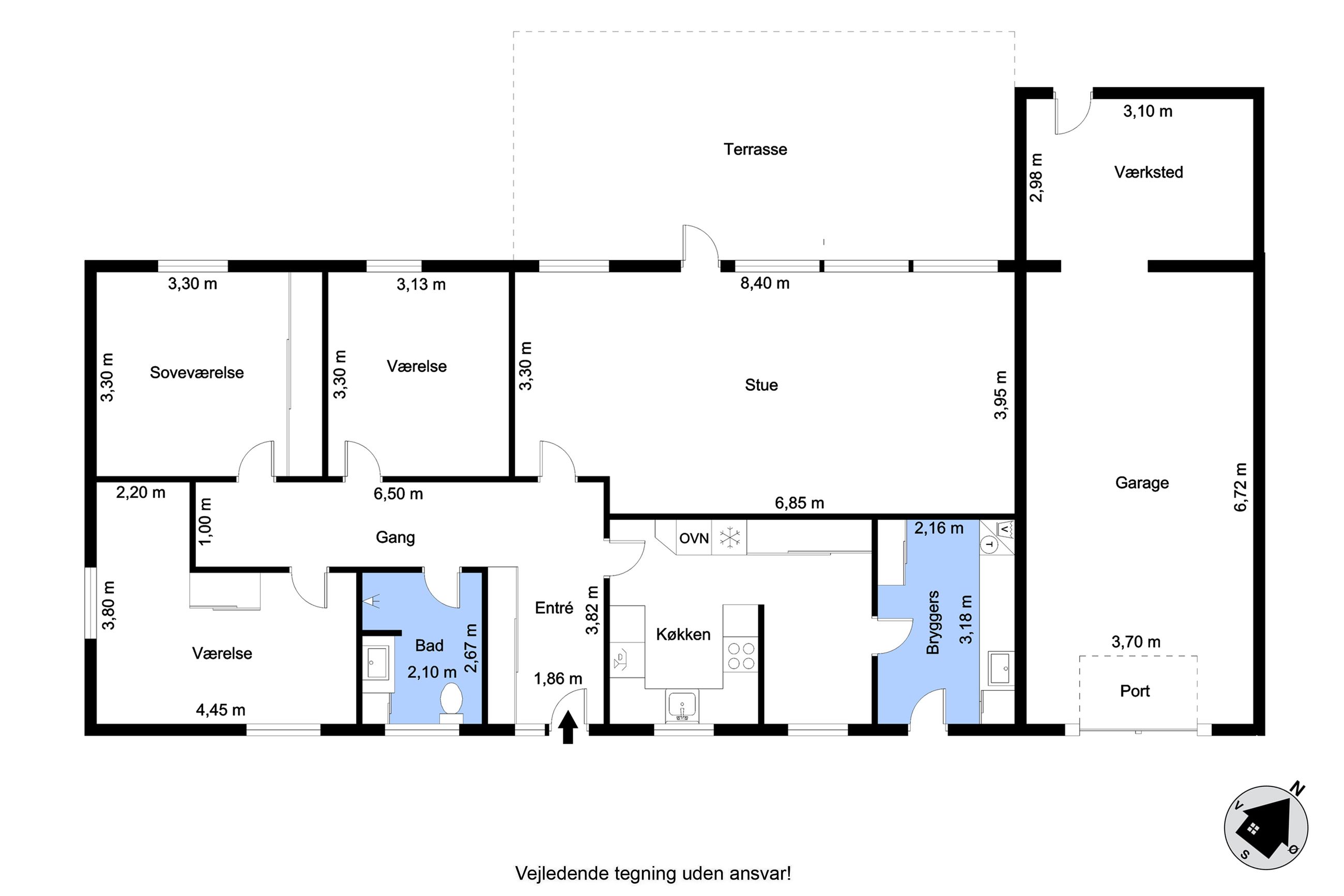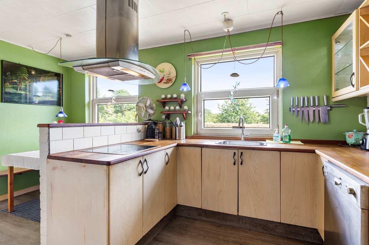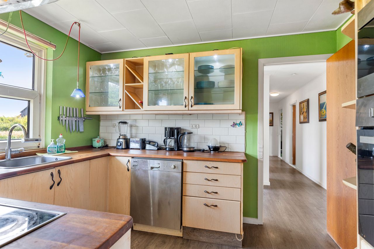 Skulle man have ønske om en større bolig, så er det oplagt at inddrage muret garage samt udhus, der i dag findes under samme tagkonstruktion. Dette vil bringe boligarealet op på kvm. 170.