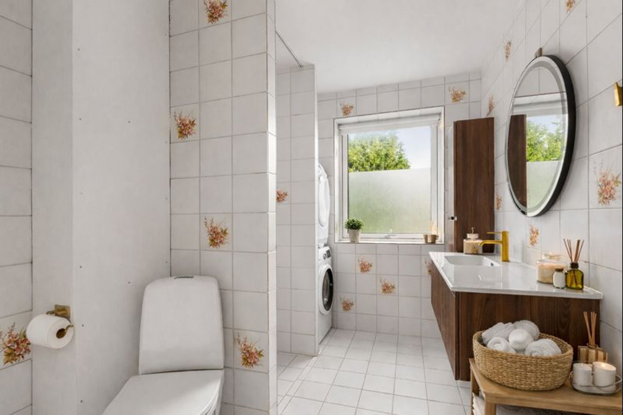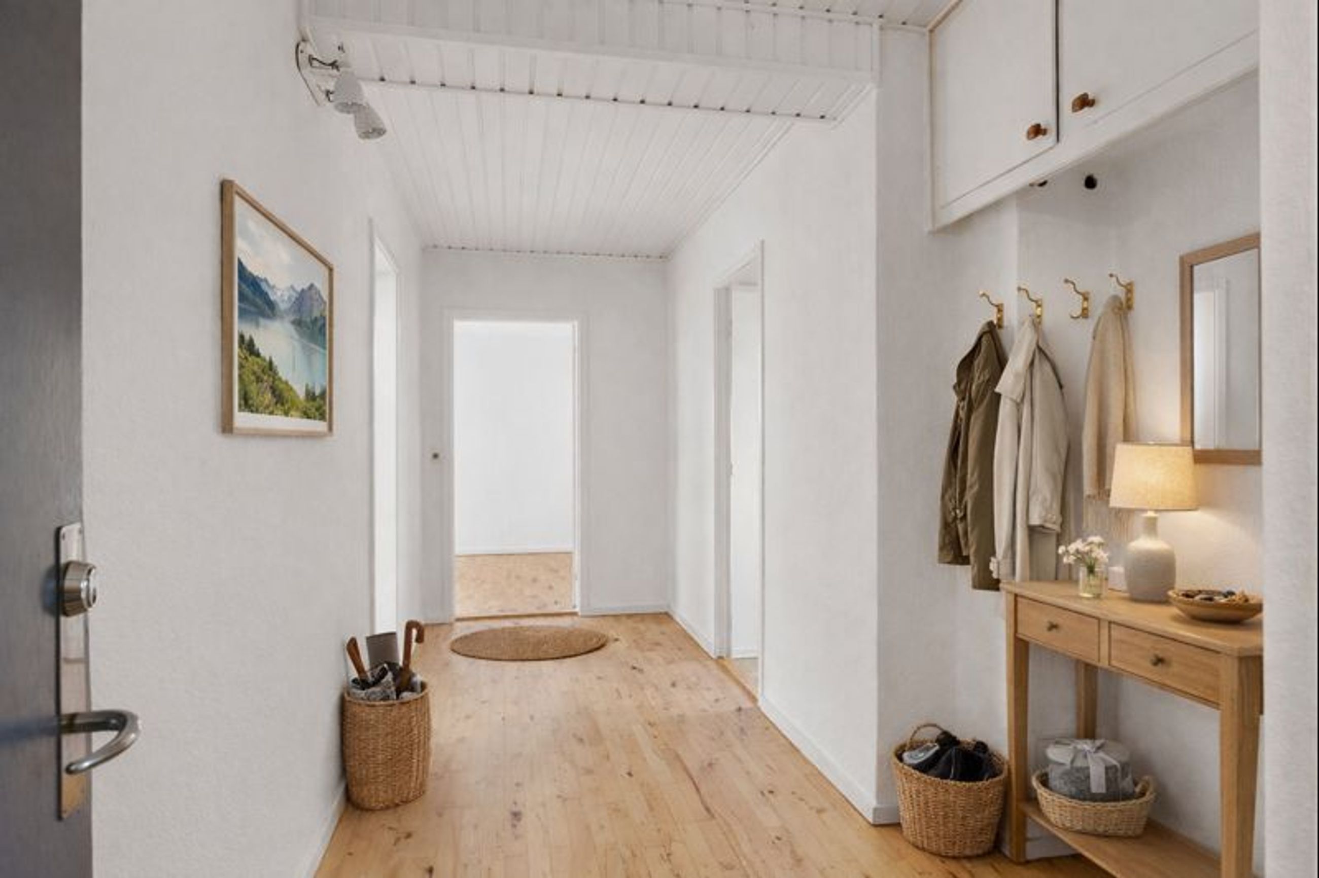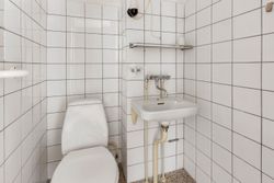 Inden døre venter en særdeles rummelig og veldisponeret bolig uden spildplads. Lejligheden er indflytningsklar med nymalede overflader og nyligt afslibede gulve. Man bydes velkommen i en rummelig entré med god plads til overtøj. Herfra er der adgang til boligens store badeværelse, som er sammenlagt og derfor byder på god plads samt vaskefaciliteter. Badeværelset fremstår i lyse klinker og skønt lysindfald, samt byder på muret bruseniche, gulvvarme og nyt badmiljø i flot design. Derudover findes et ekstra toilet – ligeledes holdt i lyse og tidløse materialer.