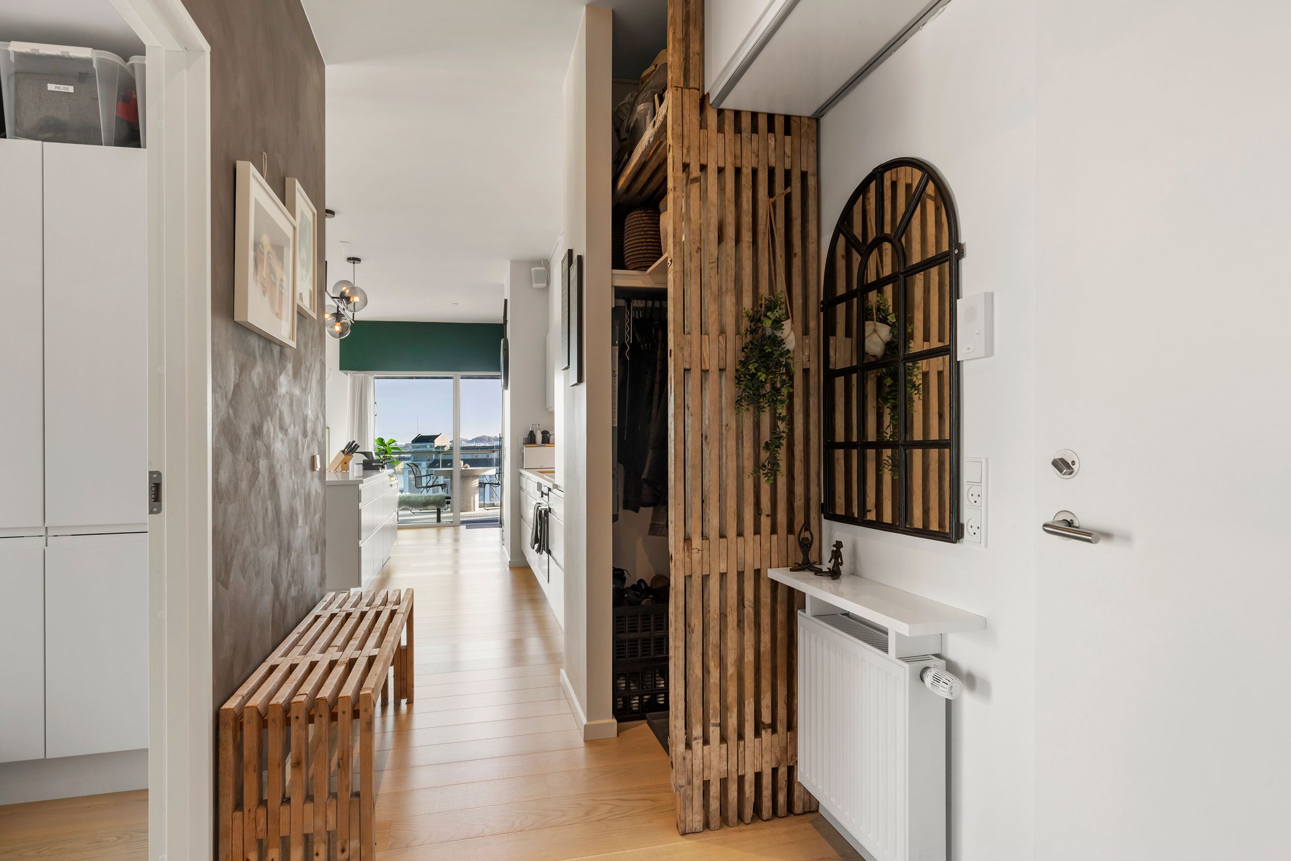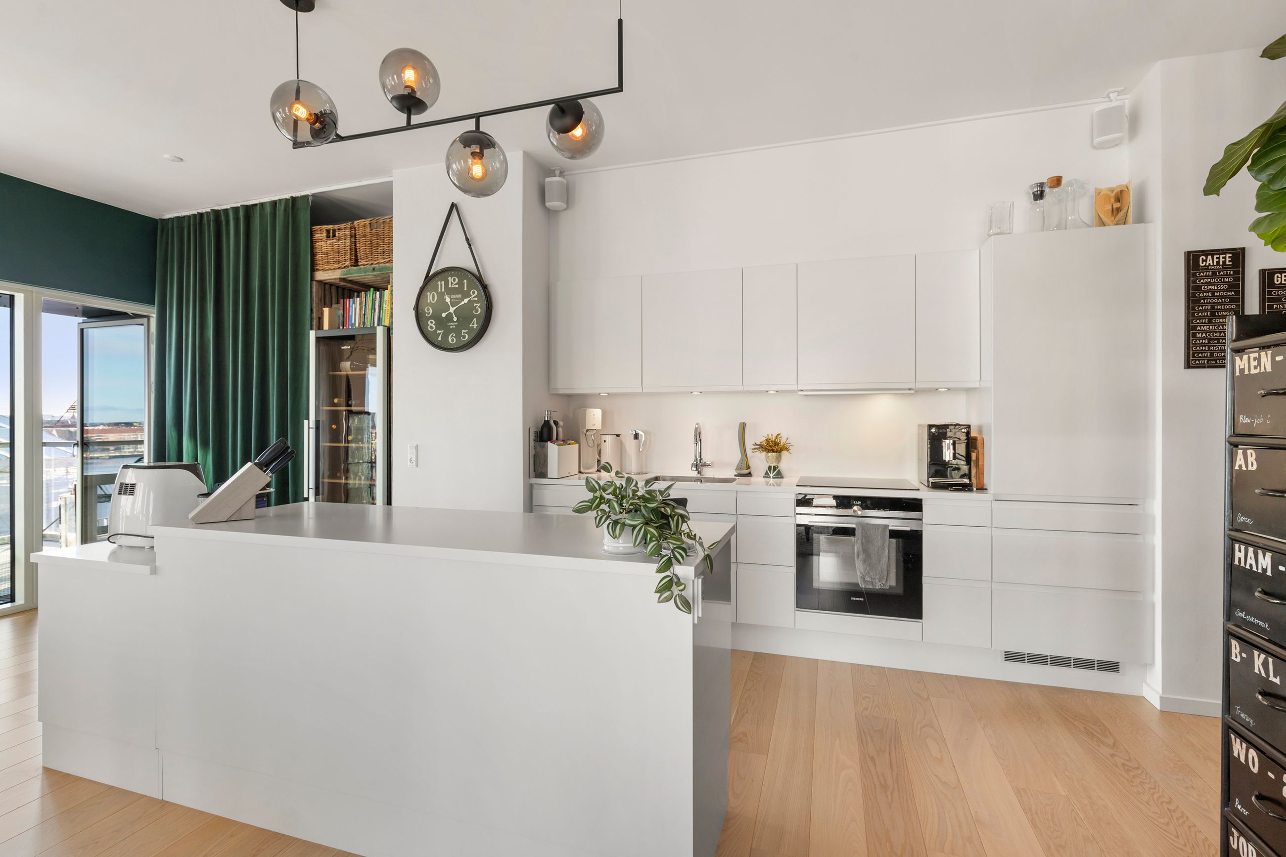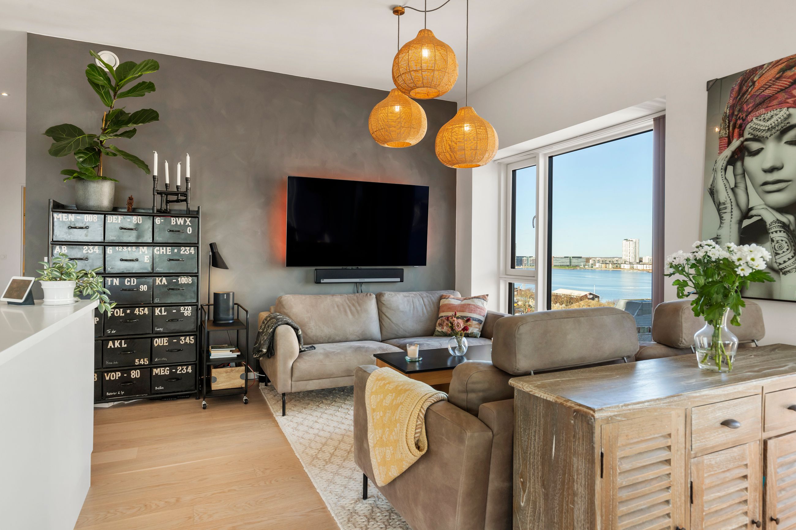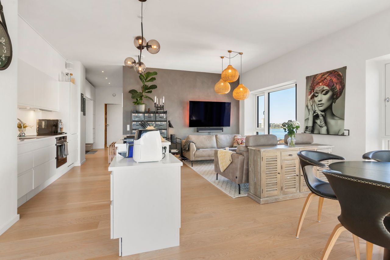 Lejligheden står som ved opførelsen og er derudover spændende indrettet af ejer. Planløsningen er gennemtænkt og byder på minimalt med spildplads. Der et helt fantastiske opholdsrum, hvor køkken-alrum og stue er samlet i ét stort, lyst og yderst lækkert miljø. De store vinduespartier giver masser af naturligt lys og udnytter den smukke udsigt for fulde drøn – et rum man bare har lyst til at opholde sig i fra morgen til aften.