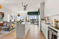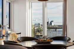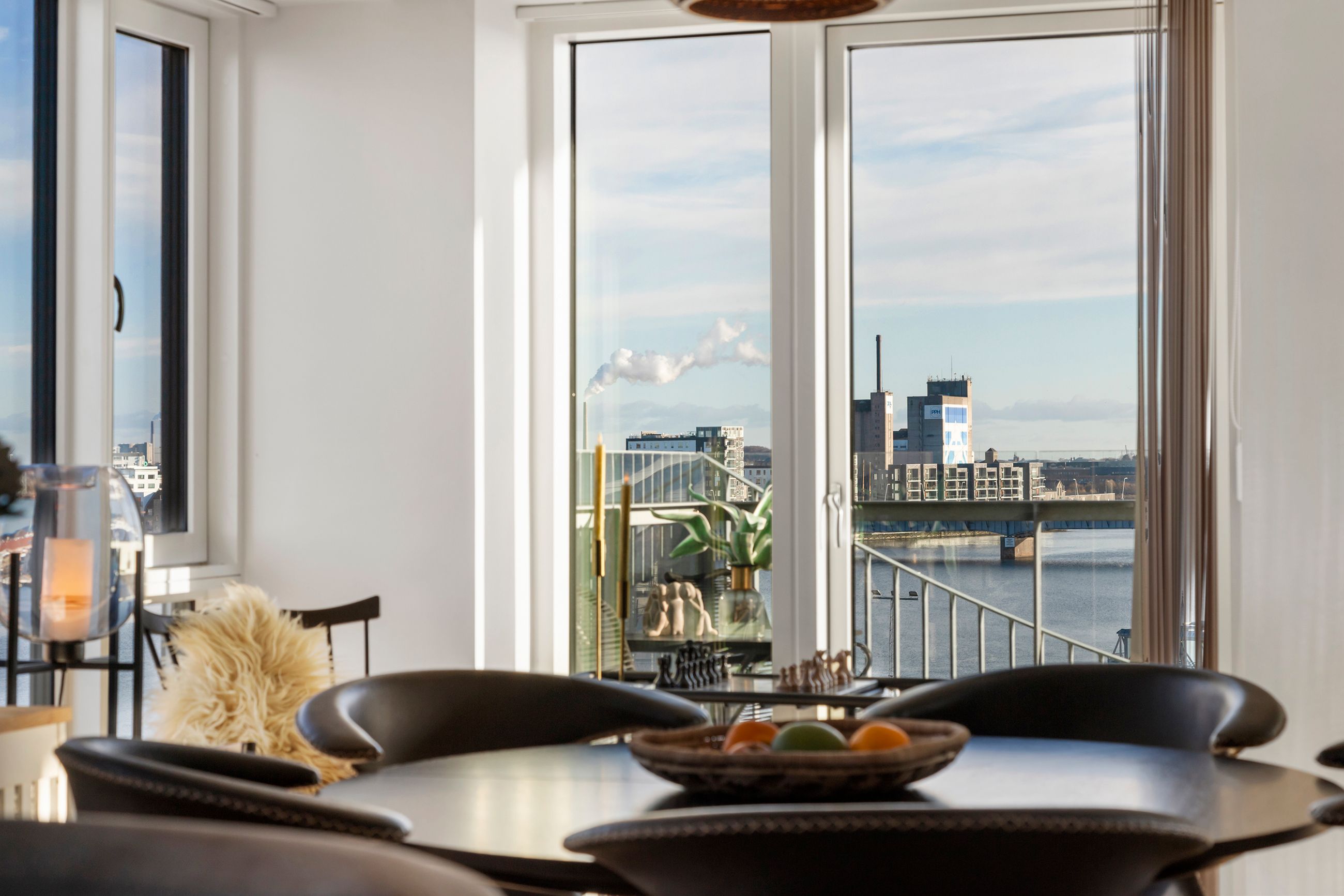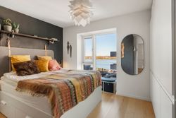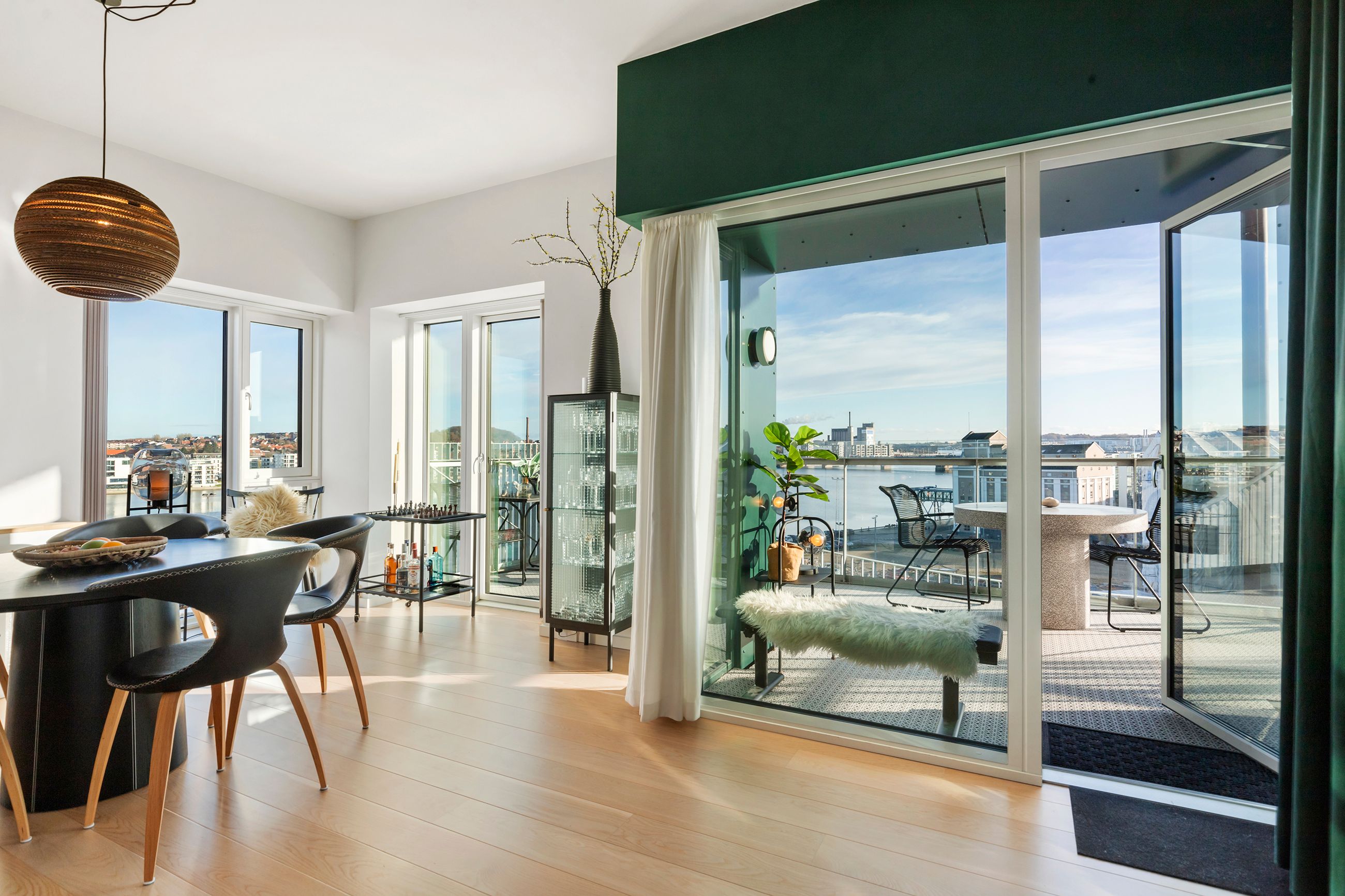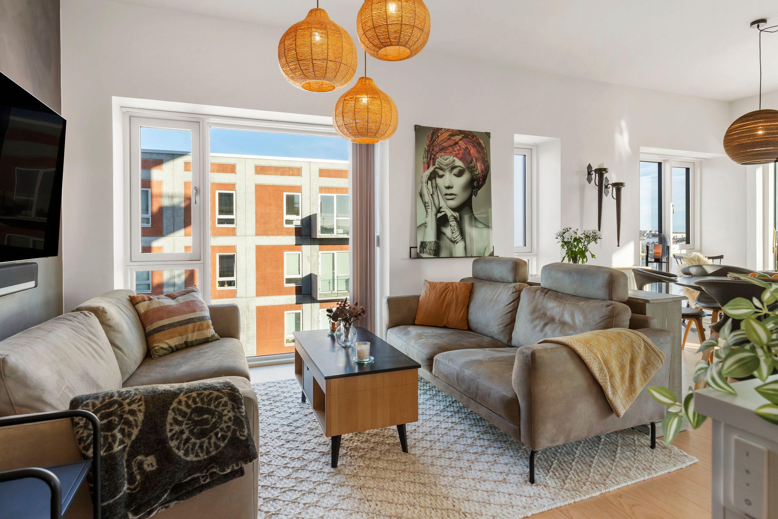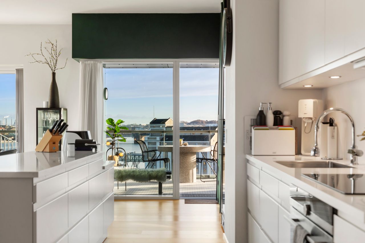 Lejligheden står som ved opførelsen og er derudover spændende indrettet af ejer. Planløsningen er gennemtænkt og byder på minimalt med spildplads. Der et helt fantastiske opholdsrum, hvor køkken-alrum og stue er samlet i ét stort, lyst og yderst lækkert miljø. De store vinduespartier giver masser af naturligt lys og udnytter den smukke udsigt for fulde drøn – et rum man bare har lyst til at opholde sig i fra morgen til aften.