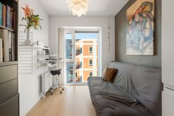 Lejligheden indeholder desuden to gode værelser med flere indretningsmuligheder samt skabe og ikke mindst et moderne badeværelse med separat bruseniche og kvalitetsmaterialer. Til boligen hører også et praktisk kælderrum.