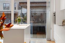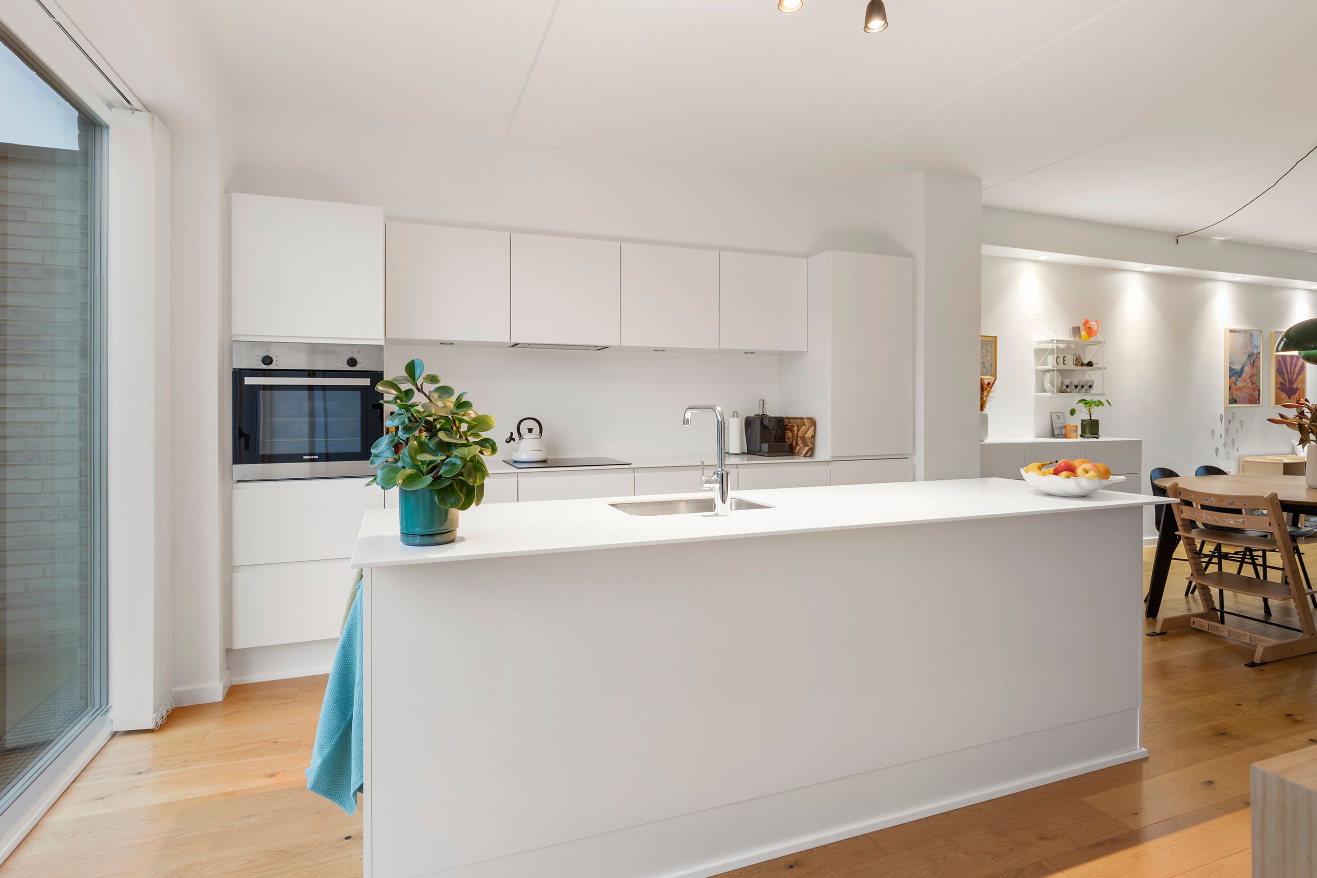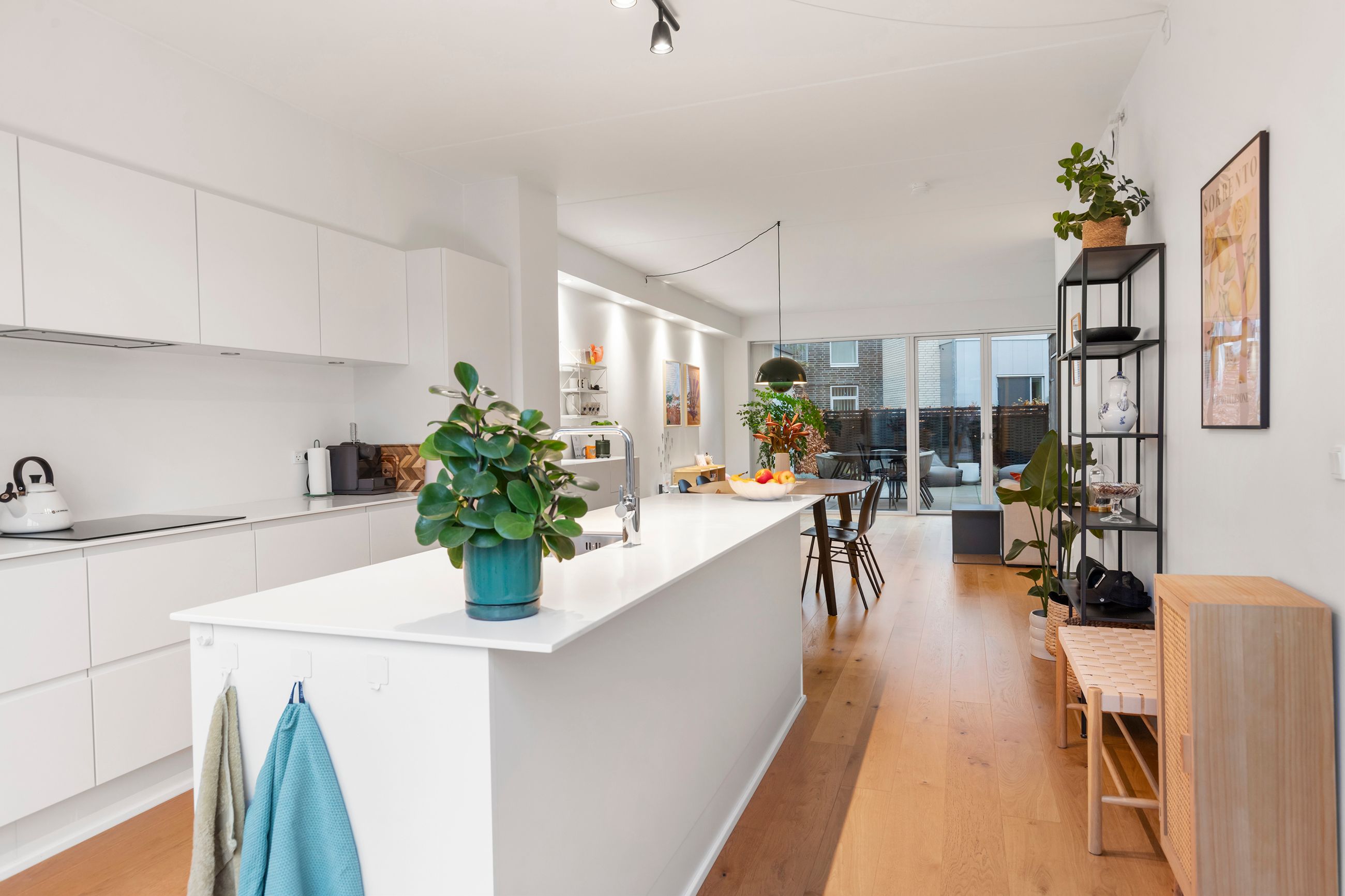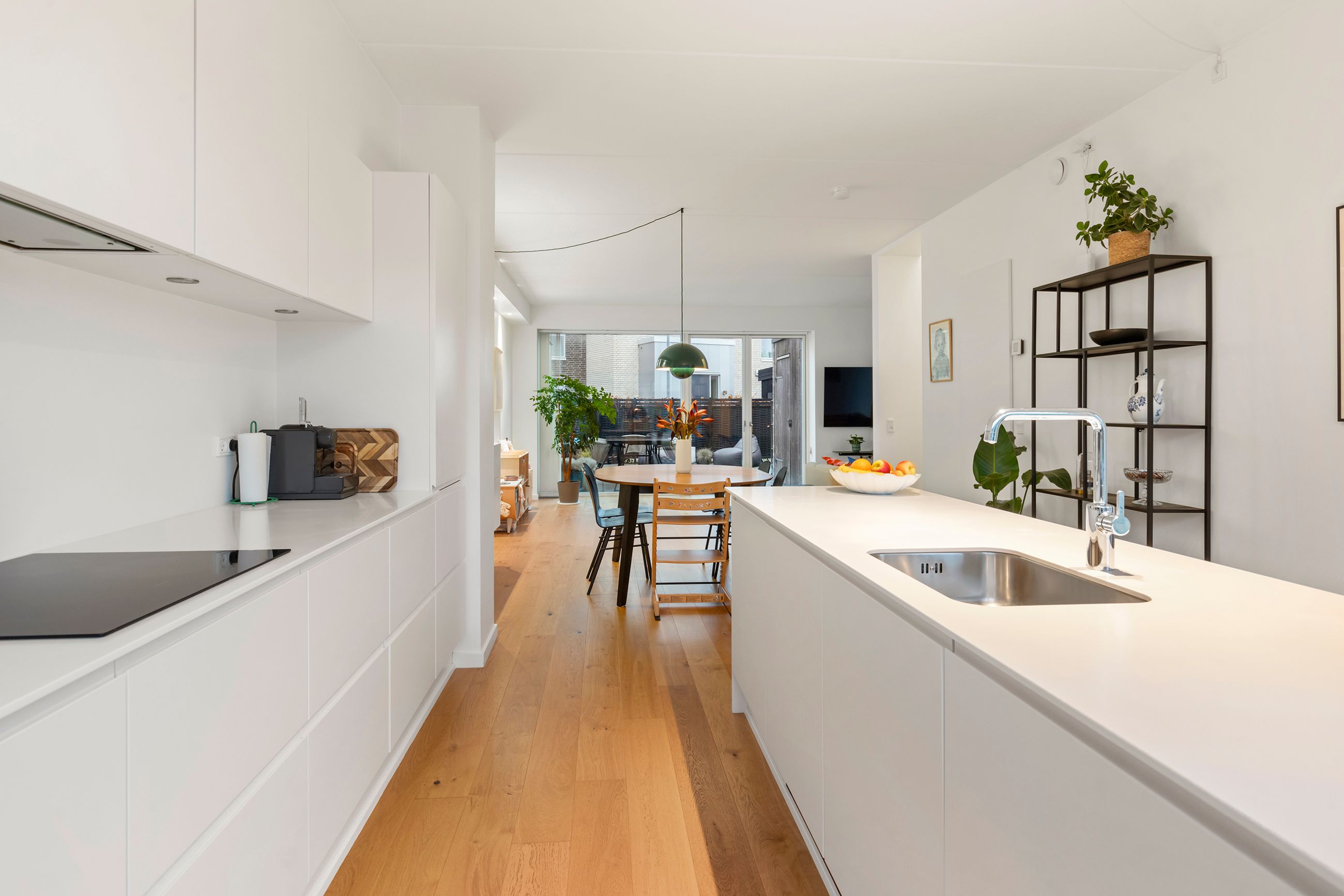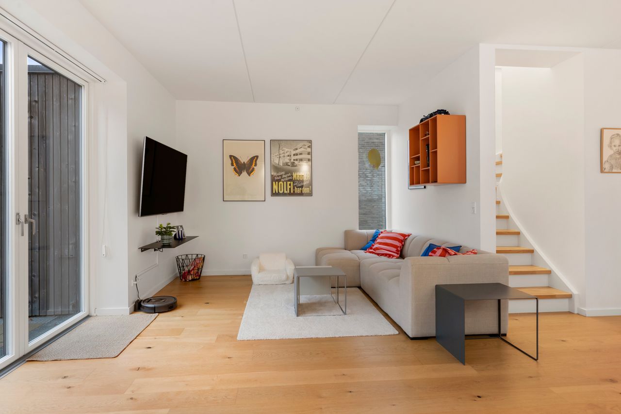 Boligens hjerte er det åbne køkken-alrum med køkkenø, alt i hårde hvidevarer og en eksklusiv Corian-bordplade. Rummet har en skøn sammenhæng til vinkelstuen, hvor store vinduespartier giver et flot lysindfald og mulighed for at indrette lige efter behov. Fra stuen er der direkte adgang til den sydvendte gårdhave, som fungerer som et ekstra opholdsrum i sommerhalvåret.