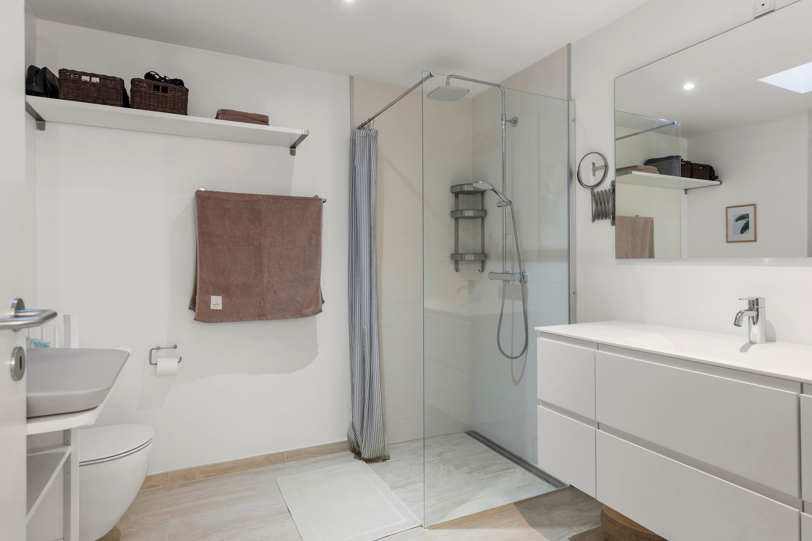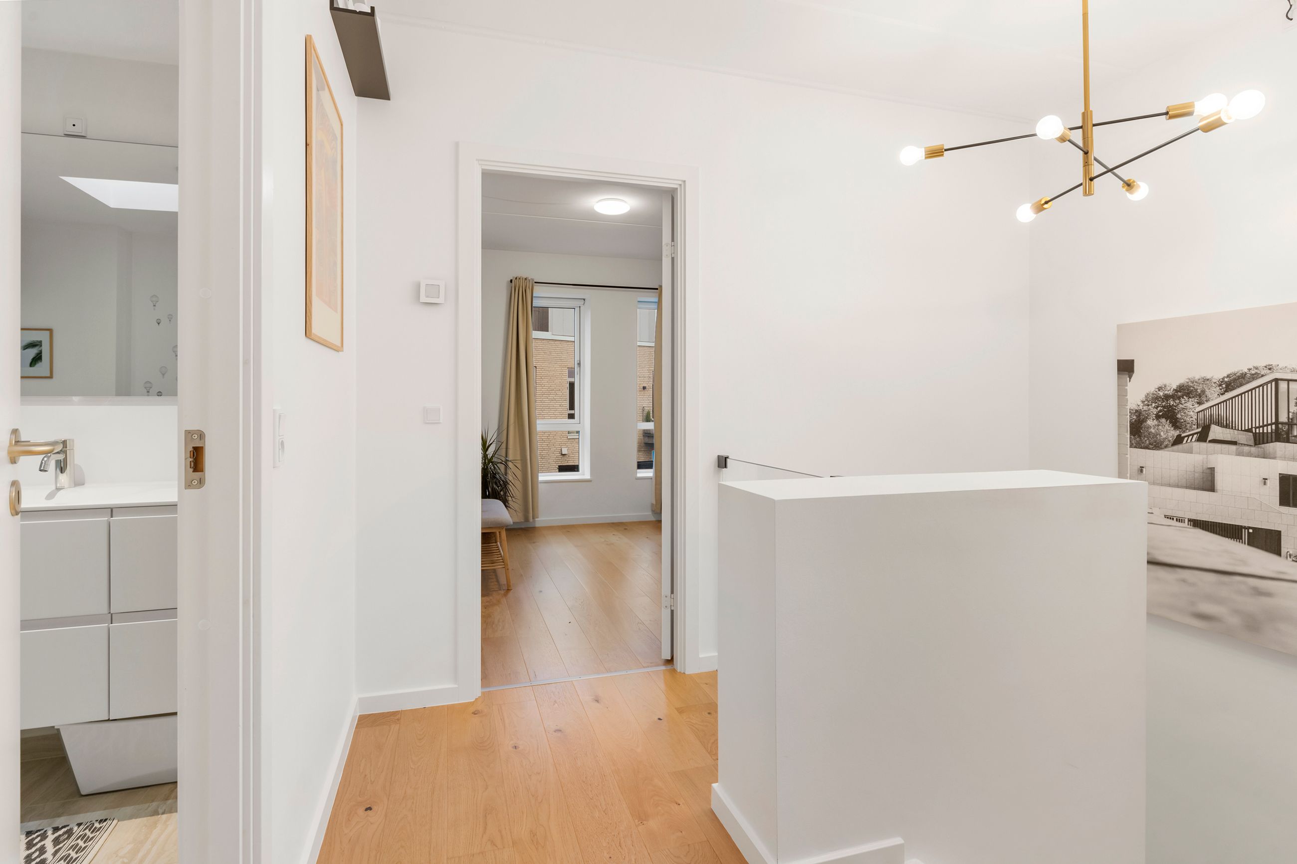 Første salen imponerer med et elegant trappeløb med ovenlys. Her finder I to store og indbydende børneværelser. Et lyst og lækkert badeværelse med stor bruseniche ligger centralt på etagen – også her med ovenlys. Forældresoveværelset fuldendes af et separat påklædningsrum med masser af skabsplads.