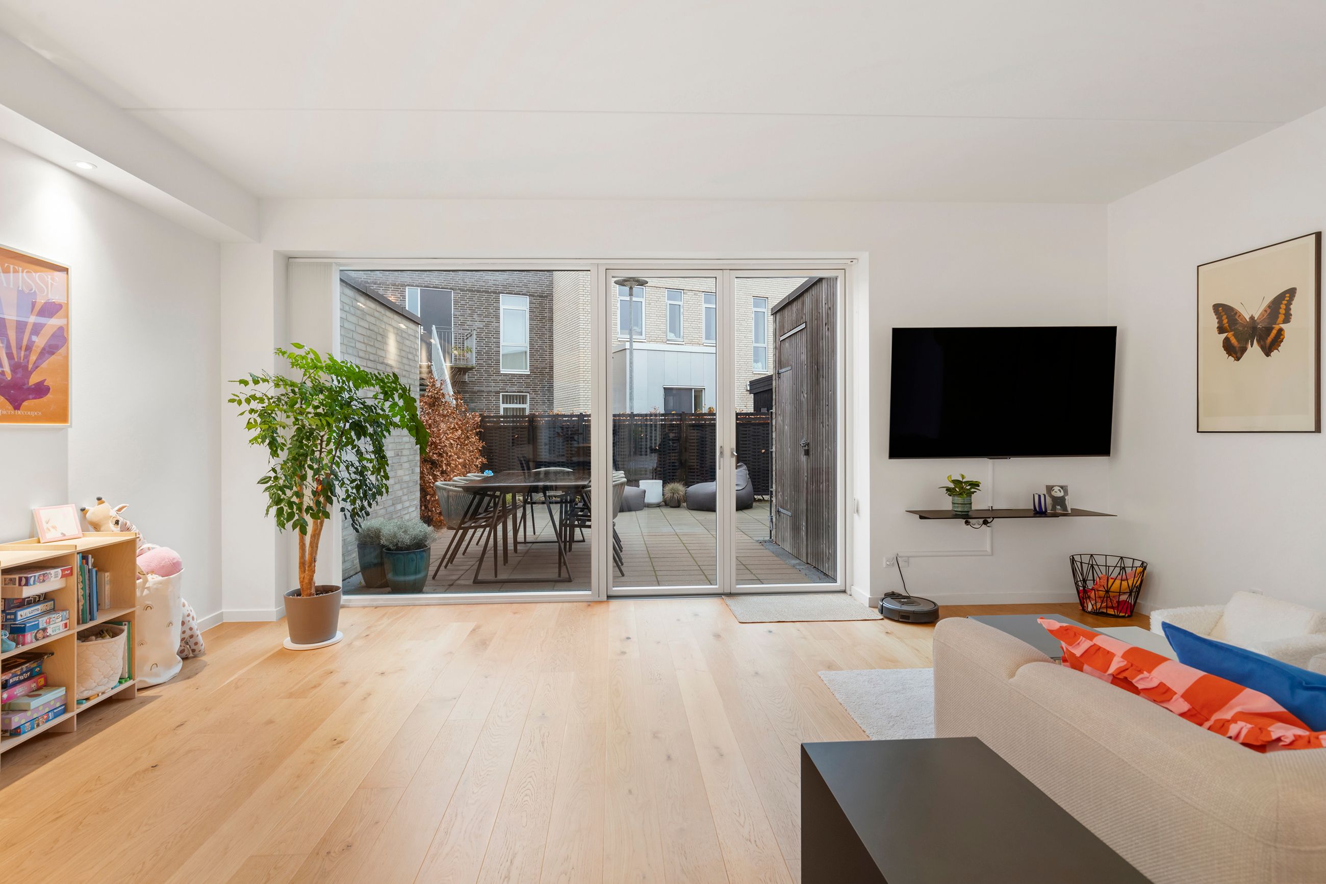 Til boligen hører en stor carport forberedt til ladestander, og mod syd findes en solrig, lukket gårdhave med et praktisk udhus. Det perfekte private uderum.
