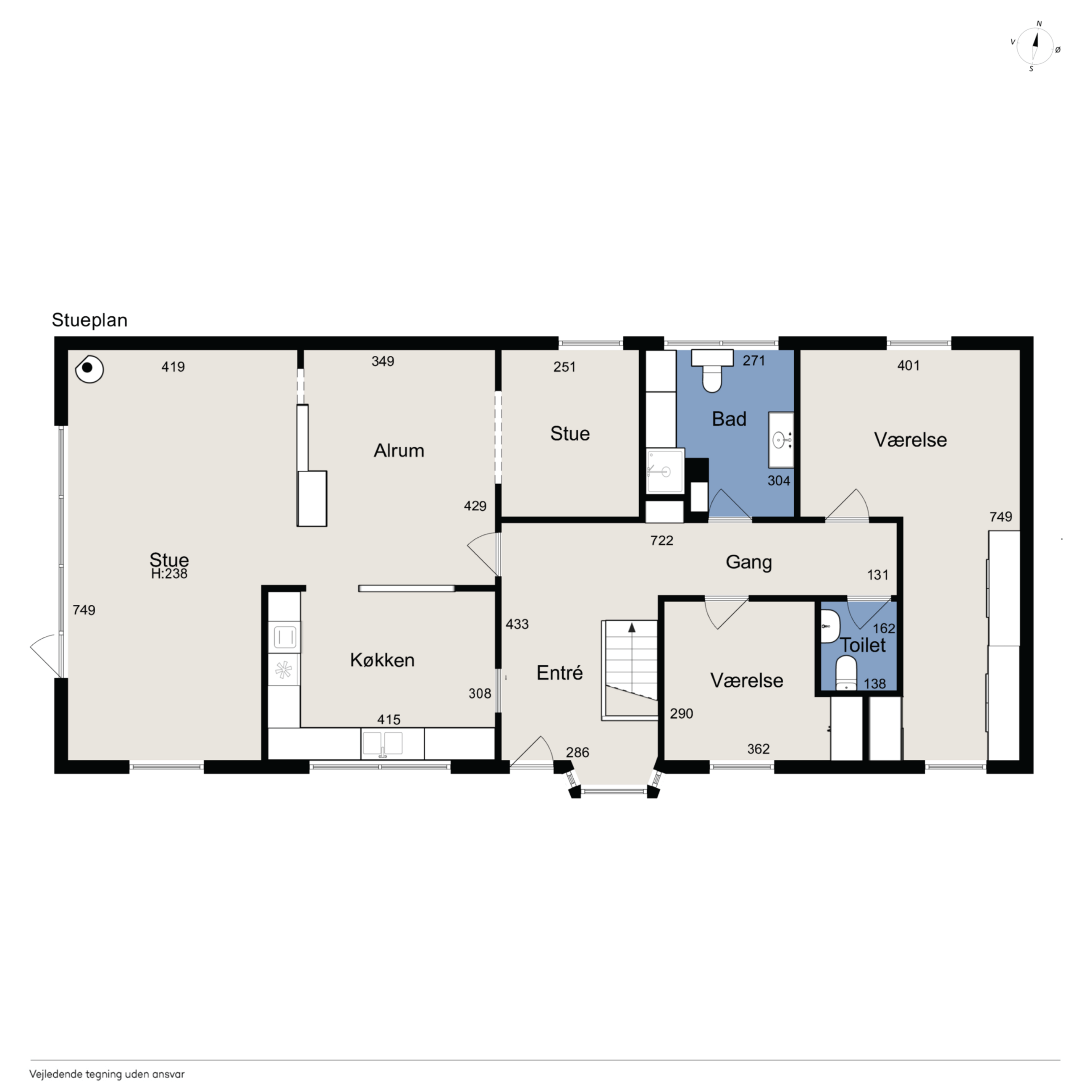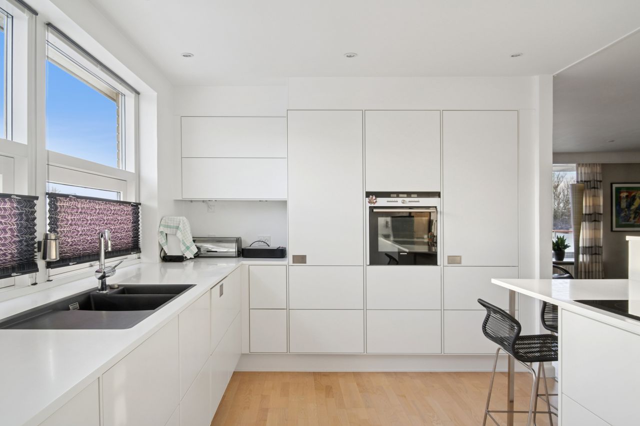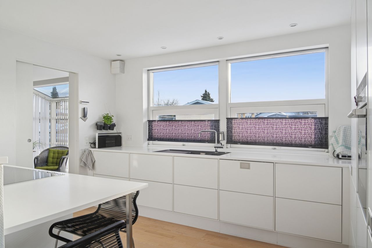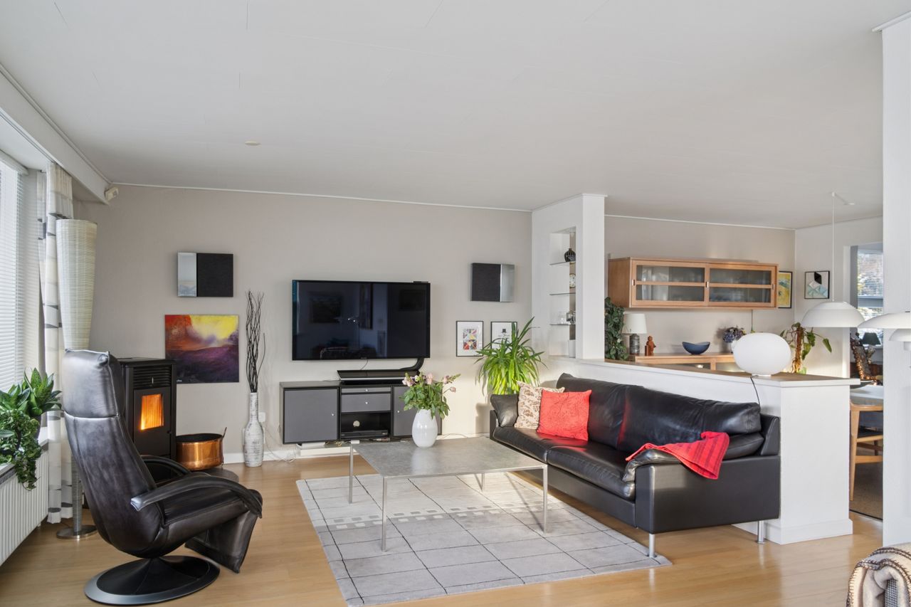 Stueplan byder på en rummelig og lys entré med flot glaskarnap, der giver et indbydende førstehåndsindtryk. Herfra er der adgang til et lækkert Svane-køkken i åben forbindelse med alrum og opholdsrum – et naturligt samlingspunkt i boligen. Den lyse stue er indrettet med pilleovn og har direkte udgang til et nyere, overdækket og syd/vestvendt terrassemiljø, som skaber hyggelige rammer for både hverdag og gæster.