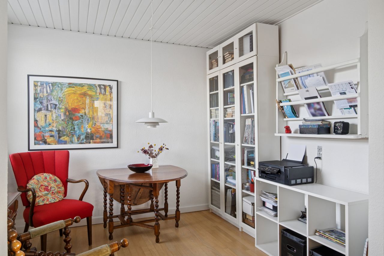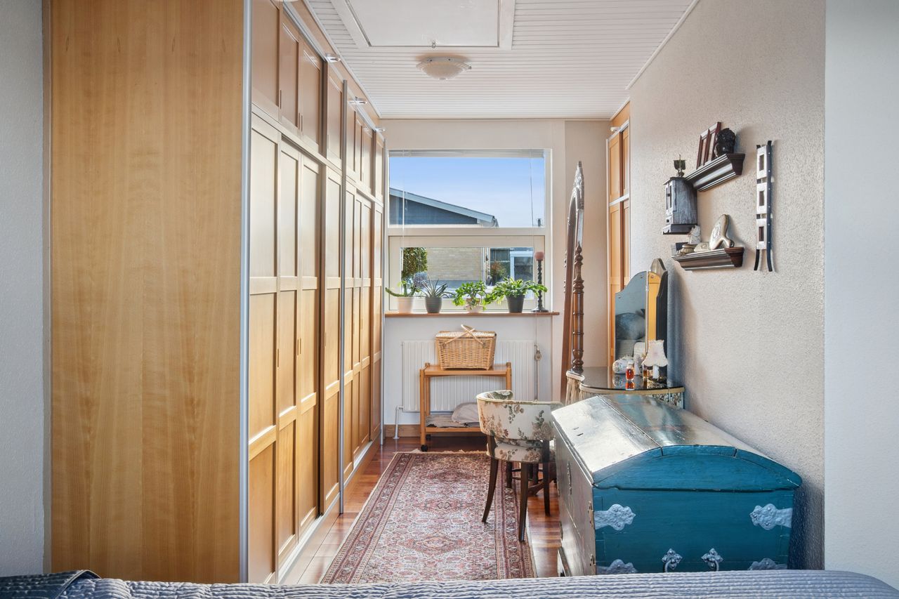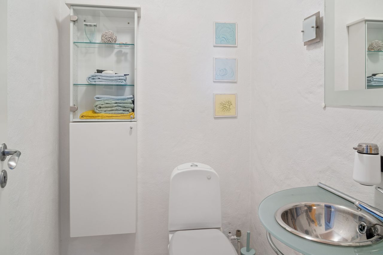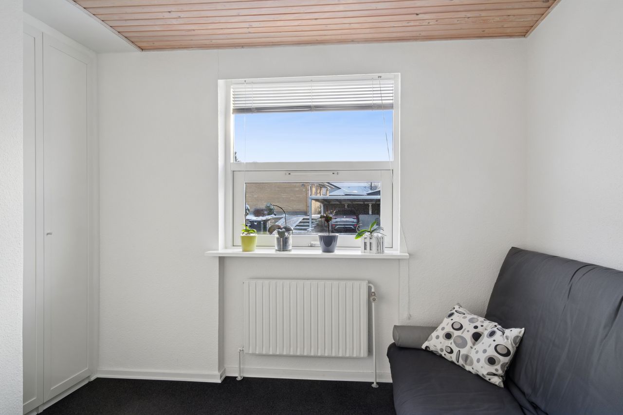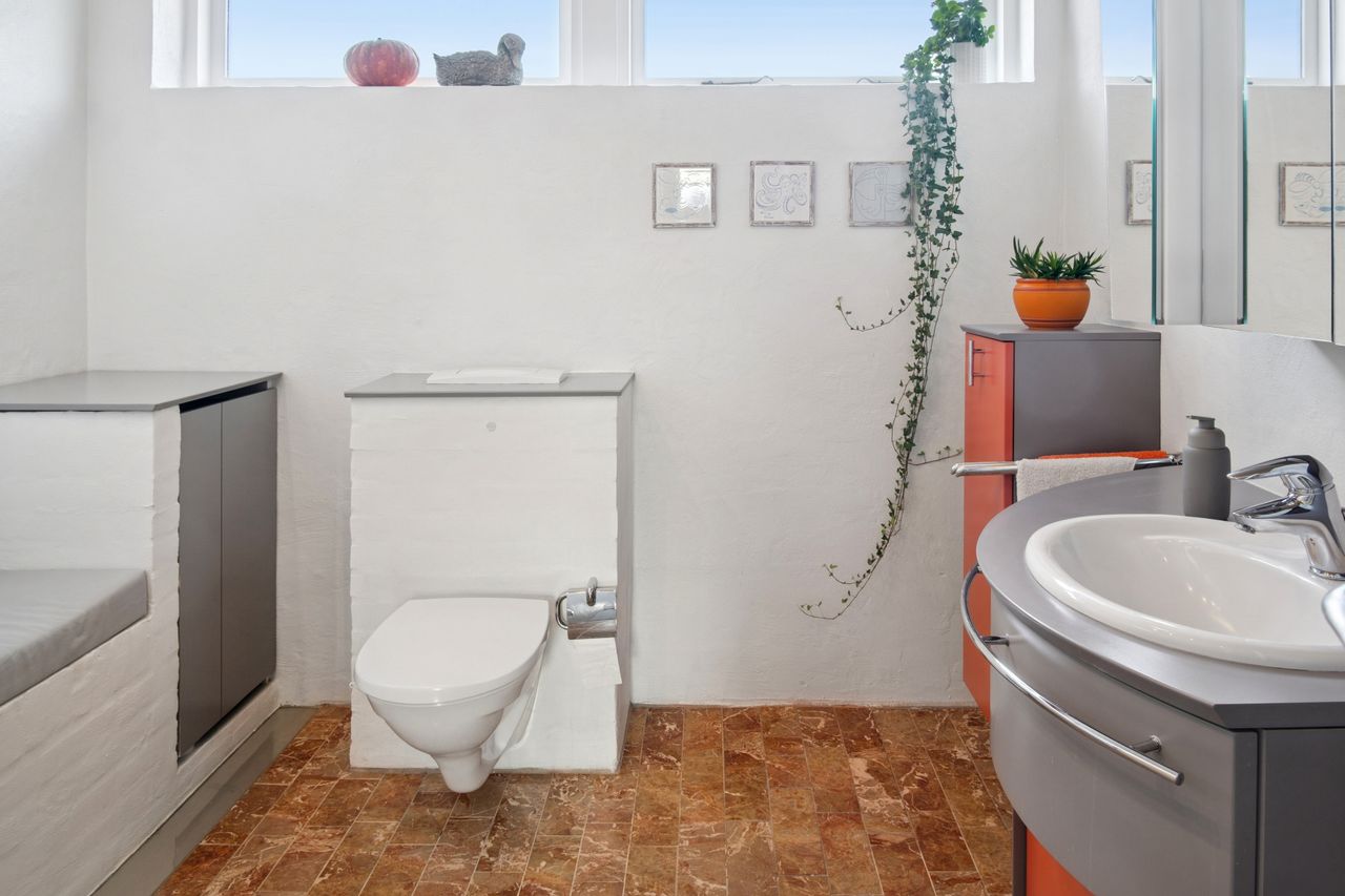 Stueetagen rummer desuden et pænt badeværelse med væghængt toilet og bruseniche, soveværelse med adgang til stort walk-in-closet (tidligere værelse), yderligere et værelse samt gæstetoilet. Planløsningen giver mulighed for nemt at etablere ét eller to ekstra værelser, hvis behovet opstår. For købere med mod på et lidt større projekt er der desuden mulighed for at etablere udgang fra soveværelset direkte til baghaven, hvilket giver oplagte rammer for en privat terrasse med morgensol mod øst.