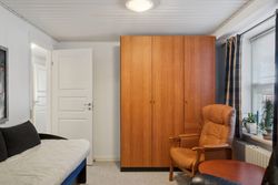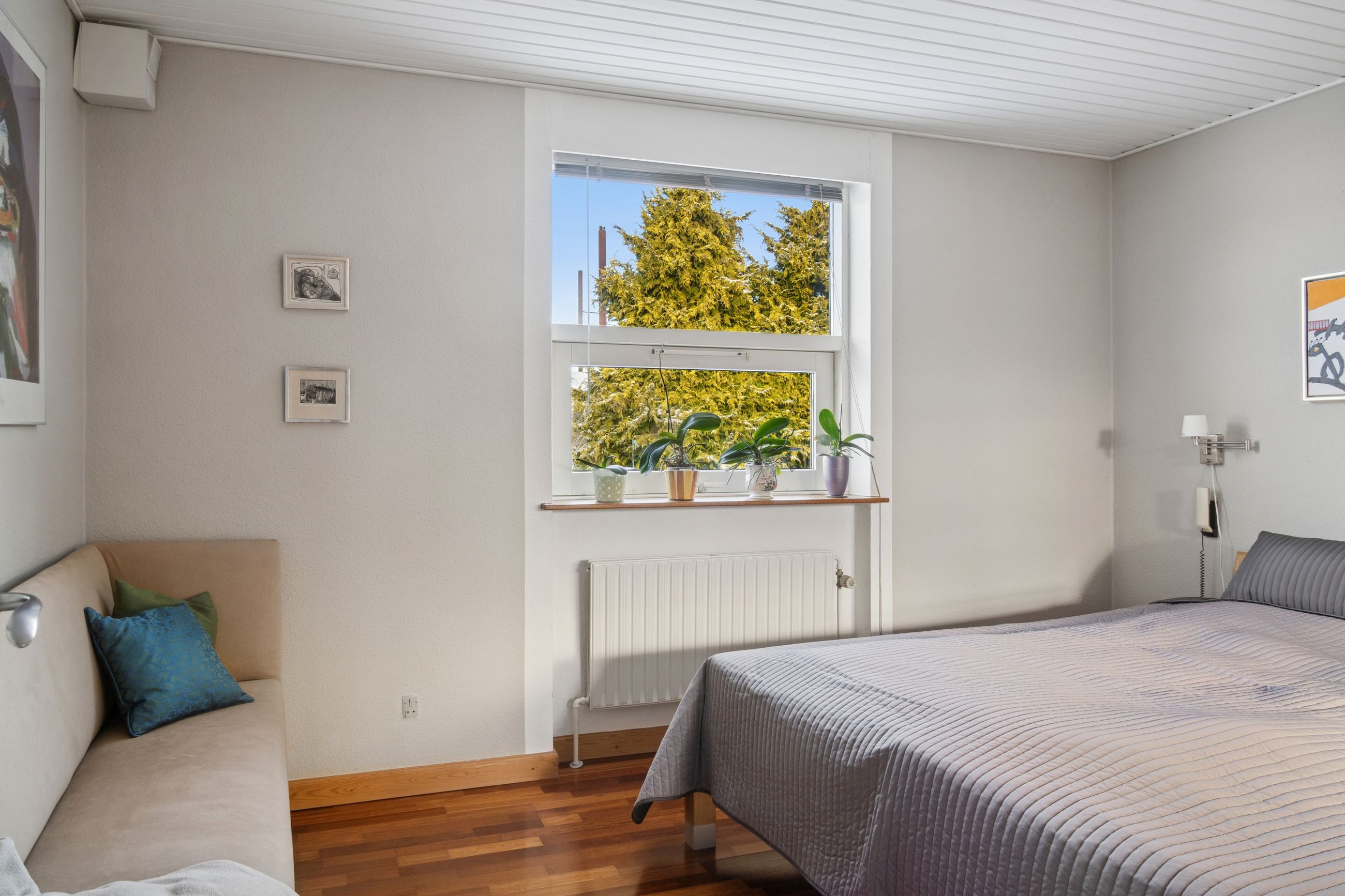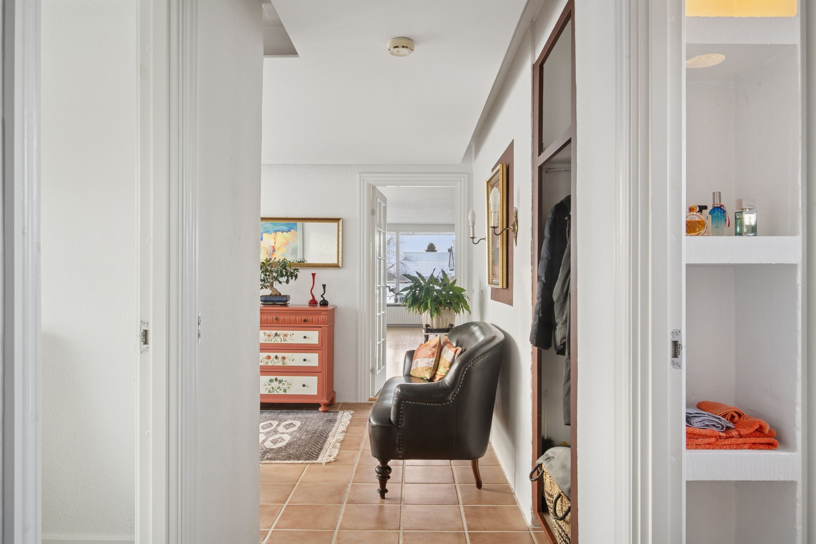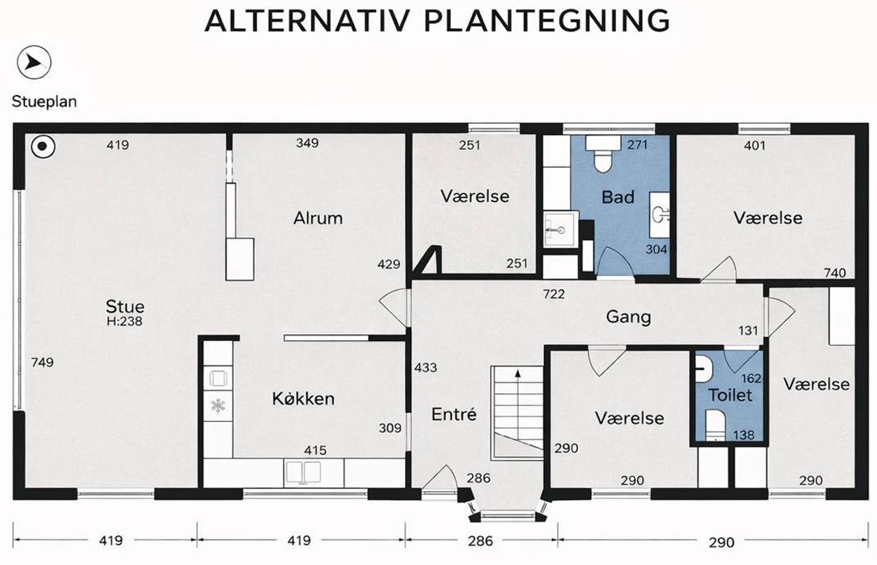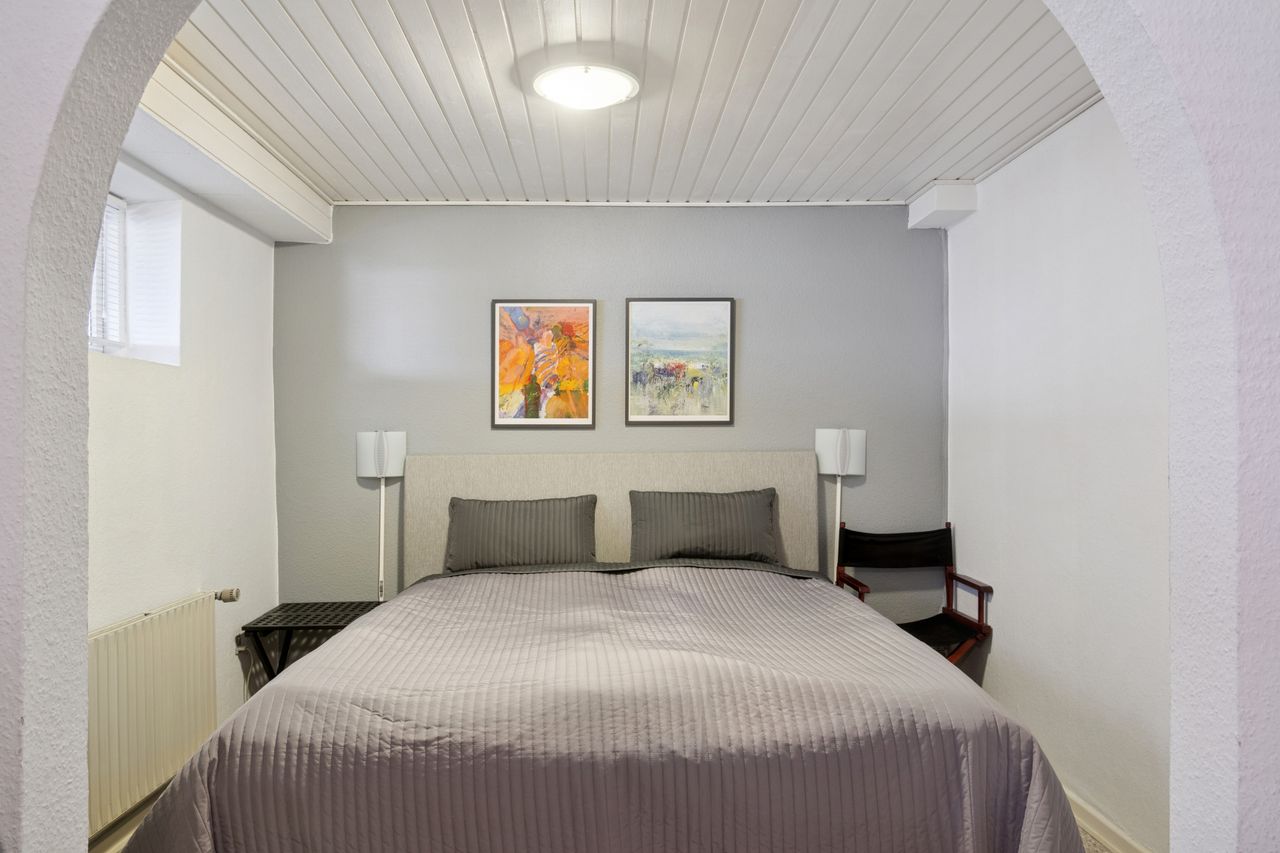 Stueetagen rummer desuden et pænt badeværelse med væghængt toilet og bruseniche, soveværelse med adgang til stort walk-in-closet (tidligere værelse), yderligere et værelse samt gæstetoilet. Planløsningen giver mulighed for nemt at etablere ét eller to ekstra værelser, hvis behovet opstår. For købere med mod på et lidt større projekt er der desuden mulighed for at etablere udgang fra soveværelset direkte til baghaven, hvilket giver oplagte rammer for en privat terrasse med morgensol mod øst.