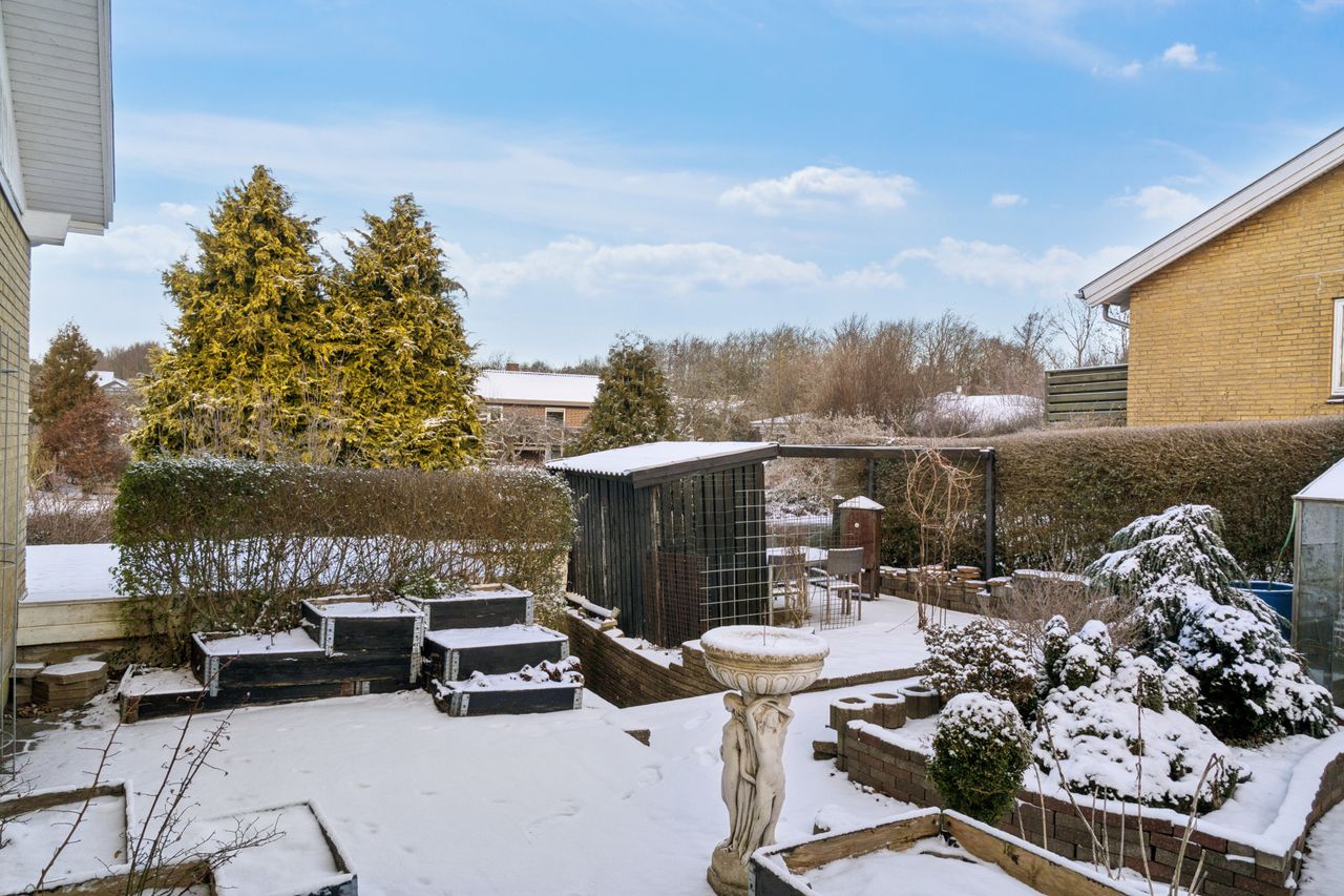 Ejendommen fuldendes af en velholdt have, hyggelige uderum samt den rummelige garage med værkstedsplads. Alt i alt en særdeles velholdt og rummelig villa i et attraktivt kvarter – med både funktionelle løsninger, masser af plads og spændende udviklingsmuligheder for den næste ejer.