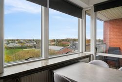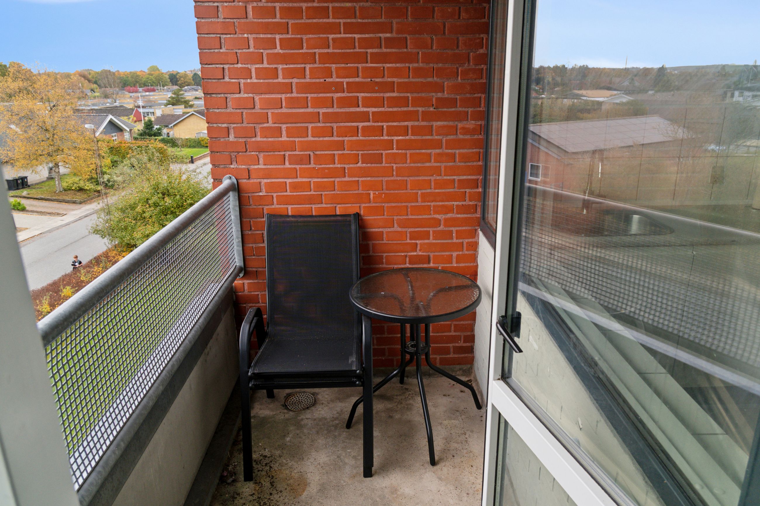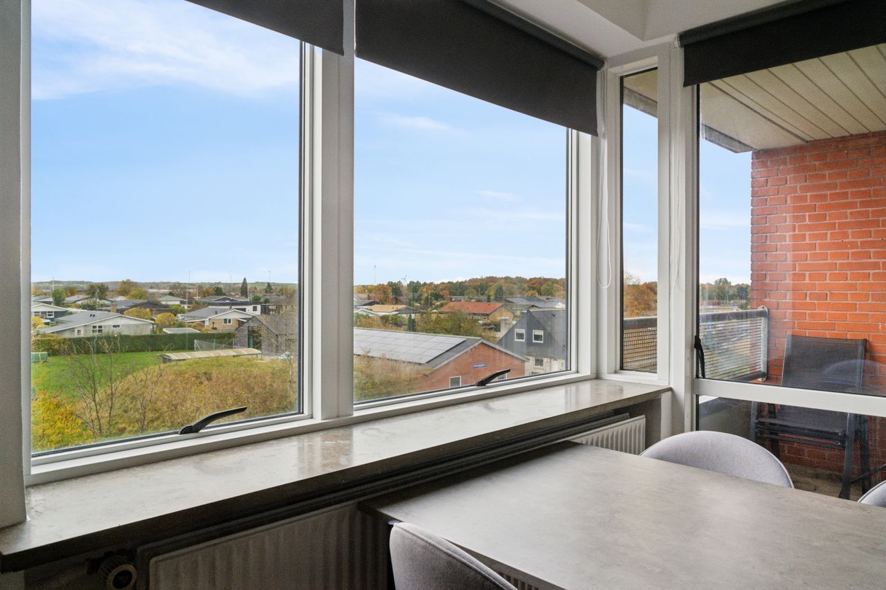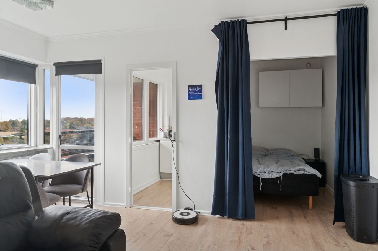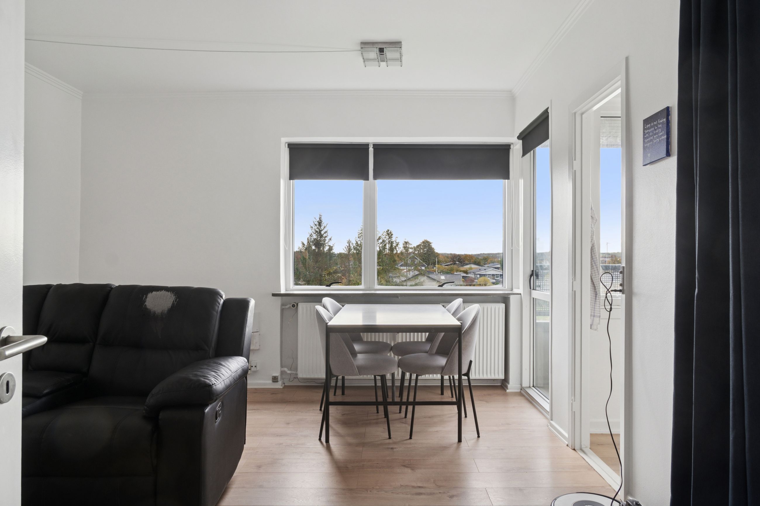 "SOLHØJ". Flot 1 1/2 vær. med udsigt, altan og elevator! BEMÆRK DE LAVE EJERUDGIFTER! Parker bilen på parkeringspladsen og tag elevatoren direkte op på øverste etage til denne flotte mindre lejlighed med altan og den skønneste udsigt. Her er bl.a. flotte nyere gulve, flot nyere køkken m.v. Lejligheden indeholder, entré, badeværelse med bruser, dejlig lys stue med den skønneste udsigt og udgang til den fine altan samt alkove med plads til sengen. Lejligheden har brugsret til gode fællesfaciliteter med fælles vaskeri, cykelrum, kælderrum m.v.