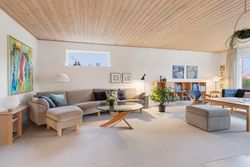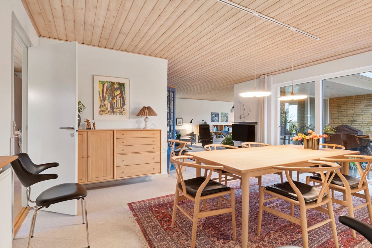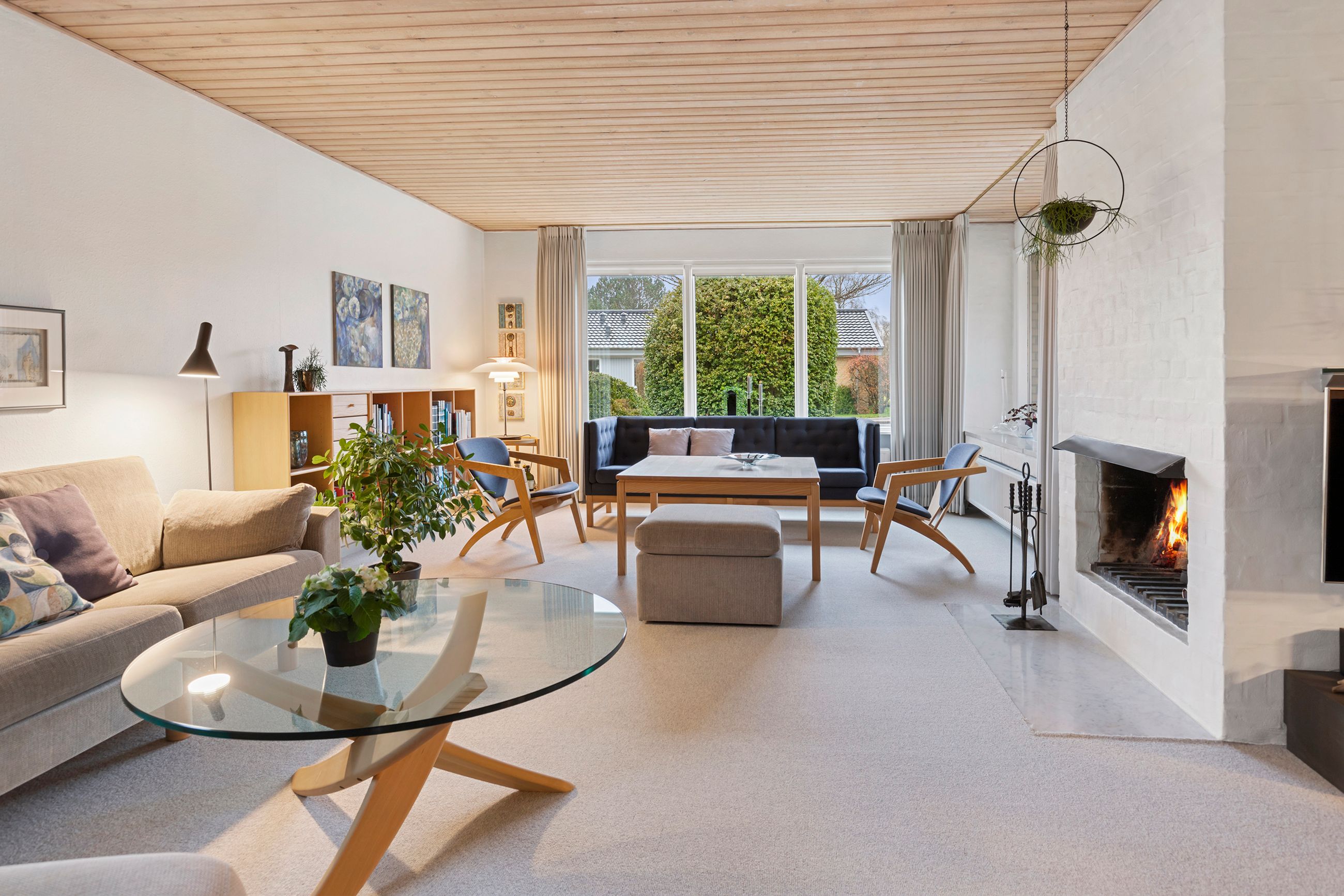 Stuen er i forlængelse af køkkenet, og her får du en virkelig stor og lys stue, som er naturligt opdelt i en sofaafdeling og en spisestue. I sofaafdelingen er der to store vinduespartier samt en hyggelig indbygget pejs. I spisestuen er der plads til det store spisebord, så du nemt kan samle familie og venner til fødselsdag eller en lækker middag. Her er der et stort gulv-til-loft vinduesparti samt udgang til den sydvendte terrasse.