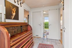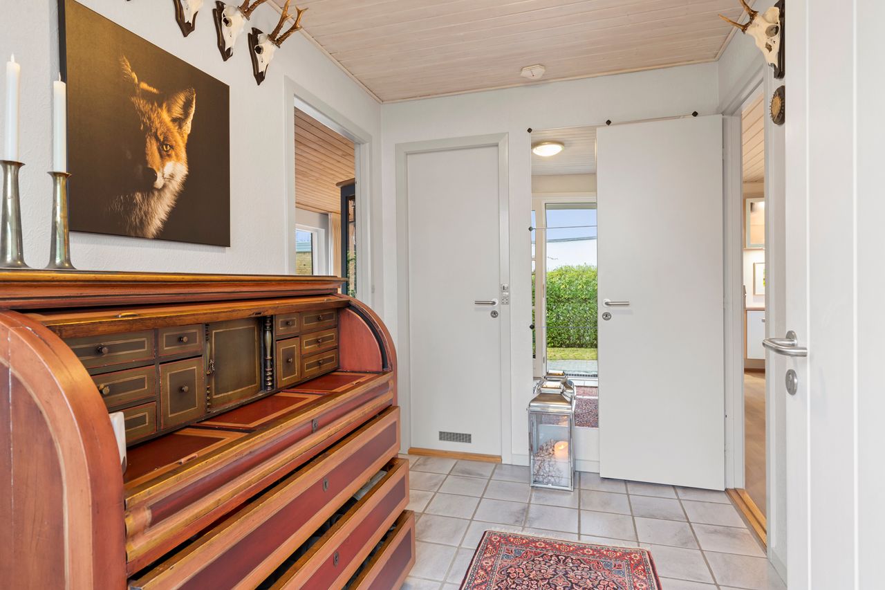 Fra indkørslen er der en fin flisebelagt sti, som fører hen mod boligen. Boligen har to indgange – en pæn gæsteentré og et praktisk bryggers.