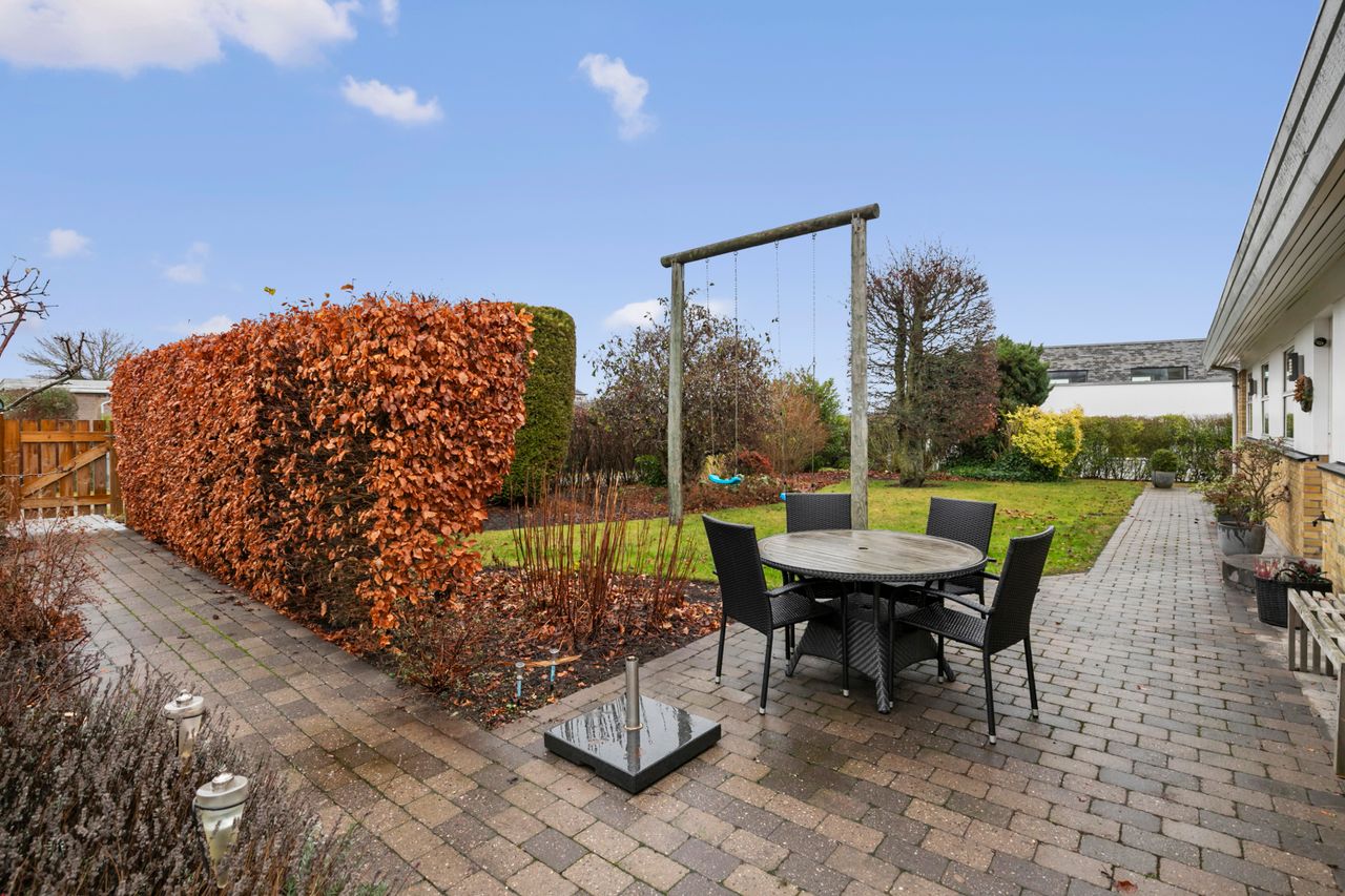 Haven er fuldstændigt lukket på bagsiden, og her er der et fint græsareal med plads til leg og et stort gyngestativ. Her er også en fin køkkenhave og en praktisk overdækning i forlængelse af garagen.