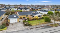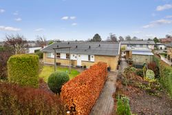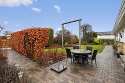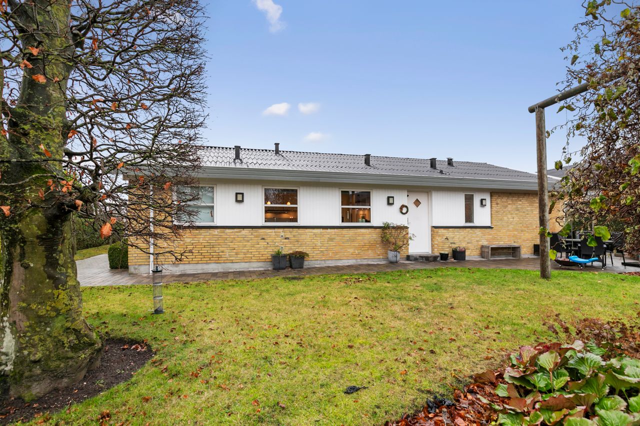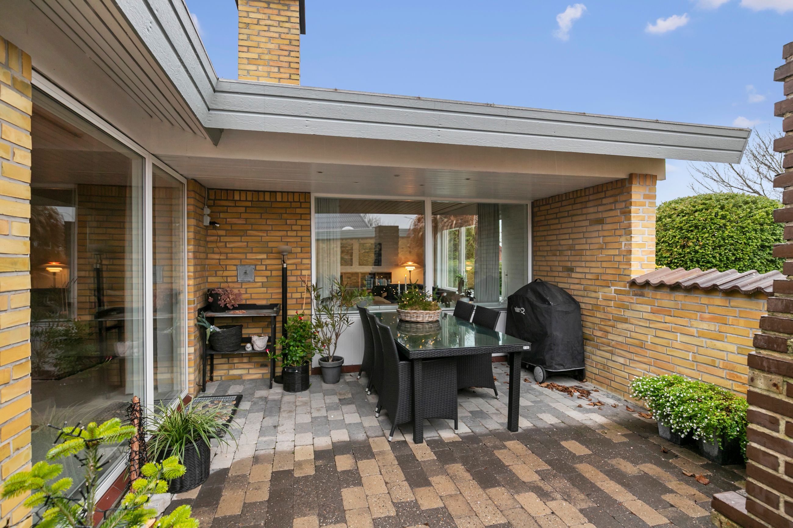 Boligen præsenteres flot med en enkel forhave. Her kan du parkere bilen i den 28 kvm garage eller på en af de to parkeringspladser i indkørslen foran garagen. Forhaven vender mod syd, og har en dejlig terrasse, der er delvist overdækket. Terrassen er fint skærmet af, så du kan sidde ugeneret.