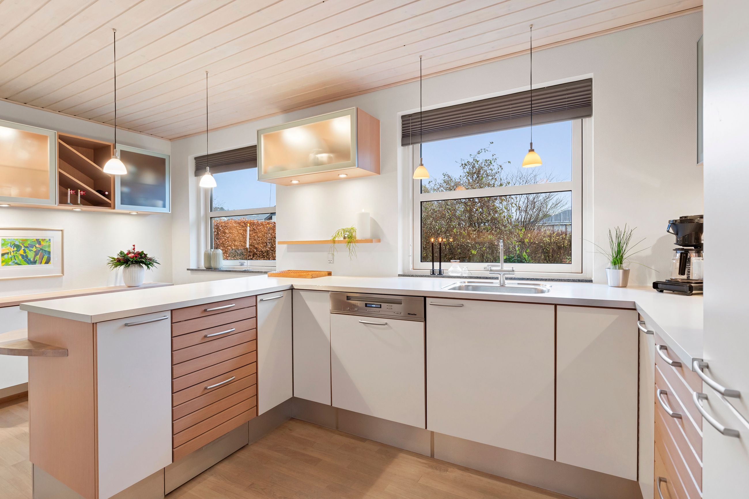 Boligen har et lyst og stilrent køkken fra Svane – sælger har virkelig passet godt på det, så det fremstår som nyt. Her er virkelig mange skabe og skuffer, godt med bordplads og en fin spiseplads.