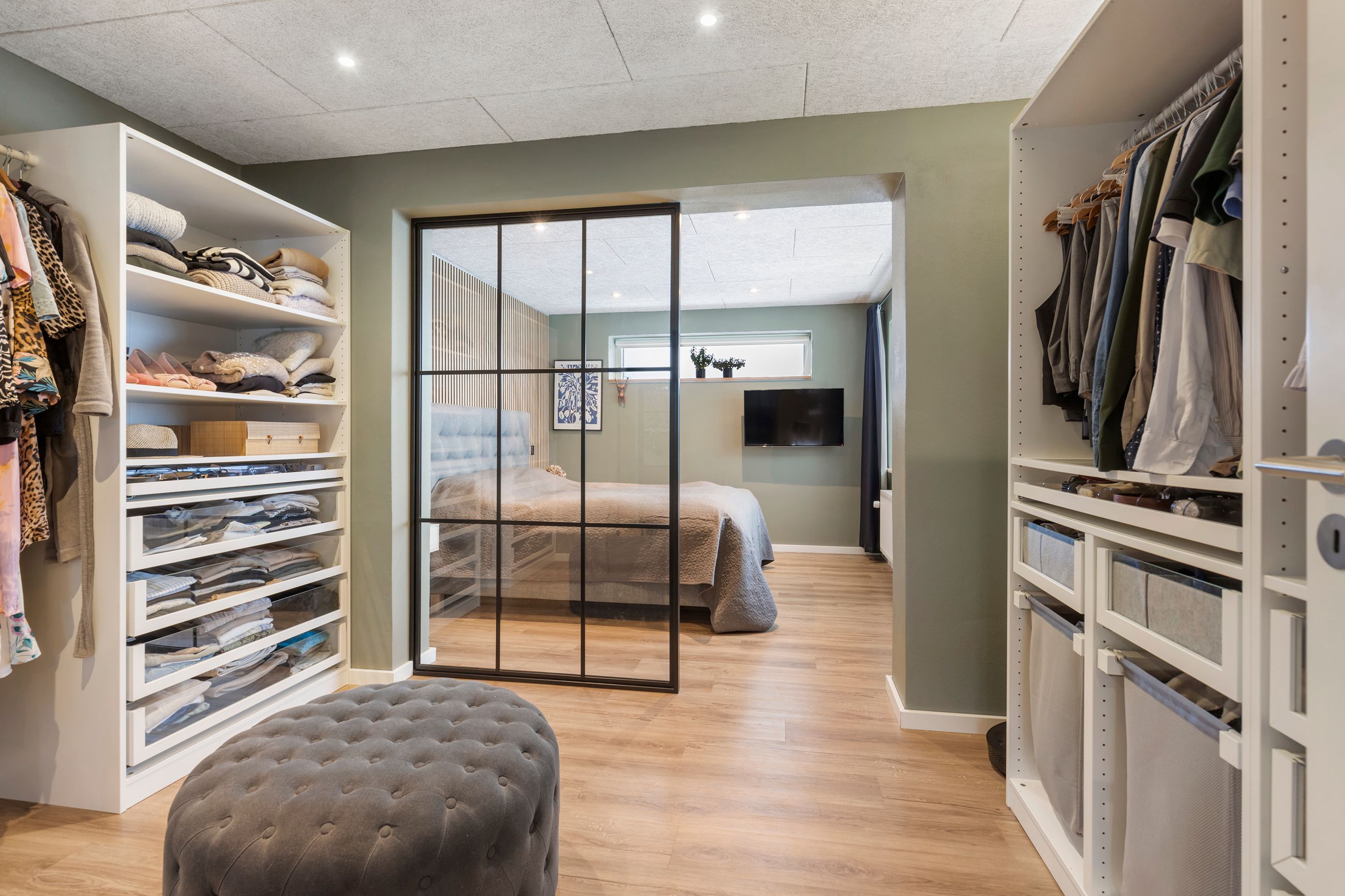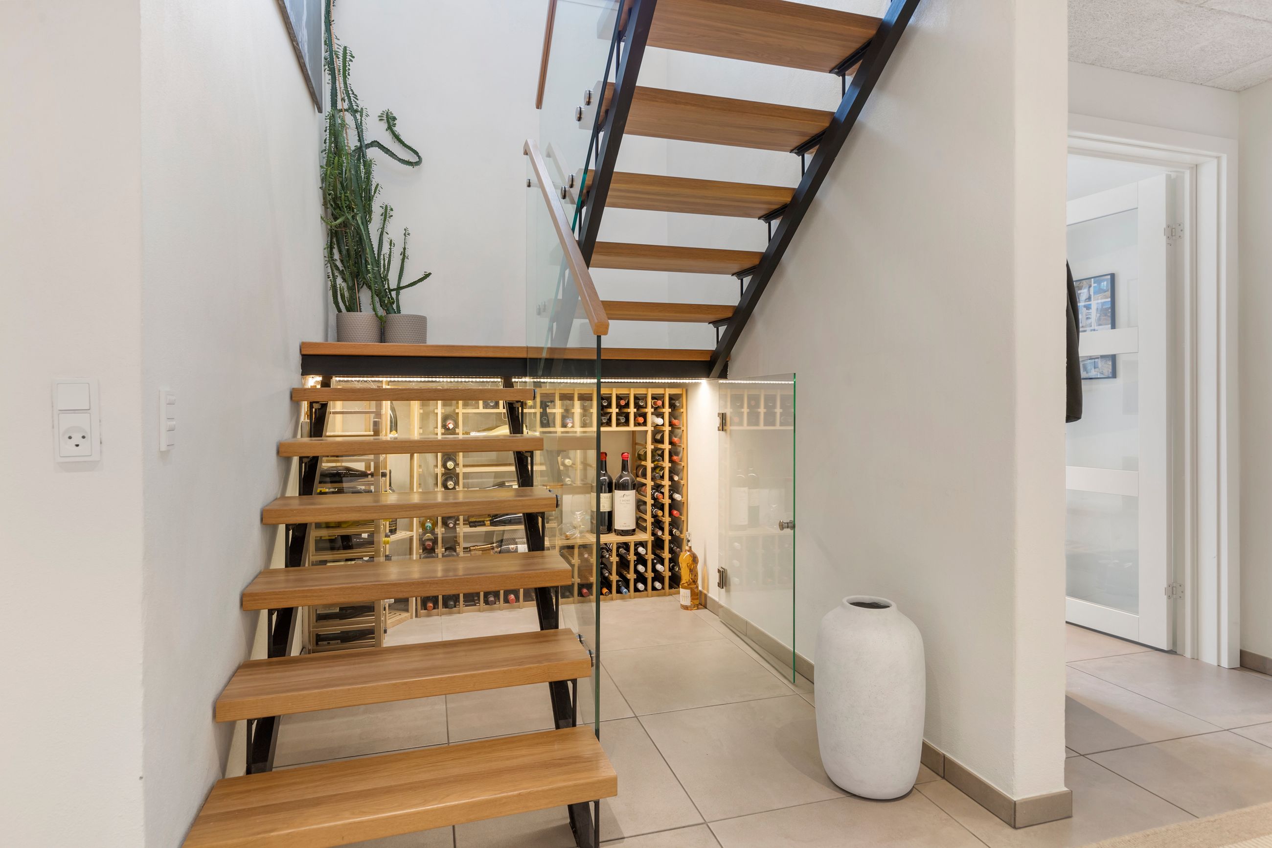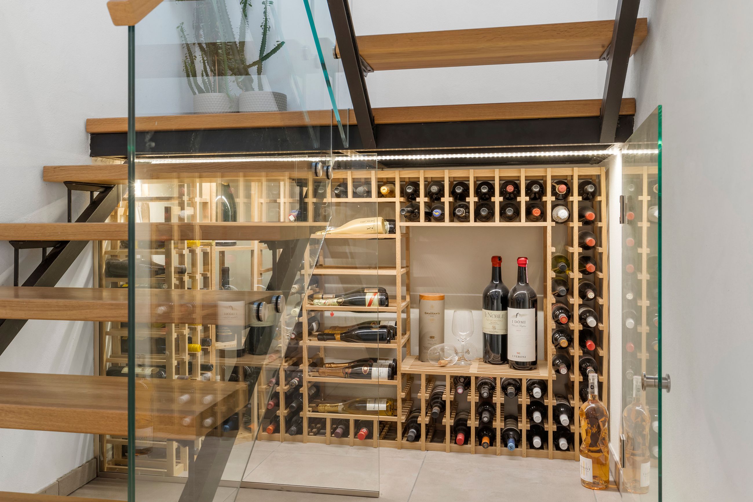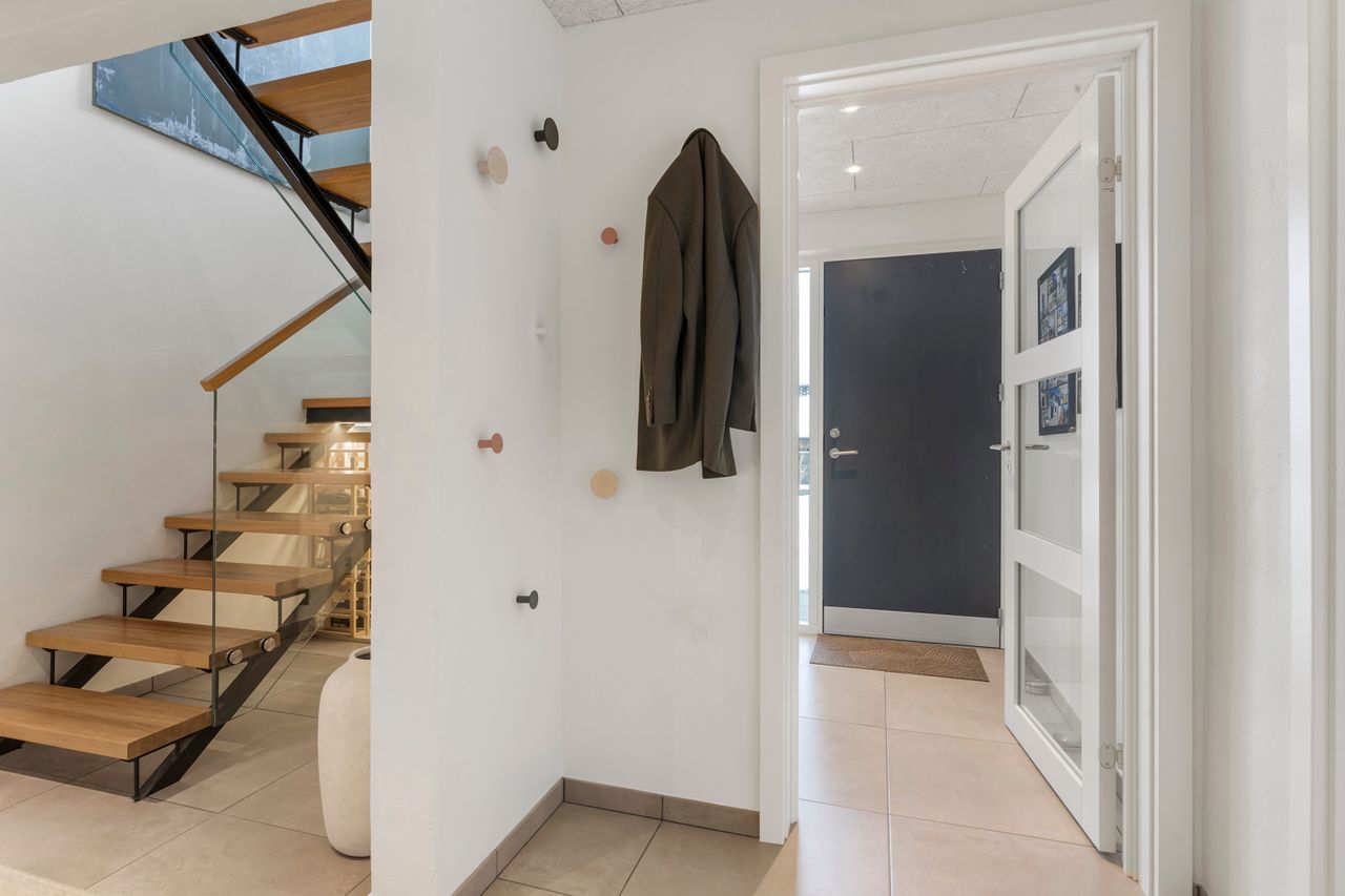 Etagerne bindes flot sammen af en elegant trappe fra Wood Step, og under den er lavet et lækkert vinrum, hvor vinelskeren kan slå sig løs med indretningen.