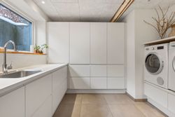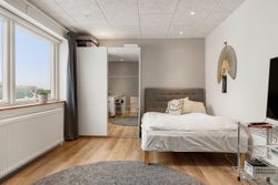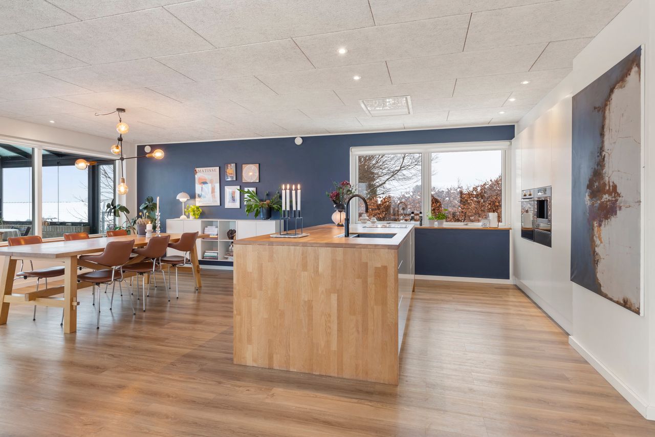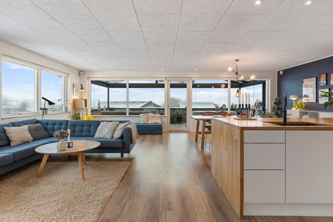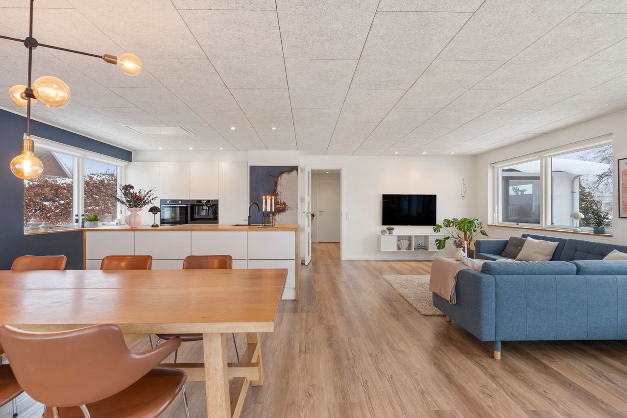 Her får I en helt særlig rumfornemmelse og en udsigt, der ændrer karakter med årstiderne, fra morgensol over byens tage til stemningsfulde aftener med solnedgangen i horisonten. Det er en udsigt, man sjældent finder og som giver boligen en eksklusiv fornemmelse. Rummet indbyder til både hverdagsliv og gæster med god plads til spiseafdeling og sofahjørne i naturlig sammenhæng med køkkenet - husets naturlige samlingspunkt. Det lækre køkken er fra Designa.