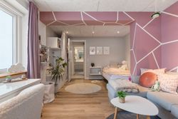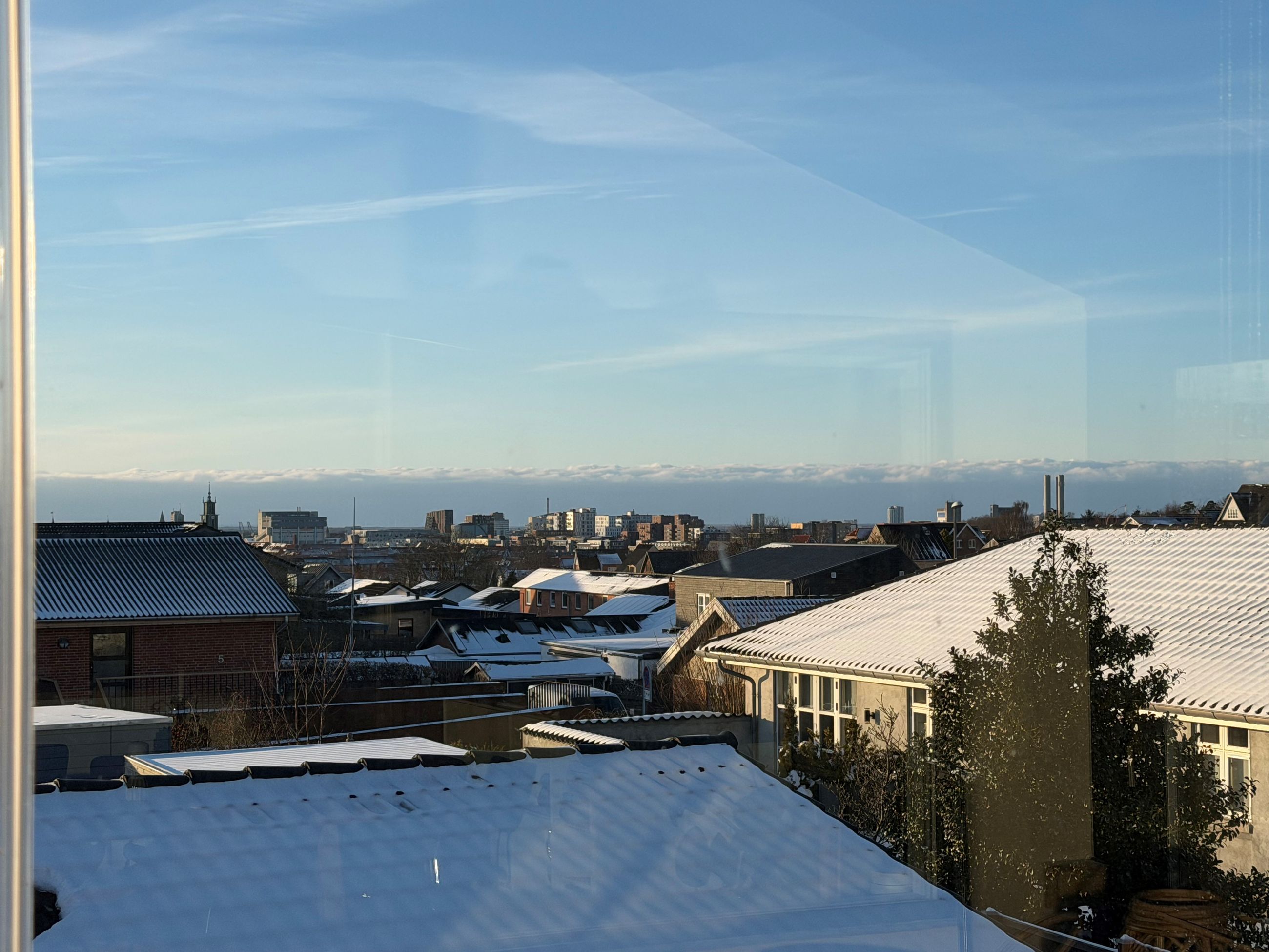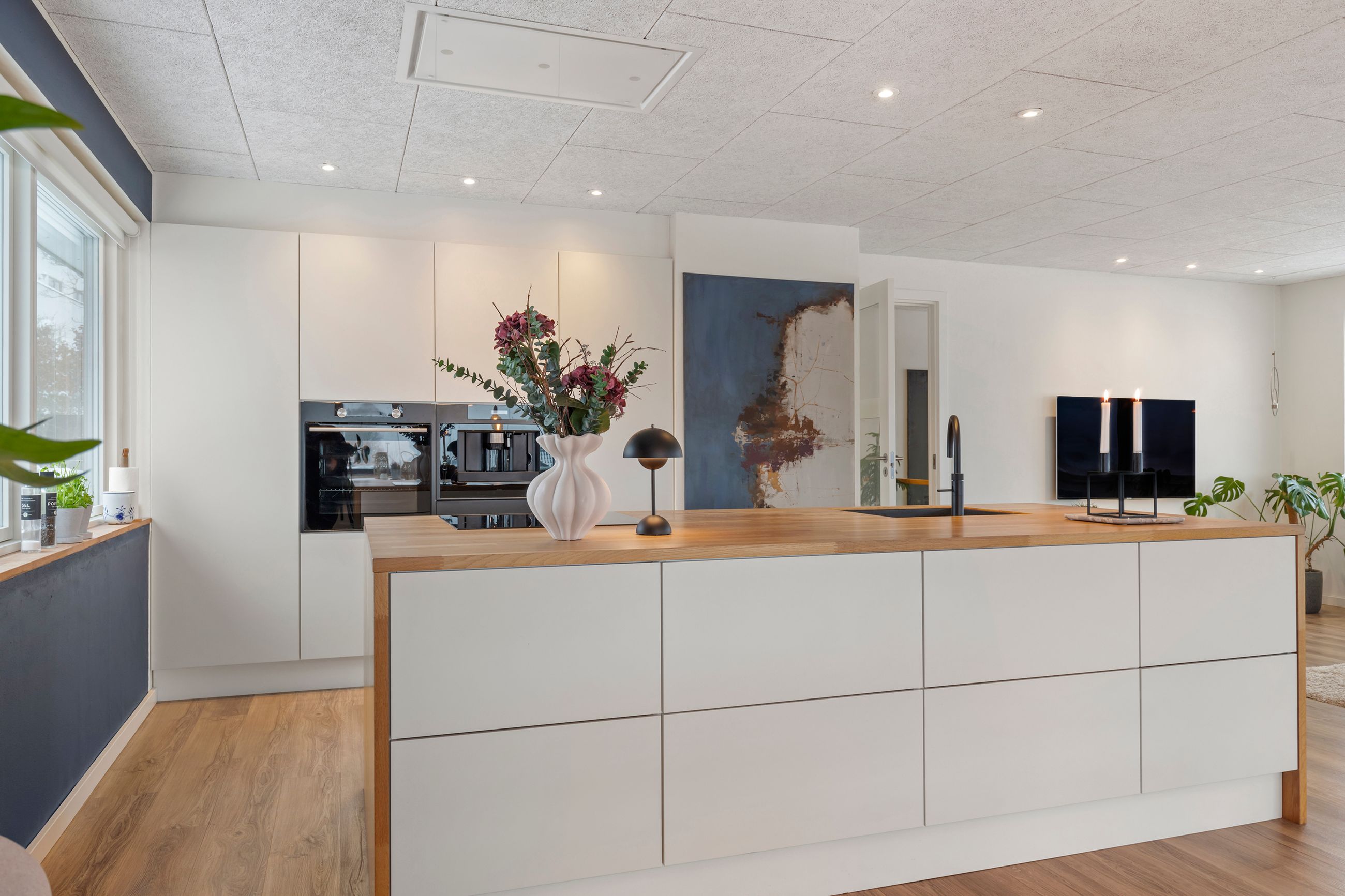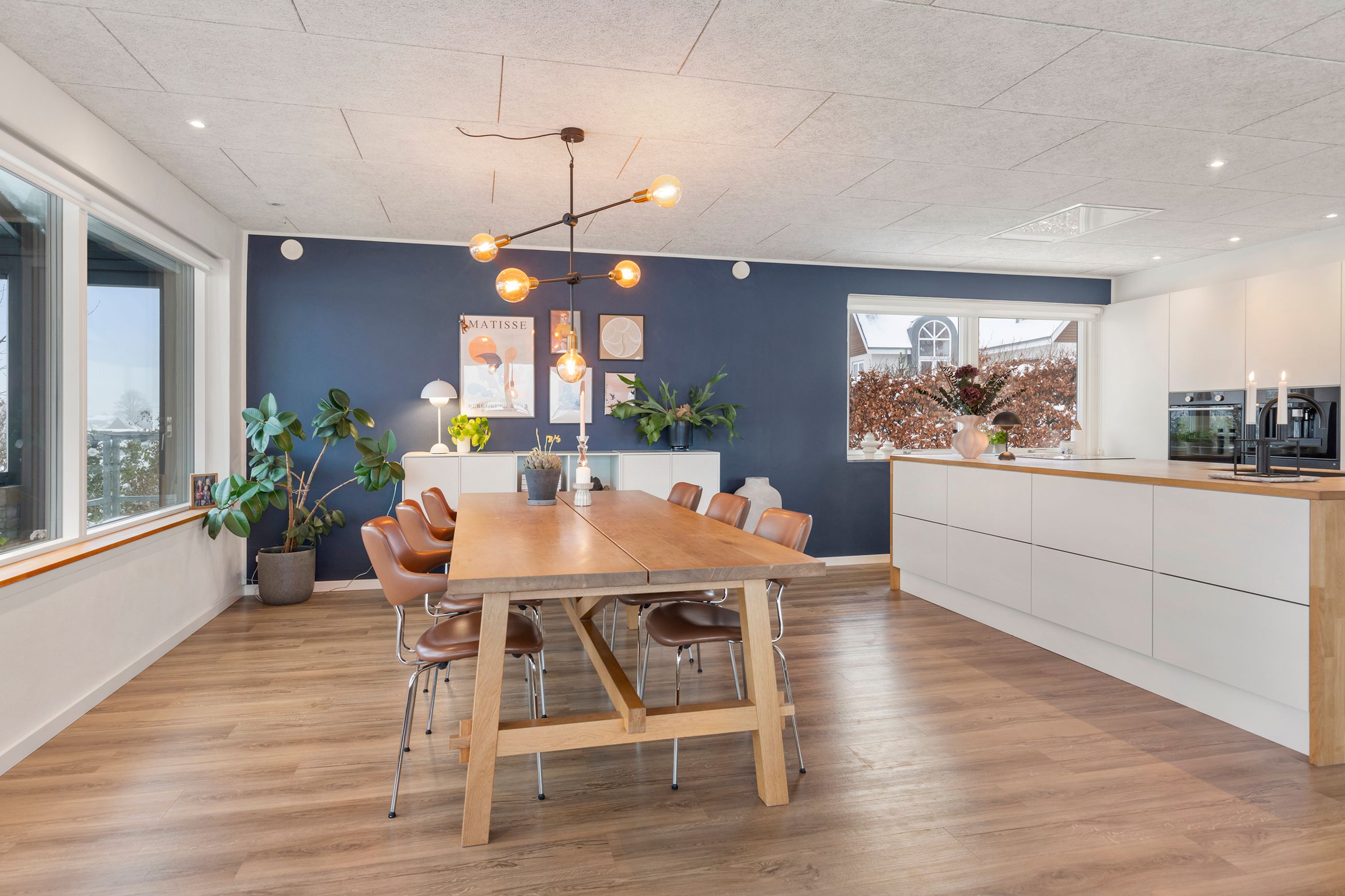 Her får I en helt særlig rumfornemmelse og en udsigt, der ændrer karakter med årstiderne, fra morgensol over byens tage til stemningsfulde aftener med solnedgangen i horisonten. Det er en udsigt, man sjældent finder og som giver boligen en eksklusiv fornemmelse. Rummet indbyder til både hverdagsliv og gæster med god plads til spiseafdeling og sofahjørne i naturlig sammenhæng med køkkenet - husets naturlige samlingspunkt. Det lækre køkken er fra Designa.