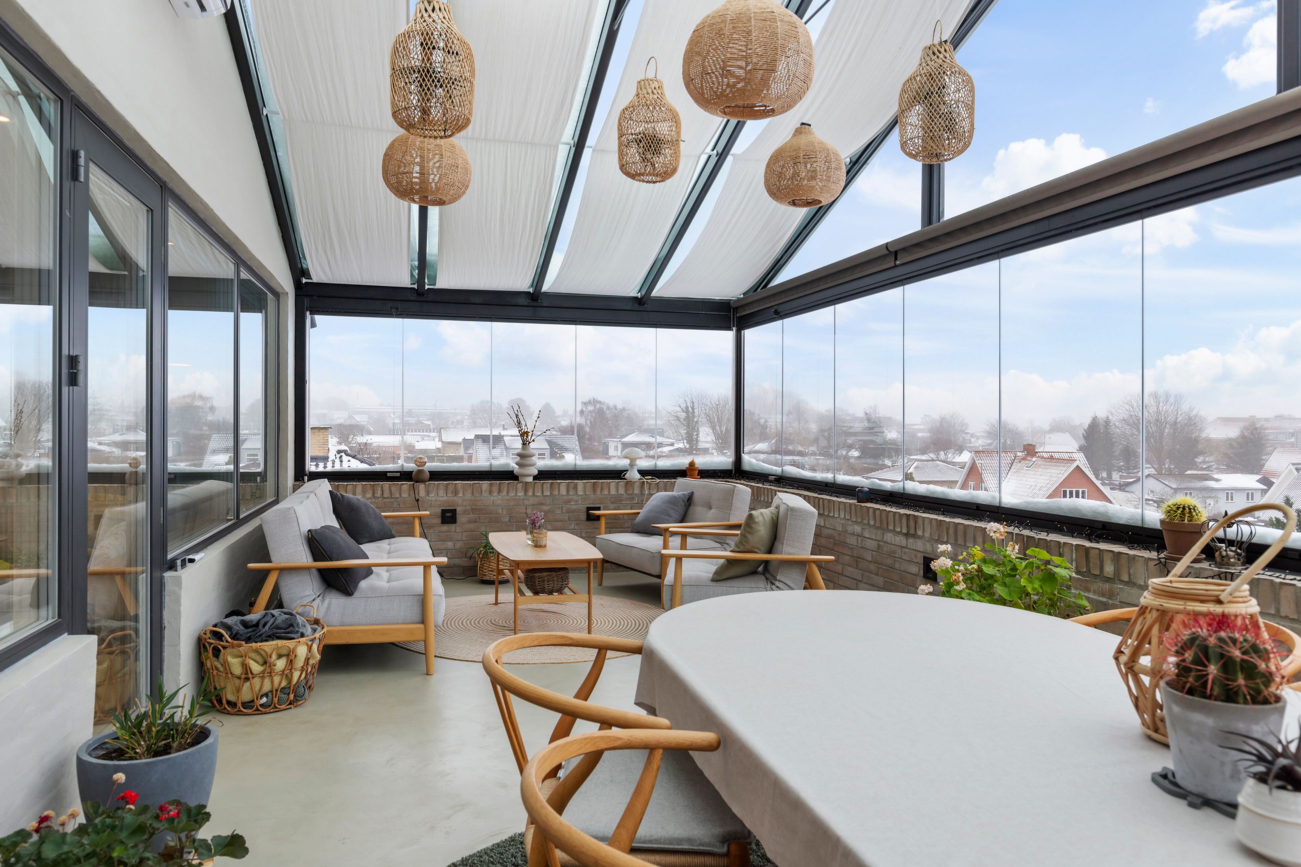 Det tilstødende orangeri på forlænger udesæsonen markant og skaber et fantastisk lysindfald. Her får I et ekstra opholdsrum, som kan nydes store dele af året og som binder inde- og udeliv smukt sammen. Vinduerne kan på alle tre sider foldes helt til siden, så man kan tilpasse rummet efter vind og vejr.