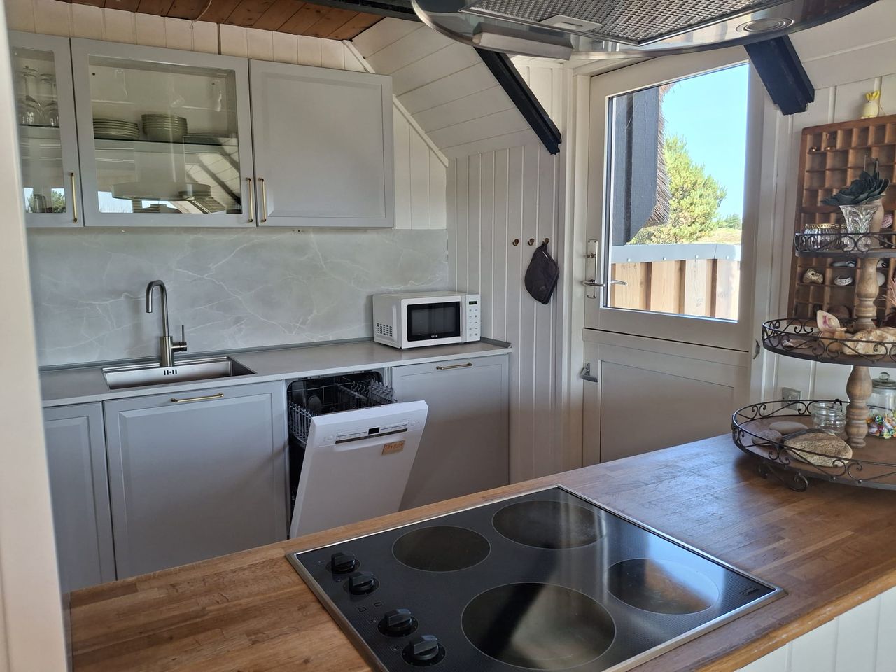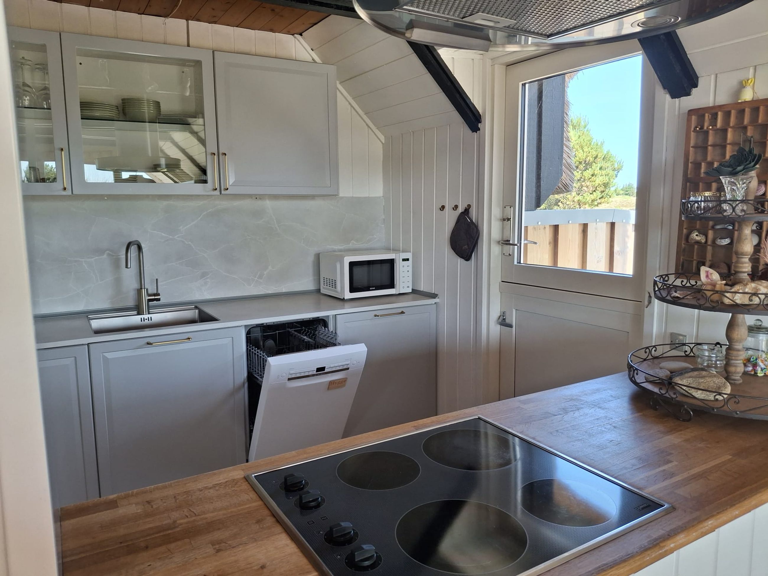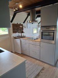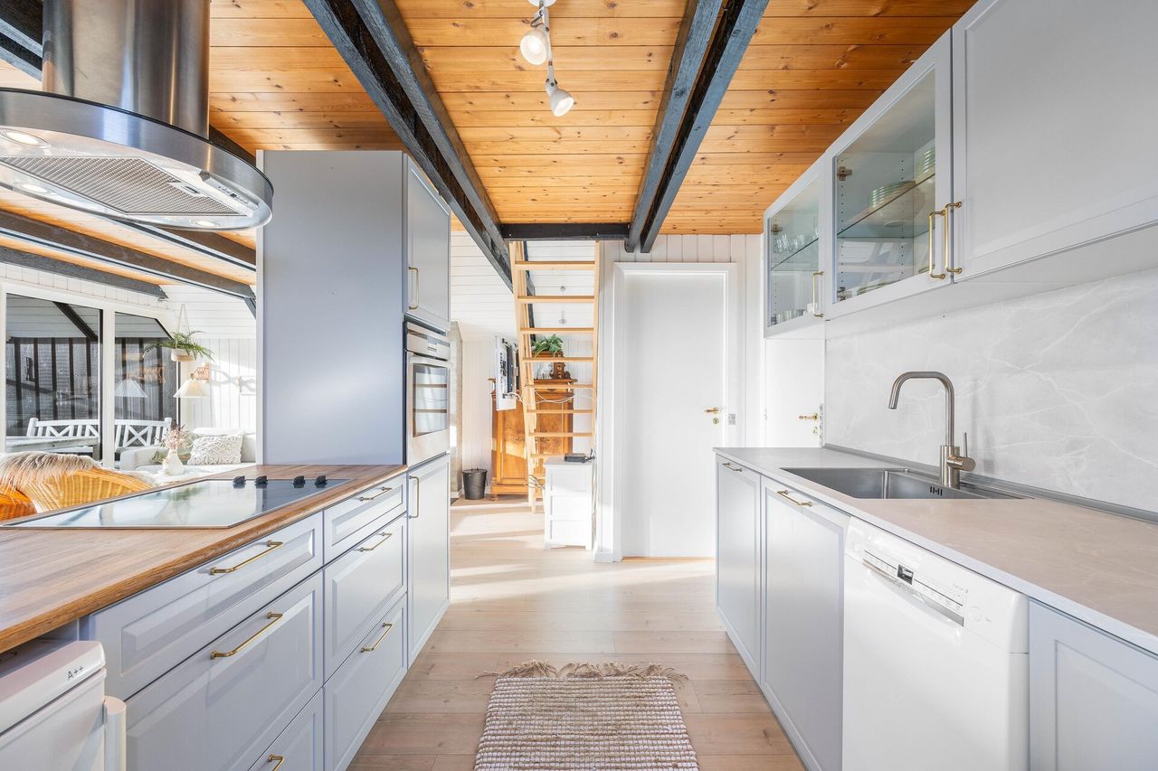 Pænt todelt køkken, hvor elementerne er holdt i rolige, grålige nuancer. Der er indbygningsovn, keramiske kogeplader, køleskab samt en lille opvaskemaskine.