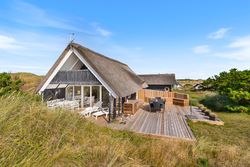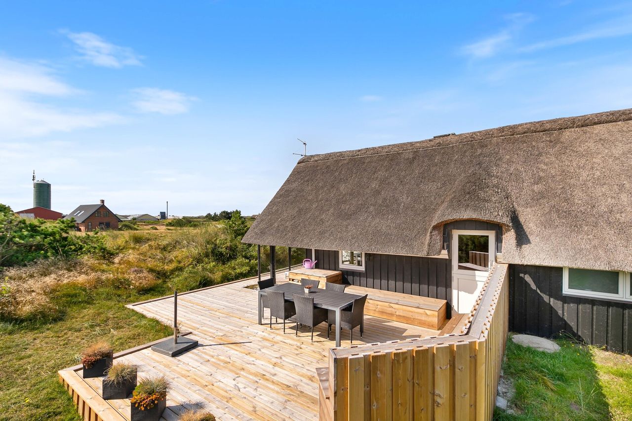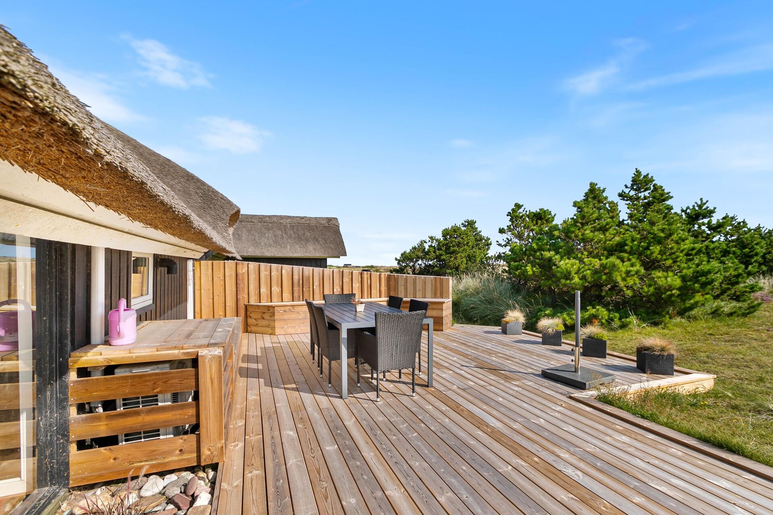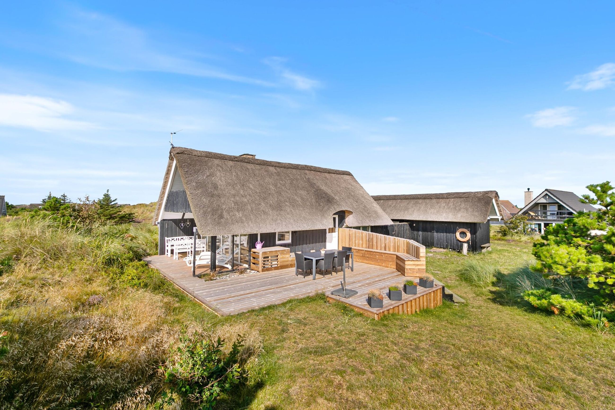 På en stor og marehalmsklædt naturgrund i det nordlige Bjerregård tilbydes det skønne, romantiske og meget fine sommerhus. Huset er opført i træ med stråtag med kvist og andre smukke detaljer, og indledningsvis bør man fremhæve den meget skønne øst- og sydvendte træterrasse, som fint binder hus, udbygning og grund sammen og virkelig er med til at skabe miljø. Til ejendommen hører en stor, formentlig tidligere garagebygning, der i dag er delt op i et udhus og i et afdeling med værksted samt mulighed for at lave et par ekstra opredninger, når det kniber.