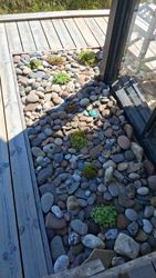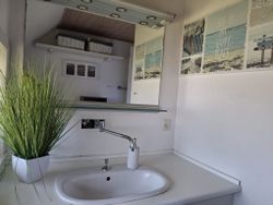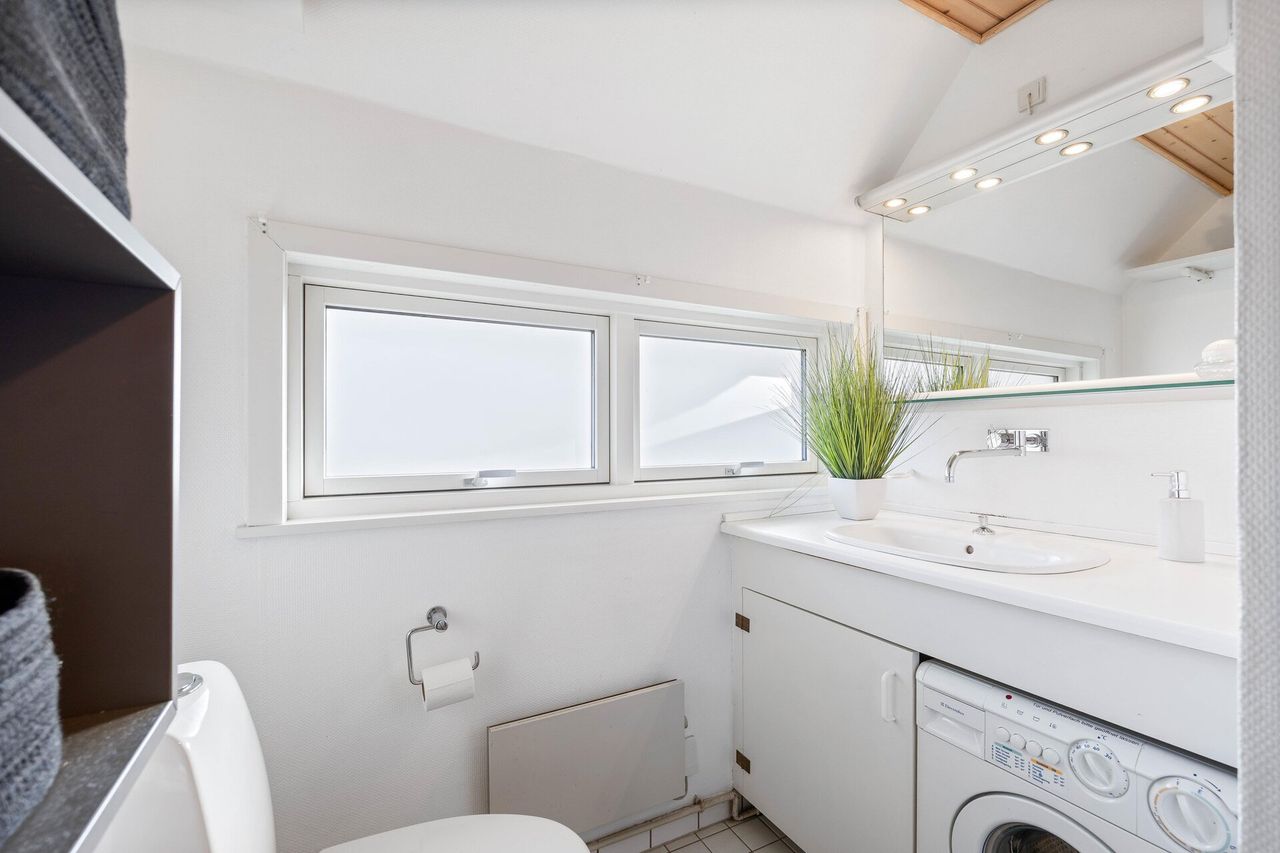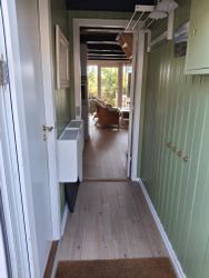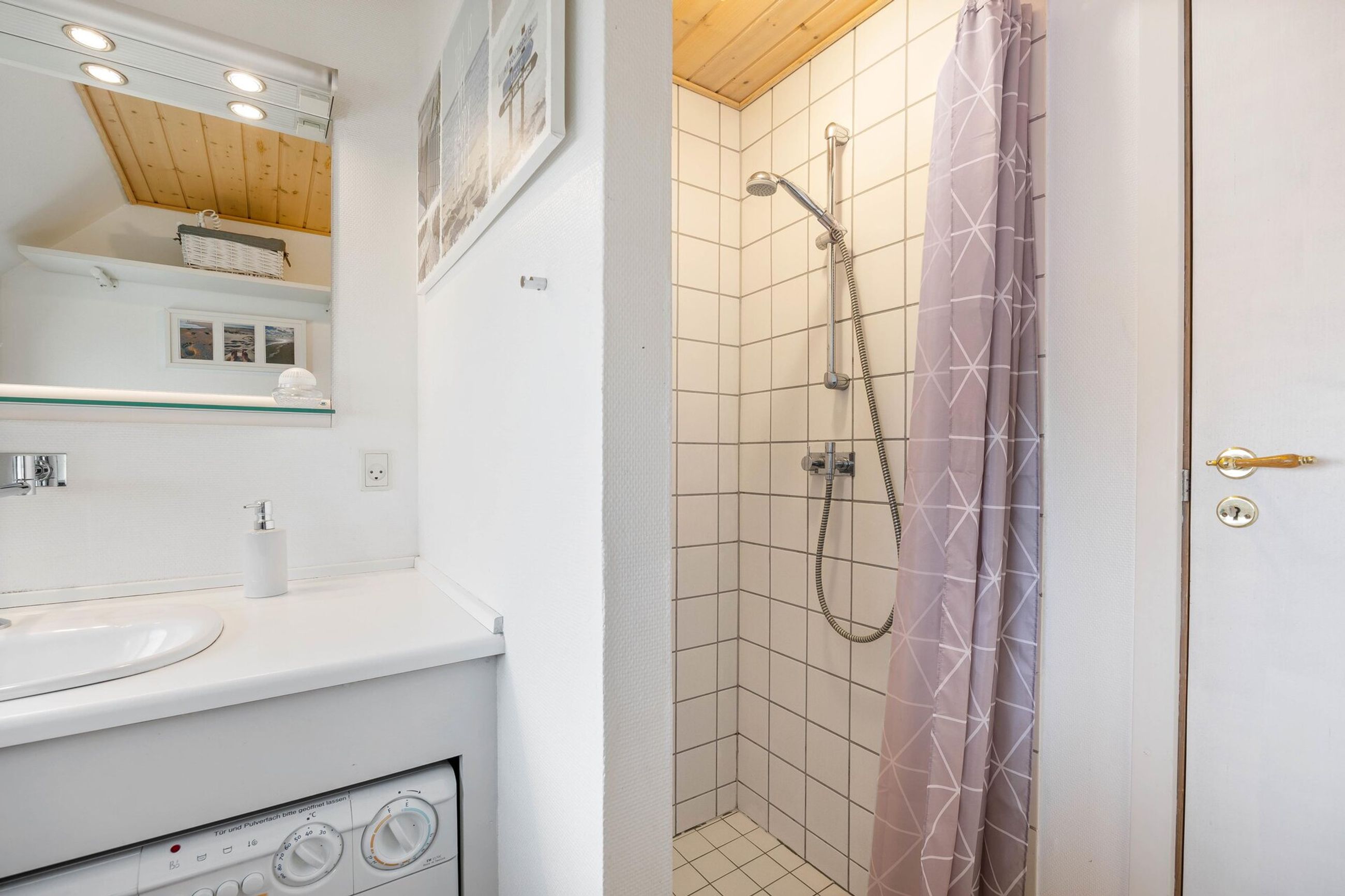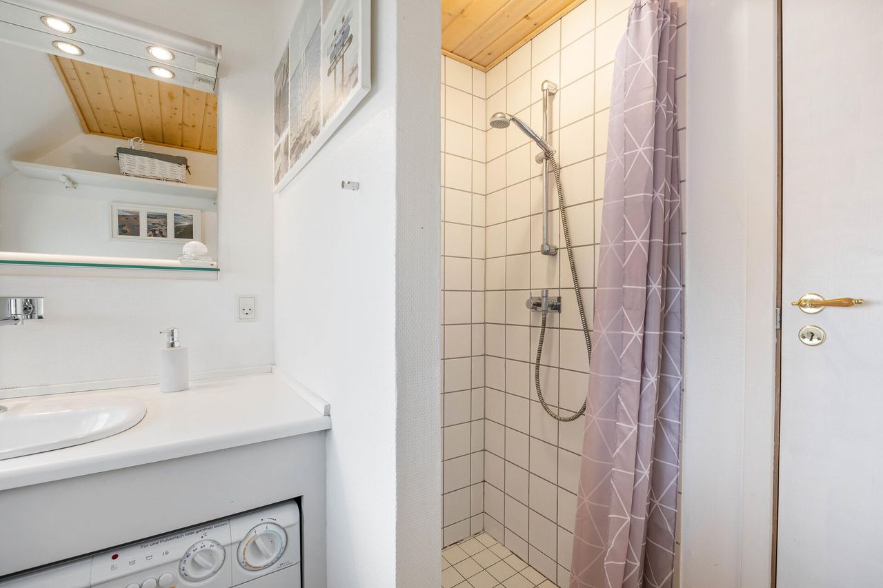 Selve sommerhuset har fra nordvendt terrasseparti adgang til entré med smukke, male marehalmsgrønne brædder. Derfra adgang til pænt badeværelse med bruseniche, toilet samt skabsarrangement med nedfældet håndvask.