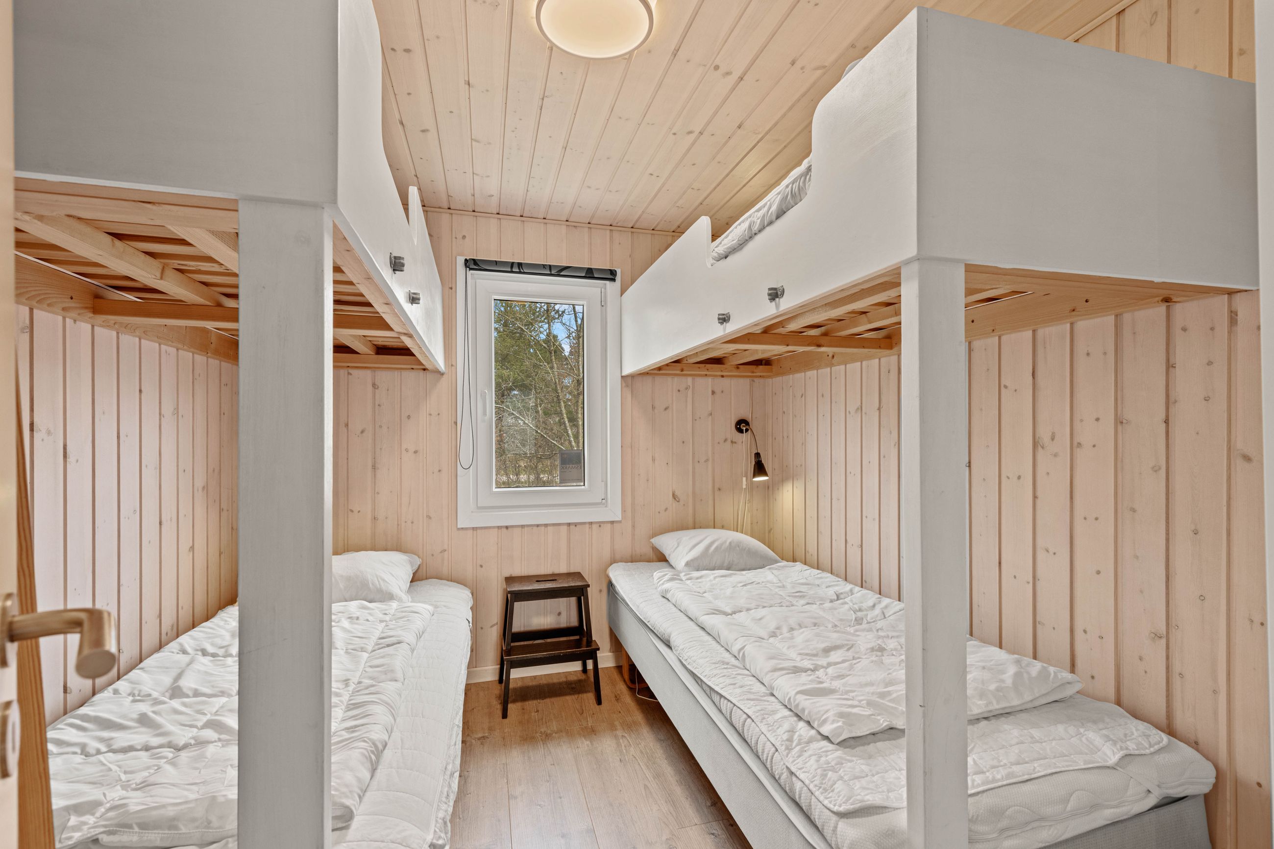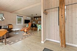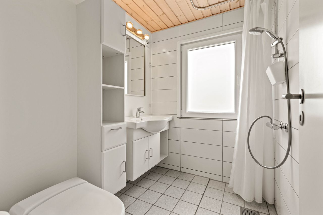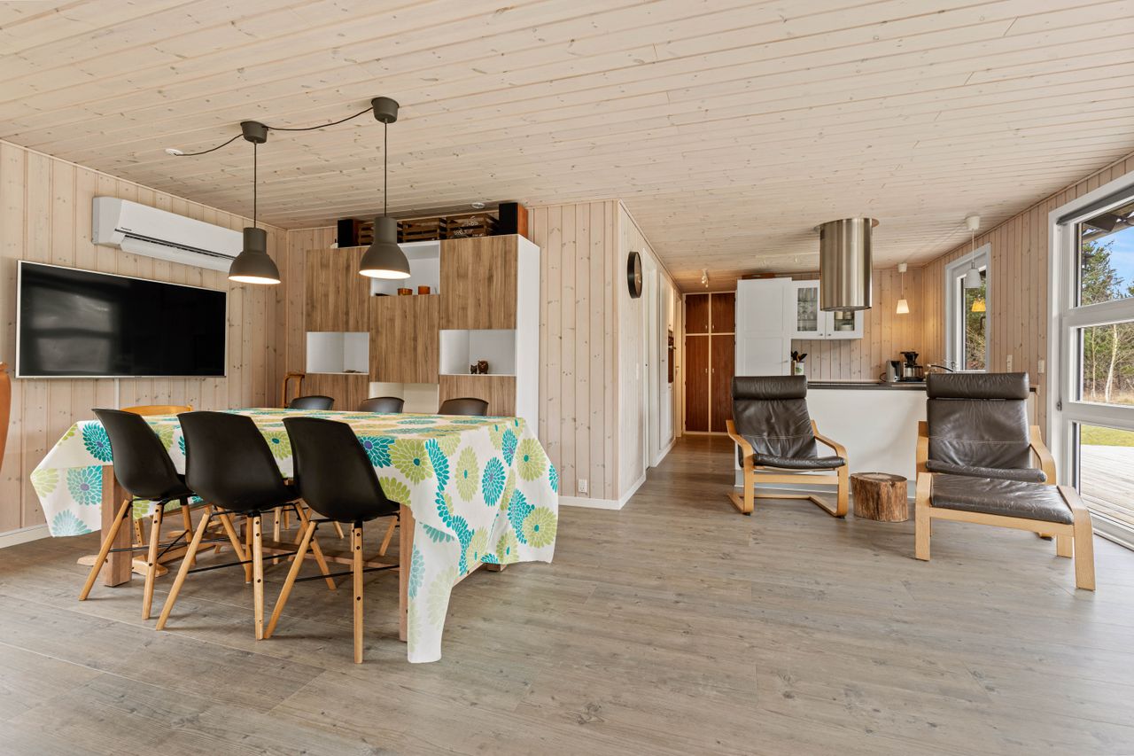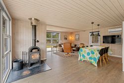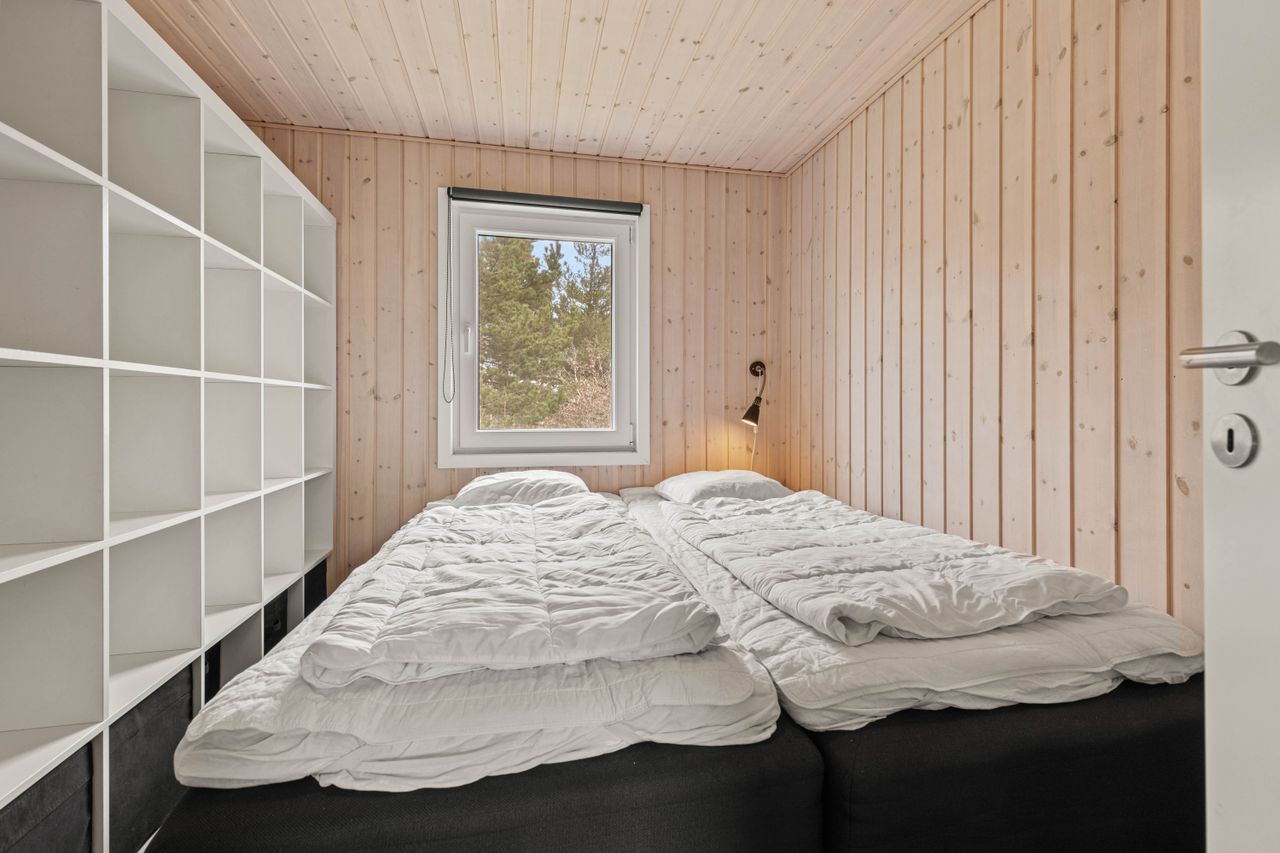 Huset er indrettet med en dejlig entré, stue med spiseplads samt opholdsafdeling med brændeovn. Delvist adskilt køkken, der er holdt i hvide elementer. Pænt badeværelse med skabsarrangement med spejl samt bruseafdeling. Køjerum med fire sovepladser. Soveværelse med dobbeltseng.